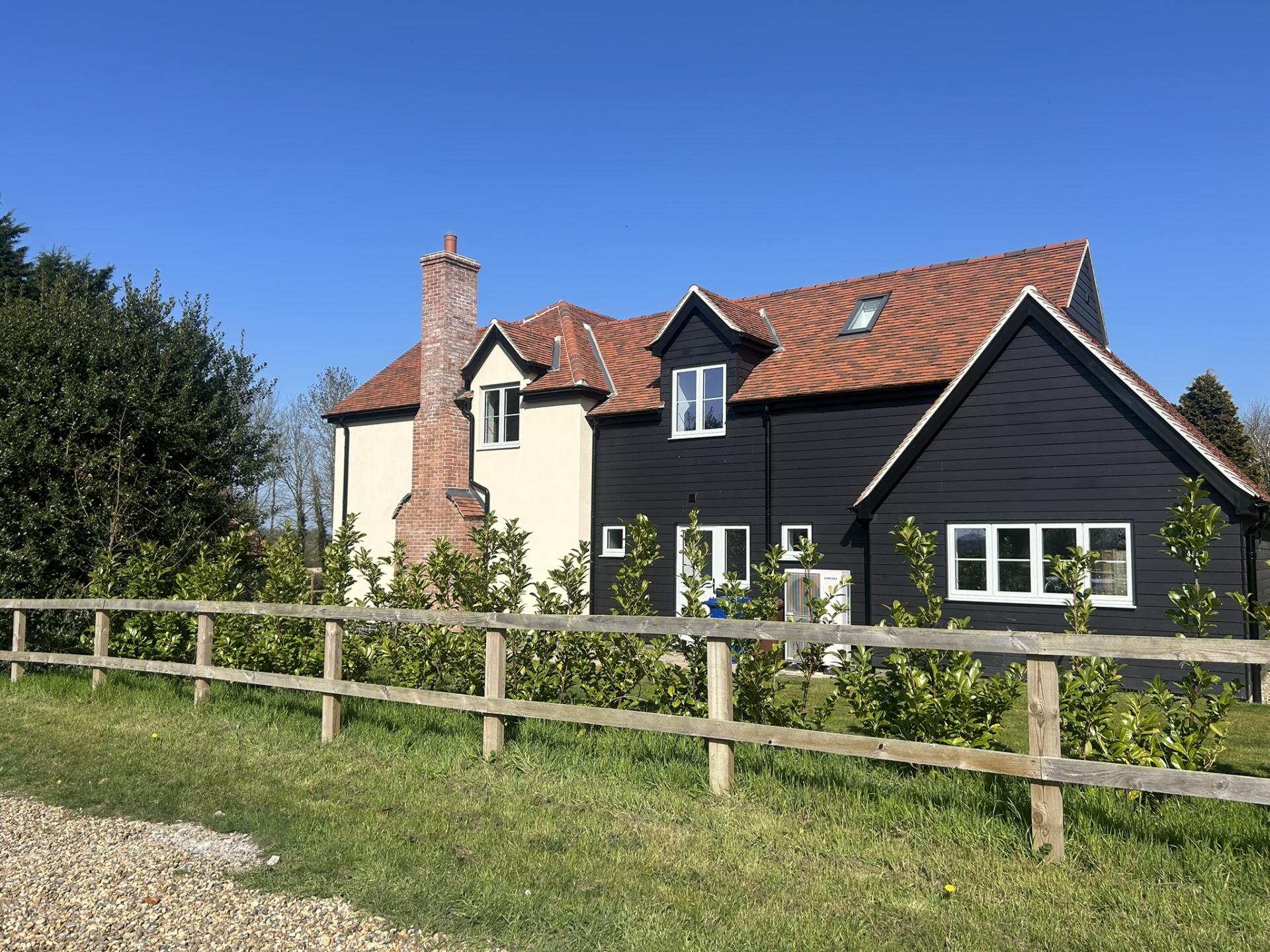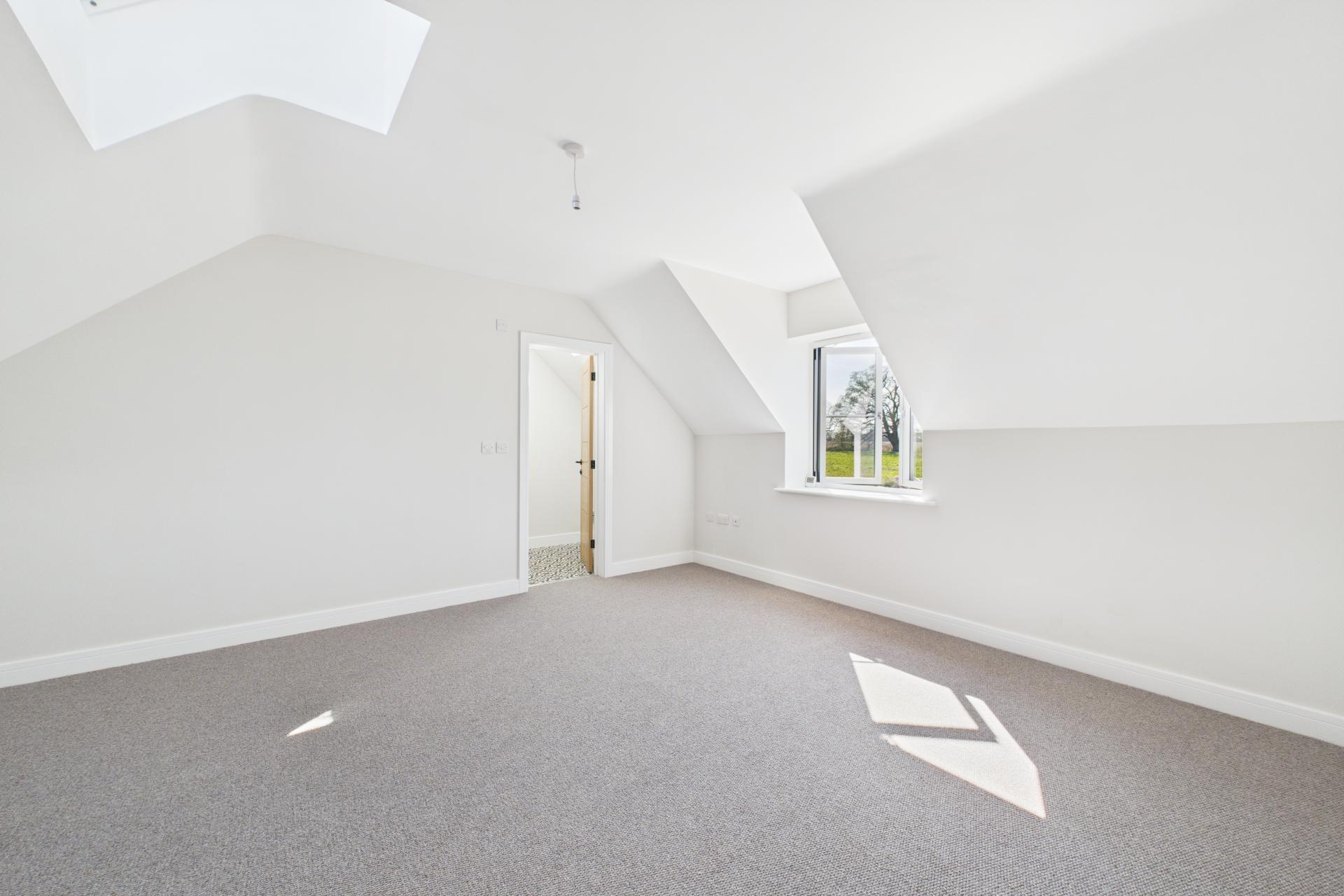 Upstairs, a spacious landing with Velux windows fills the space with natural light. The principal bedroom is a generous double, complete with a walk-in wardrobe and a sleek ensuite featuring a walk-in shower, WC, and vanity sink unit. Opposite lies bedroom three, another comfortable double with views over the front of the property. The stylish family bathroom offers a luxurious freestanding bath, walk-in shower, vanity sink, and WC. Bedroom four overlooks the paddock and the side garden, while bedroom two is another spacious retreat with a Velux window, countryside views, and its own ensuite with a walk-in shower, vanity unit, and WC.