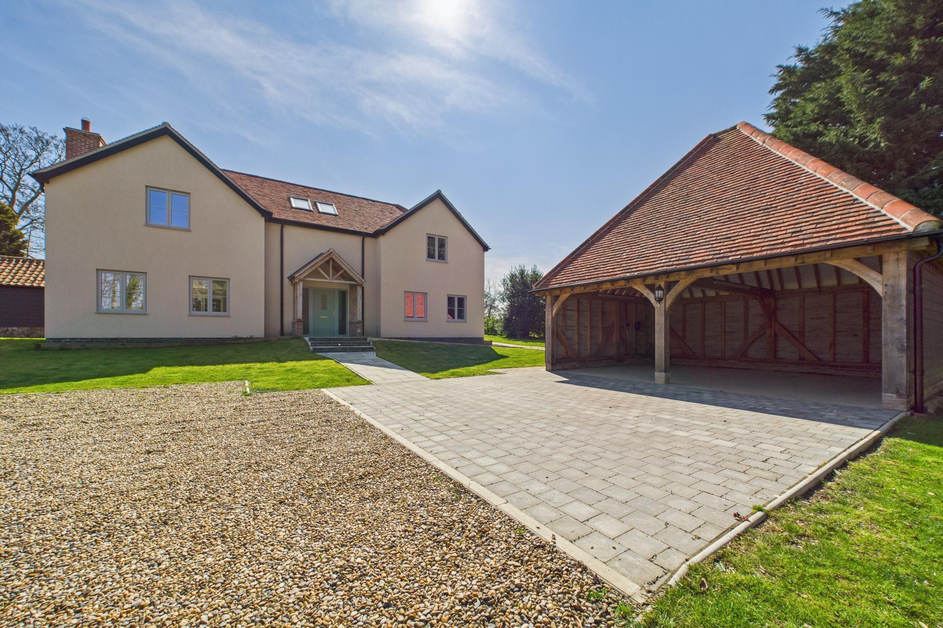 STEP OUTSIDE The property is approached via a sweeping gravel driveway, offering an impressive sense of arrival. This leads to a double cart lodge, complete with light, power, and an EV charging point. The beautifully maintained gardens wrap around the entire home, providing a peaceful and private setting. To the rear, a generous patio area offers the ideal space for alfresco dining and outdoor entertaining, while the remainder of the garden is laid mainly to lawn, interspersed with mature trees and shrubs that enhance both the privacy and the tranquil ambiance. A brick-built storage shed provides useful additional space for gardening tools or equipment.