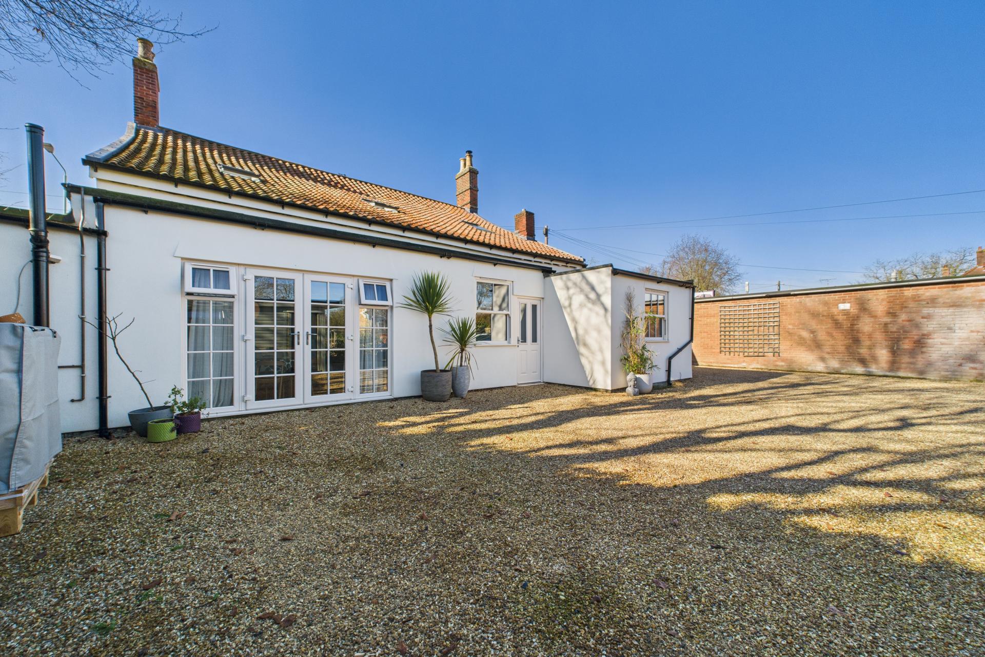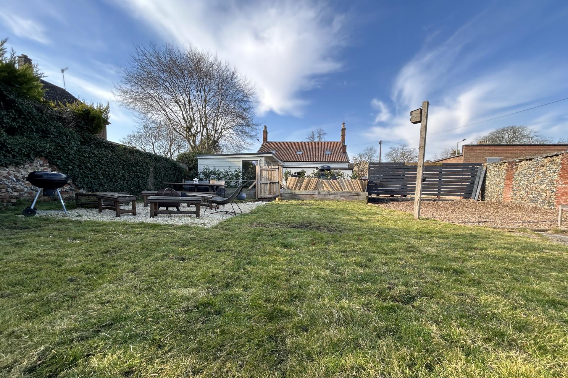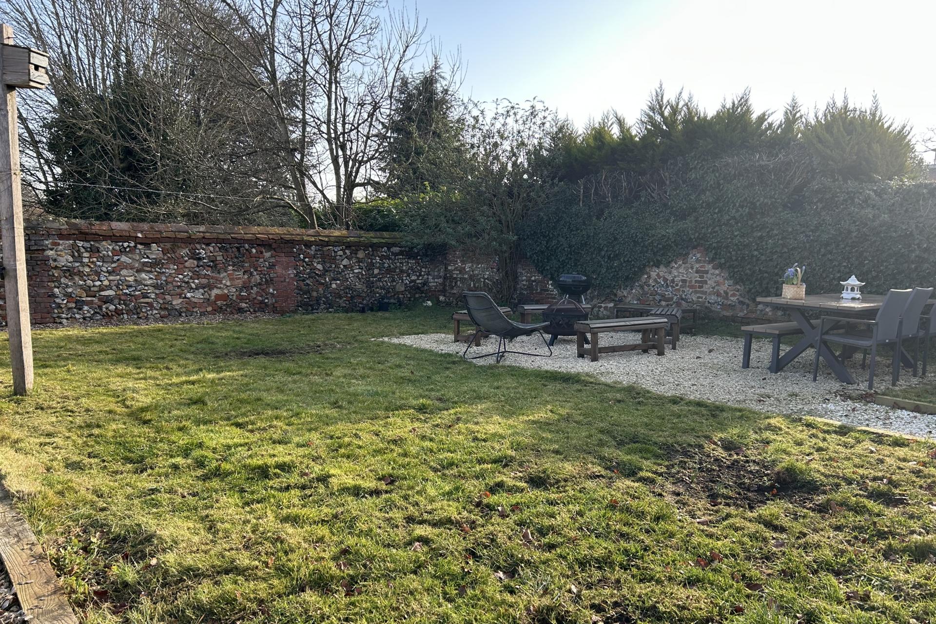 The garden is a charming flint-walled area, with a gravelled path leading to a cosy seating spot, perfect for relaxing or entertaining. The space features both grass and wood chipping areas, creating a low maintenance yet beautifully outdoor area.