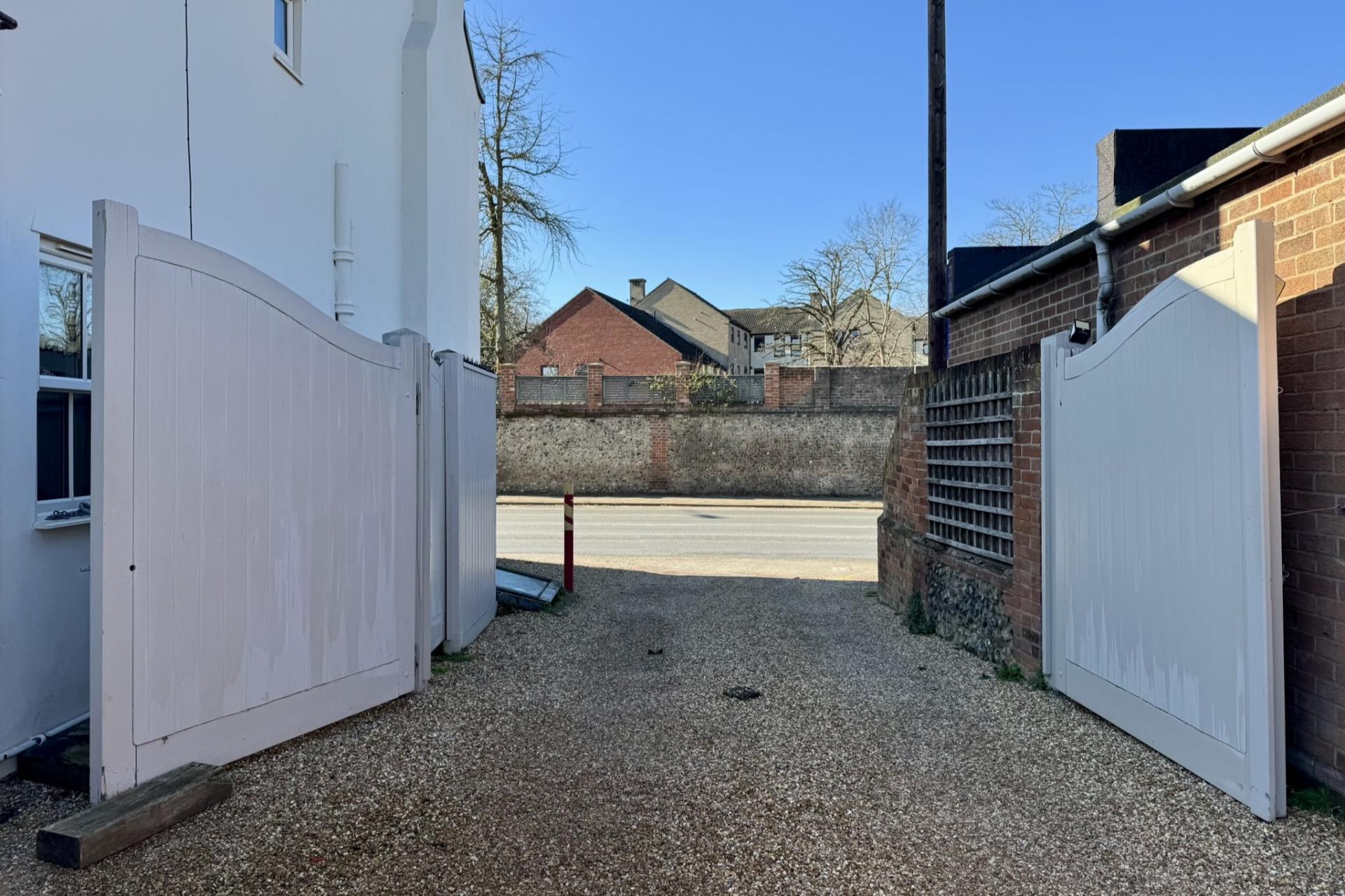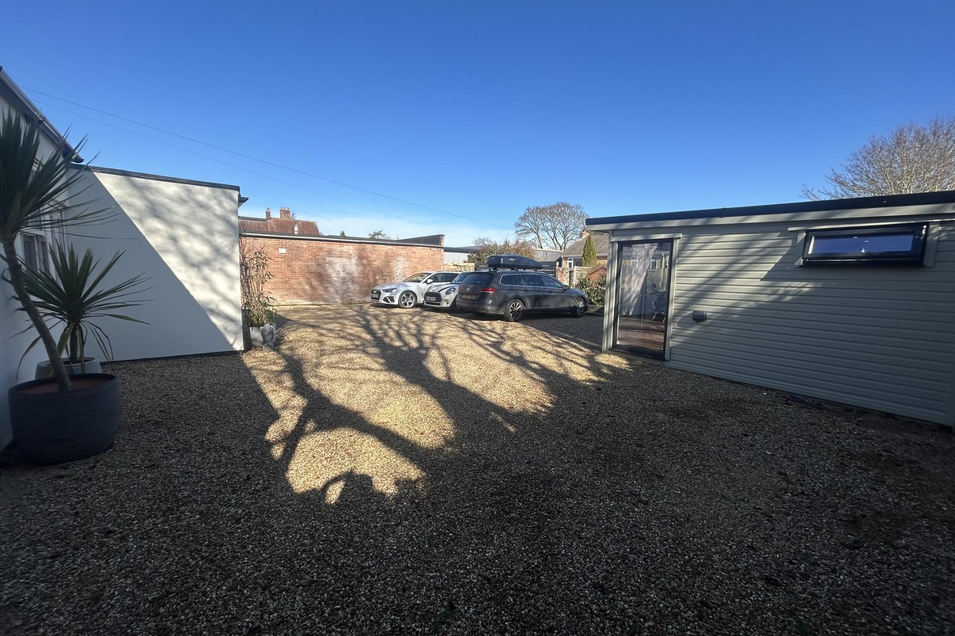 STEP OUTSIDE The property is accessed via large double gates, which open onto a spacious gravelled driveway, offering ample parking space for multiple cars. At the end of the drive, you'll find a purpose-built studio with electricity connected, featuring French doors and large windows that allow plenty of natural light to flood the