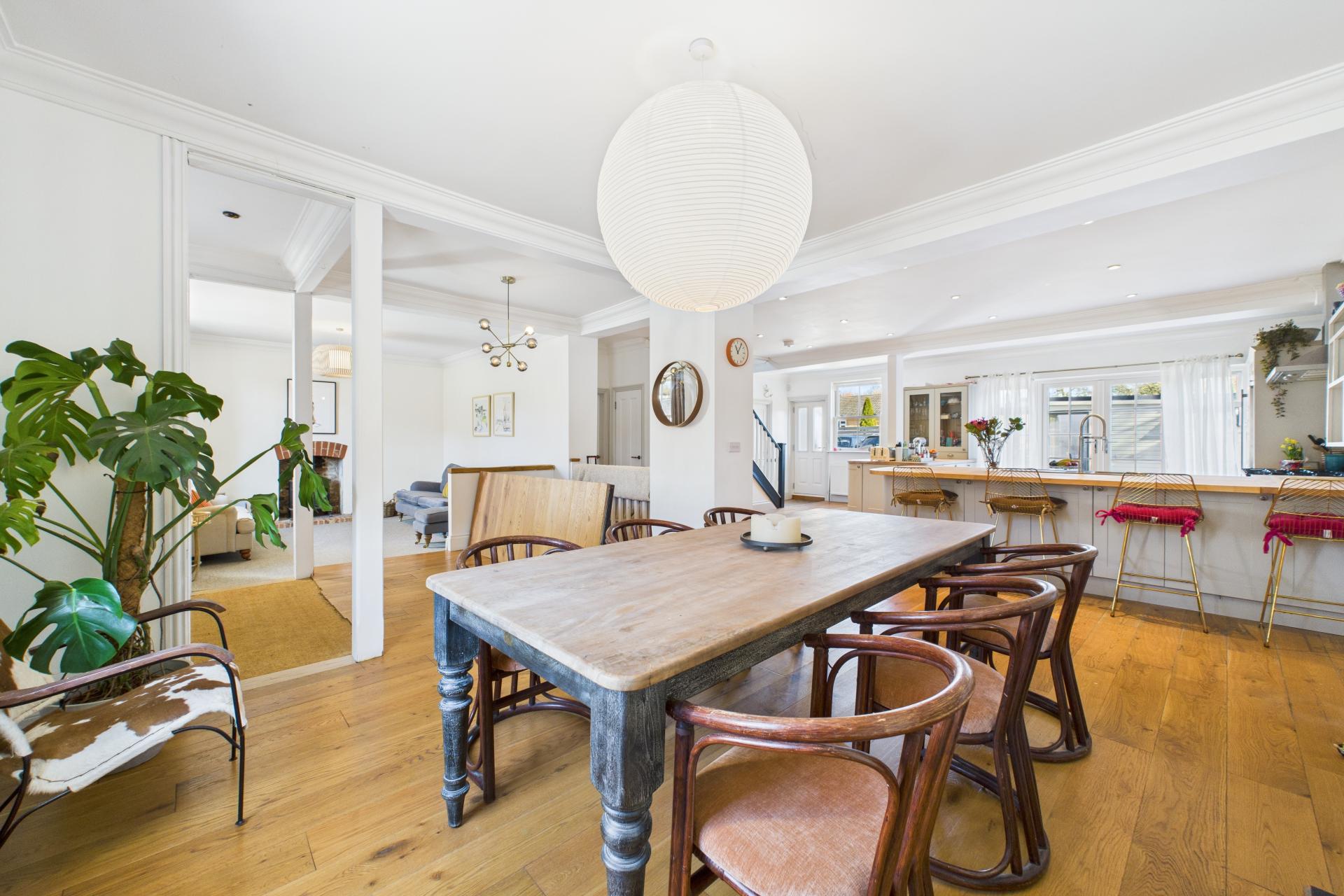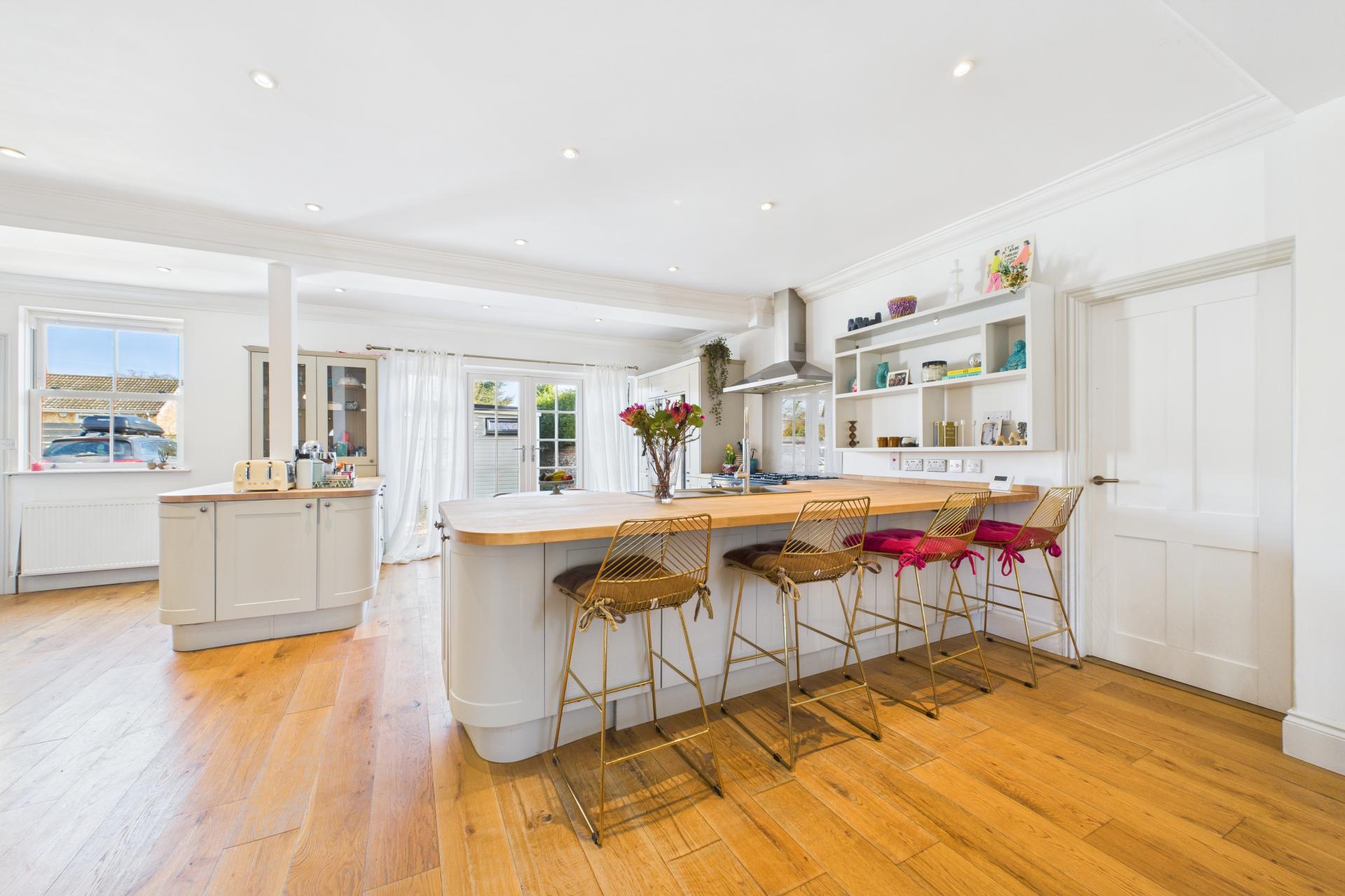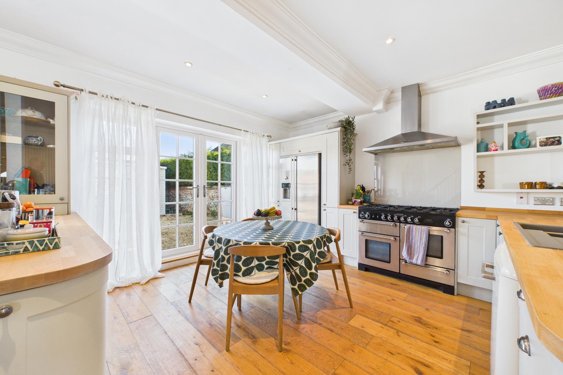 STEP INSIDE Upon stepping inside, you are welcomed into the spacious entrance, where the impressive open-plan layout immediately comes into view. This area offers a wonderful sense of space, with sightlines across the living, dining, and kitchen areas. To the left is the main sitting room, which exudes a cosy ambiance, featuring an inset Fire Fox wood-burning stove perfect for relaxing evenings. Hidden below the entrance is a cellar, accessed via a concealed electric fob operated door from the sitting room. This versatile space could serve as a home office or games room and benefits from a separate door leading outside.The dining area, with its high ceilings and characterful cast-iron fireplace, overlooks the kitchen, creating a fantastic entertaining space. Off the dining room is the ground floor shower room, which includes a pedestal sink, WC, walk-in shower, and skylight windows.A pantry area leads down to a useful utility room, adding to the property's practicality. The kitchen/breakfast area is the heart of the home, offering an impressive and sociable space. Two large breakfast bars, ample shaker-style floor and wall-mounted cupboards, a gas Rangemaster, and an American-style fridge/freezer combine to create a stylish and functional hub. French doors open onto the garden, making this an ideal spot for summer gatherings. A back door leads to the gravelled parking area, with a conveniently located boot room next door. The playroom offers a versatile additional living space, boasting a feature exposed brick wall and chimney, adding to the home's character.