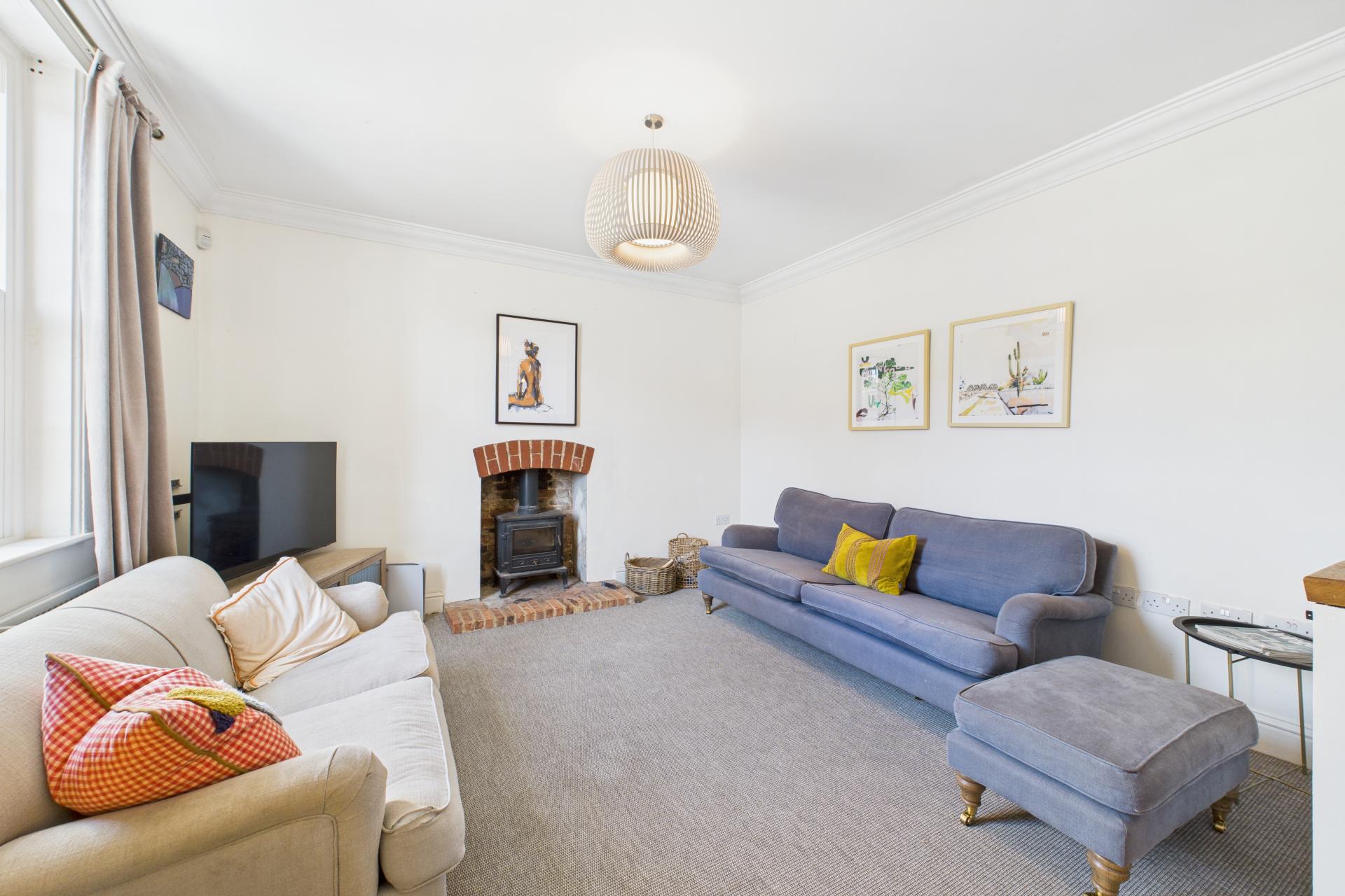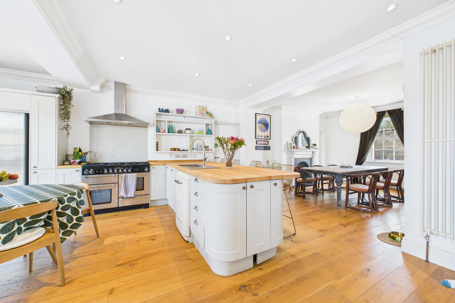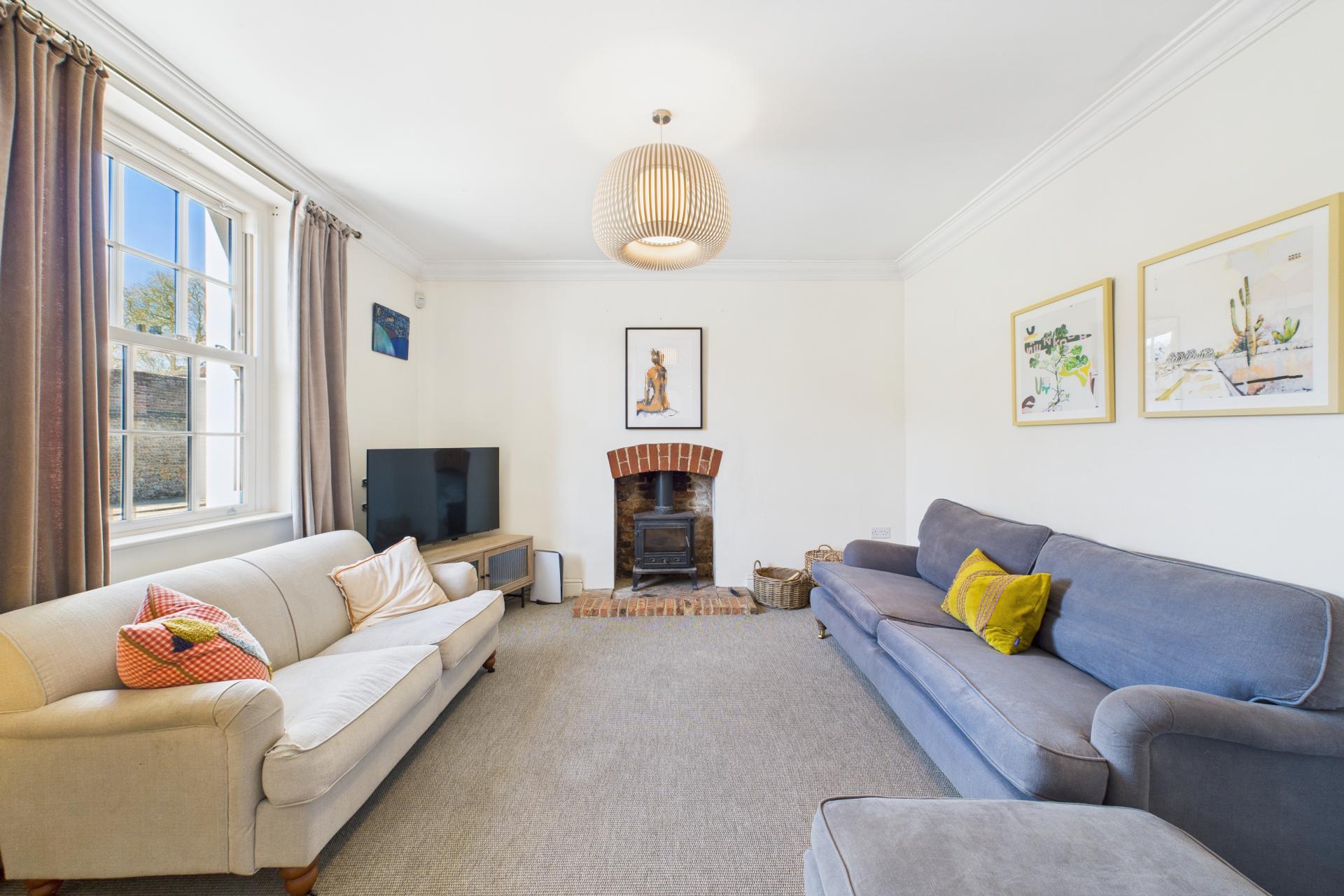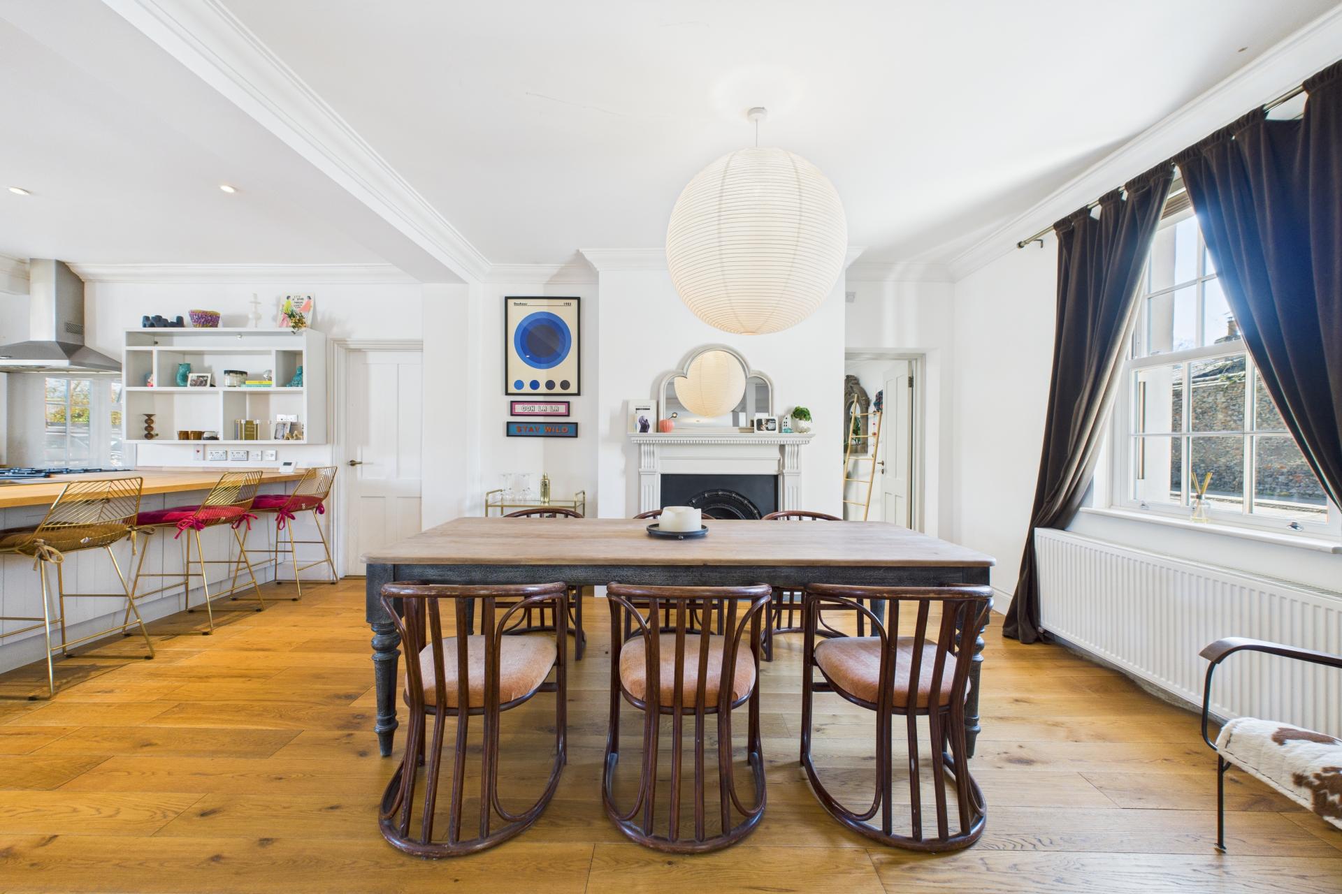 STEP INSIDE Upon stepping inside, you are welcomed into the spacious entrance, where the impressive open-plan layout immediately comes into view. This area offers a wonderful sense of space, with sightlines across the living, dining, and kitchen areas. To the left is the main sitting room, which exudes a cosy ambiance, featuring an inset Fire Fox wood-burning stove perfect for relaxing evenings. Hidden below the entrance is a cellar, accessed via a concealed electric fob operated door from the sitting room. This versatile space could serve as a home office or games room and benefits from a separate door leading outside.The dining area, with its high ceilings and characterful cast-iron fireplace, overlooks the kitchen, creating a fantastic entertaining space. Off the dining room is the ground floor shower room, which includes a pedestal sink, WC, walk-in shower, and skylight windows.A pantry area leads down to a useful utility room, adding to the property's practicality. The kitchen/breakfast area is the heart of the home, offering an impressive and sociable space. Two large breakfast bars, ample shaker-style floor and wall-mounted cupboards, a gas Rangemaster, and an American-style fridge/freezer combine to create a stylish and functional hub. French doors open onto the garden, making this an ideal spot for summer gatherings. A back door leads to the gravelled parking area, with a conveniently located boot room next door. The playroom offers a versatile additional living space, boasting a feature exposed brick wall and chimney, adding to the home's character.