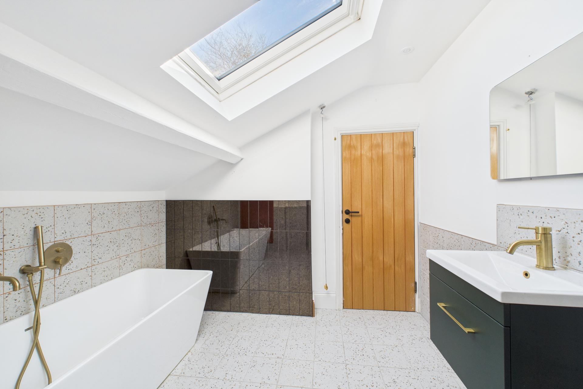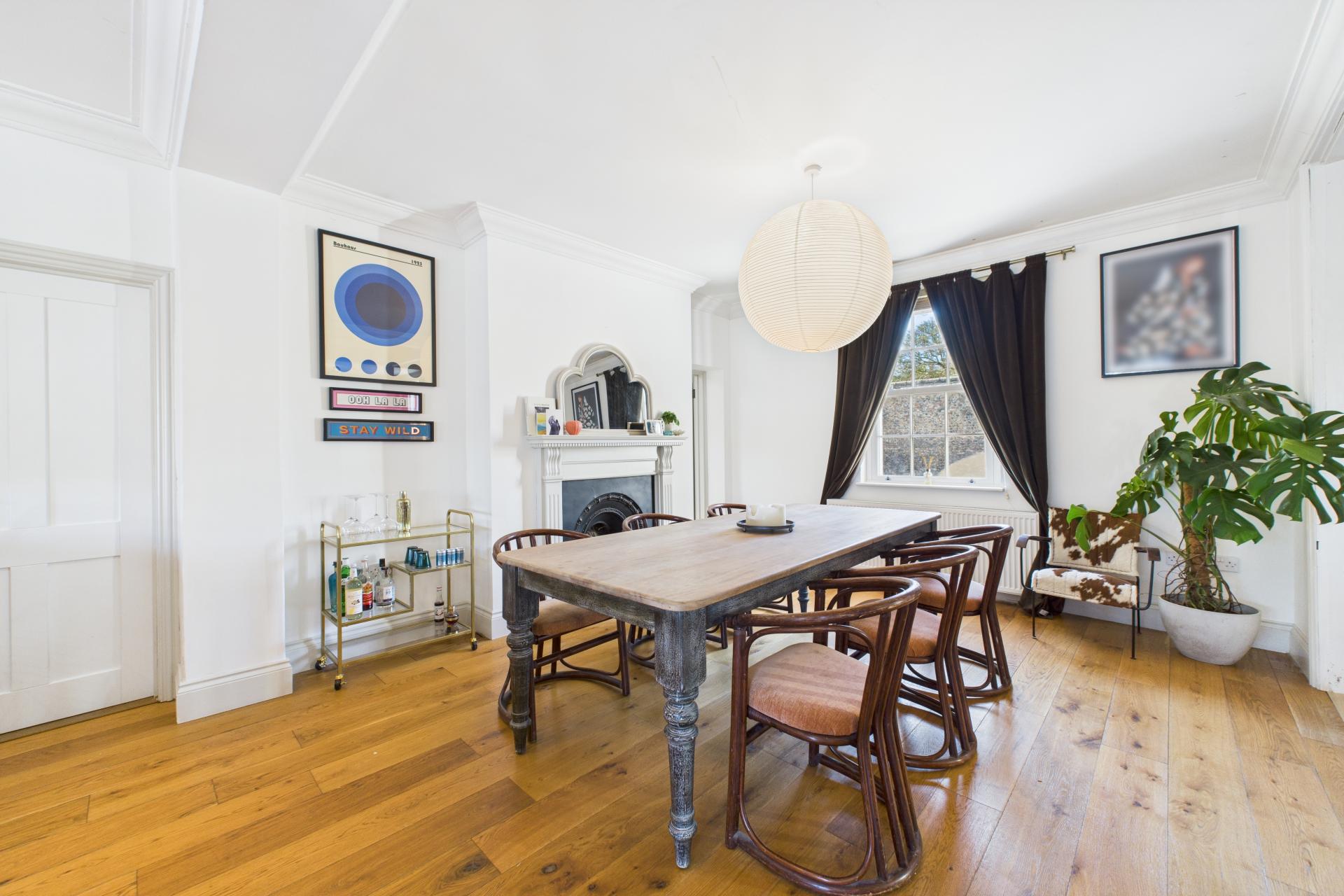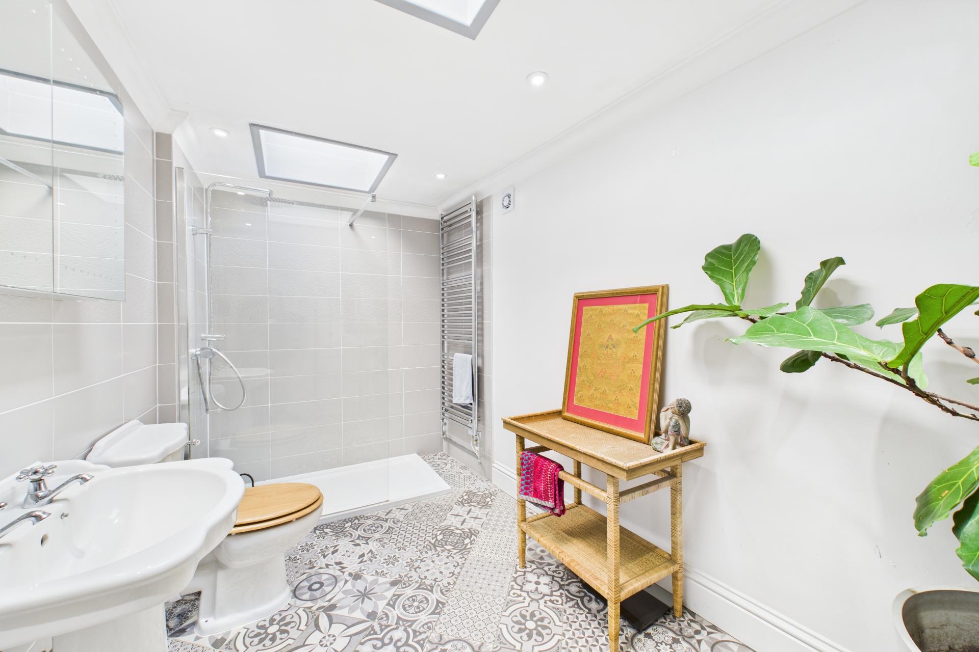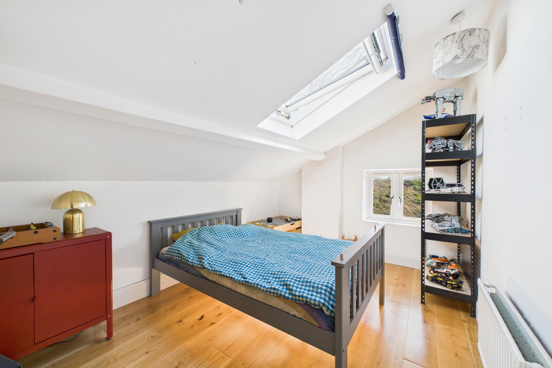 Ascending to the first floor, a spacious and bright landing provides access to all four bedrooms. The master bedroom is generously sized, with a feature fireplace, ample storage space, and a large sash window. Bedroom two is another spacious double with a beautiful sash window, while bedroom three is a light-filled double room with side aspect double-glazed windows and a Velux window. Bedroom four is currently used as a dressing room, offering great flexibility. The modern family bathroom completes the first floor, featuring a freestanding rectangular bath with built-in wall tap and shower attachment, WC, vanity sink unit, and Velux window, creating a luxurious retreat.