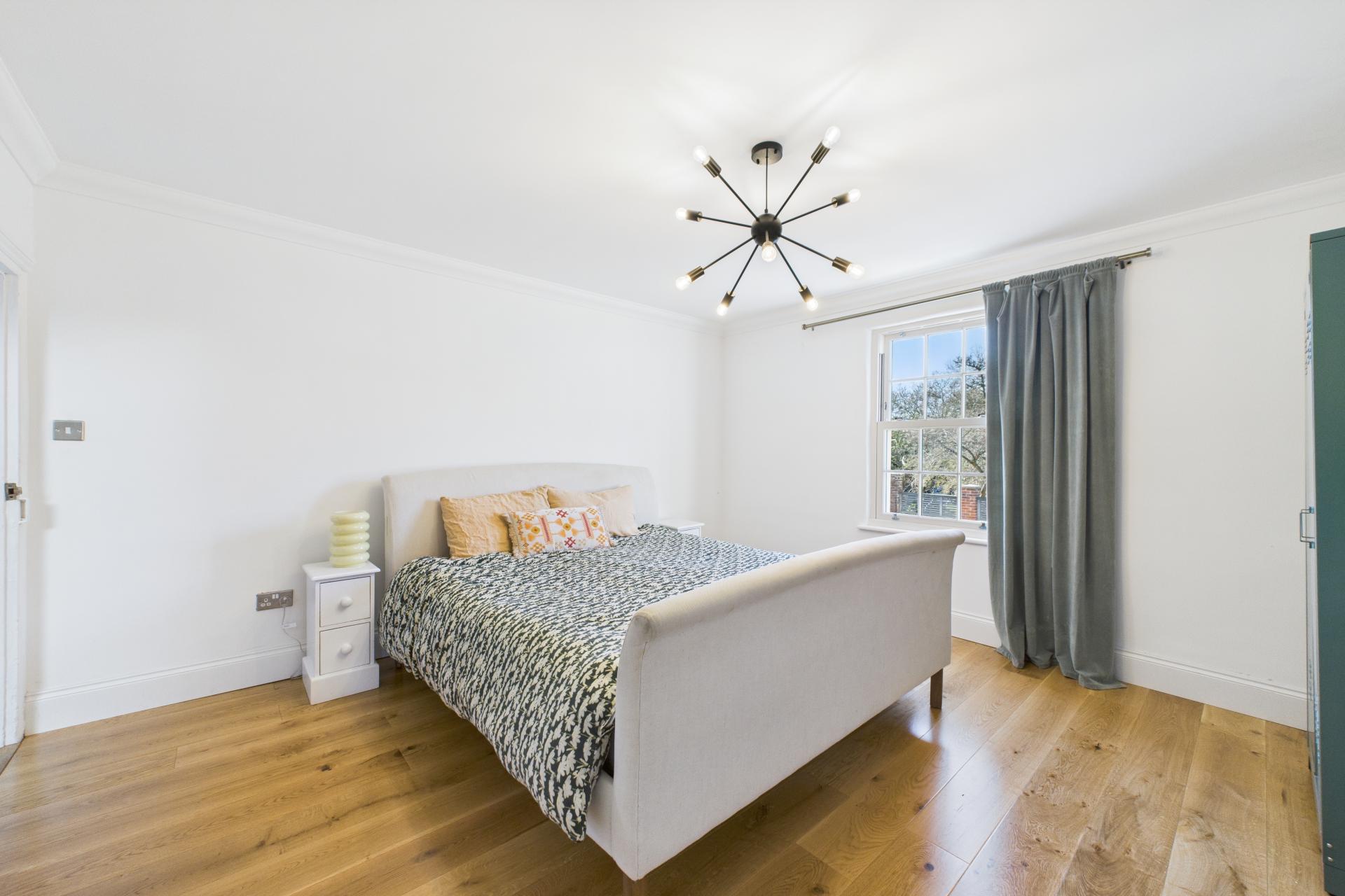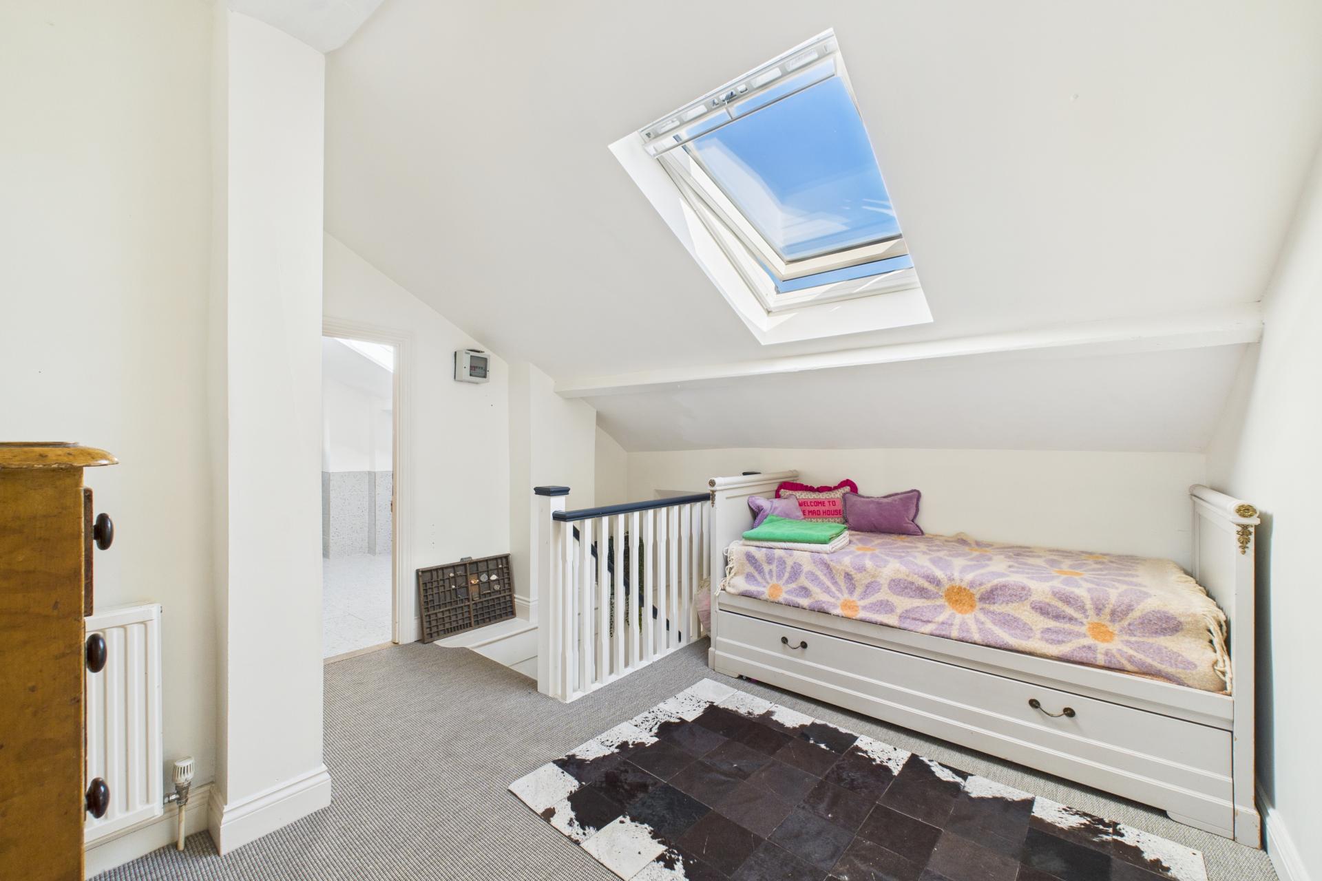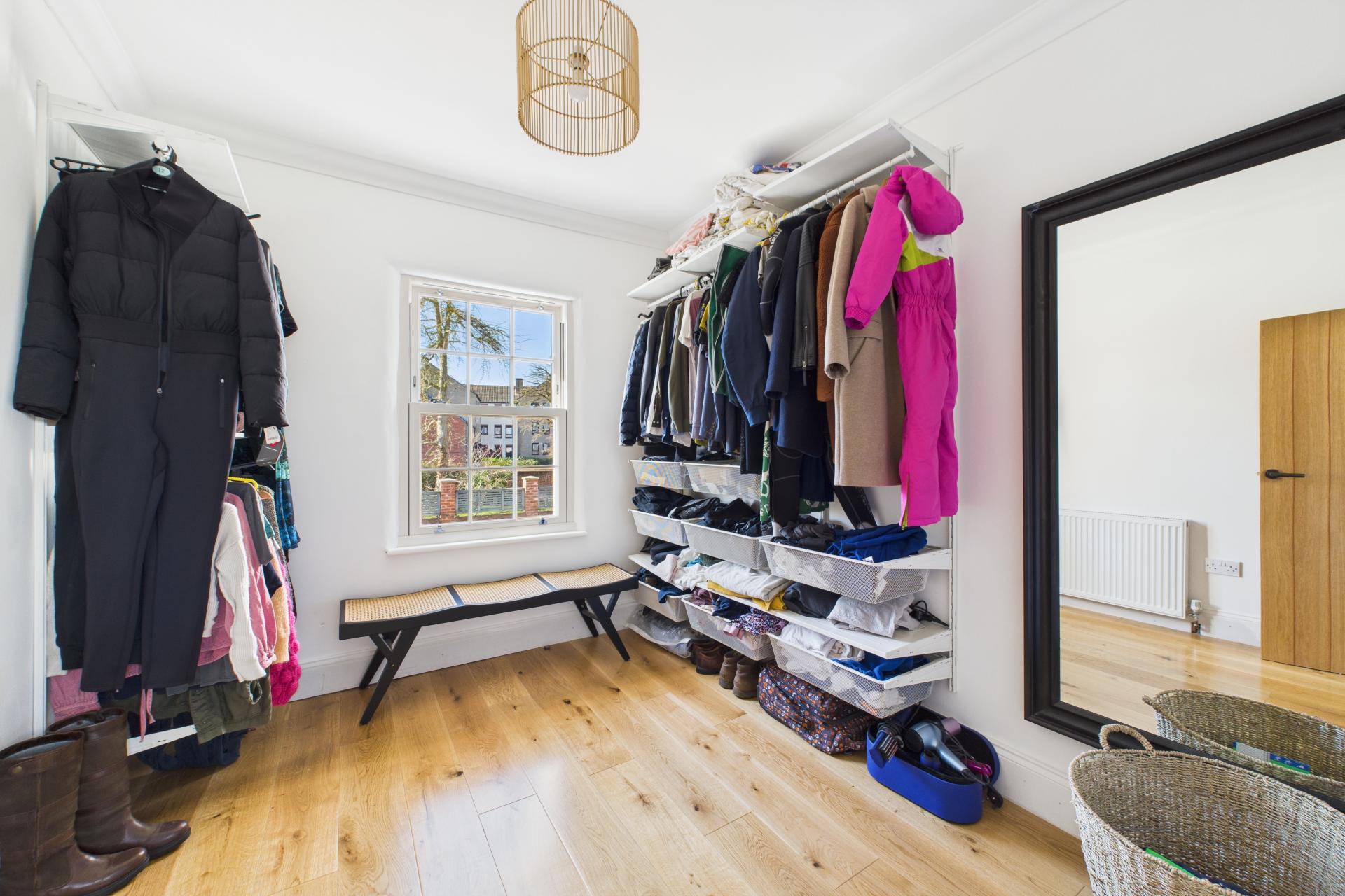 Ascending to the first floor, a spacious and bright landing provides access to all four bedrooms. The master bedroom is generously sized, with a feature fireplace, ample storage space, and a large sash window. Bedroom two is another spacious double with a beautiful sash window, while bedroom three is a light-filled double room with side aspect double-glazed windows and a Velux window. Bedroom four is currently used as a dressing room, offering great flexibility. The modern family bathroom completes the first floor, featuring a freestanding rectangular bath with built-in wall tap and shower attachment, WC, vanity sink unit, and Velux window, creating a luxurious retreat.