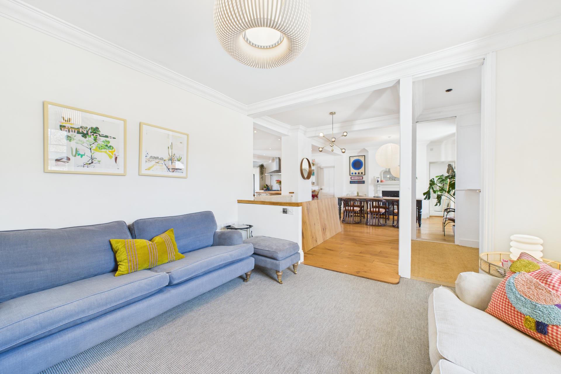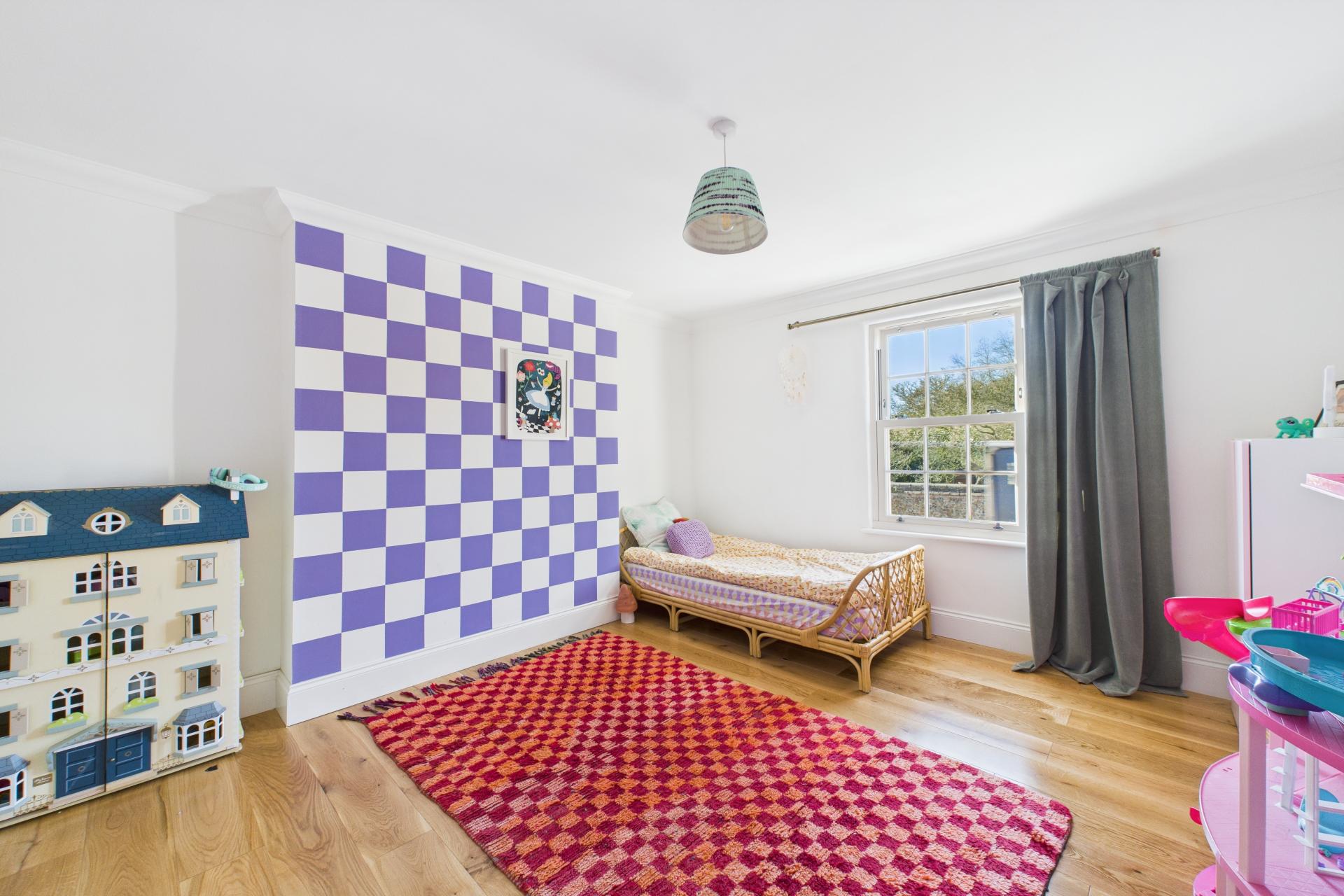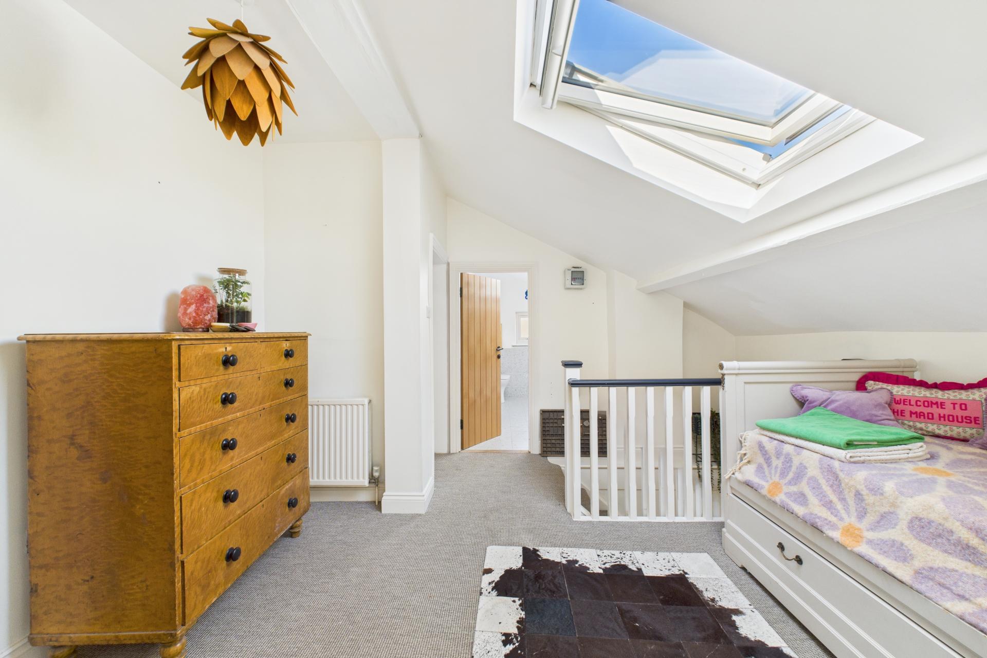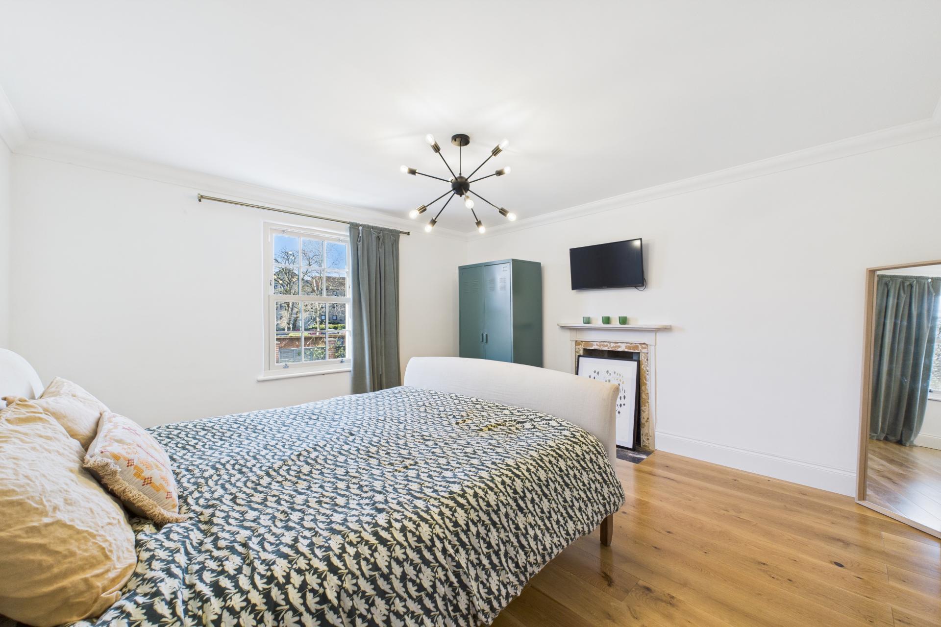 Ascending to the first floor, a spacious and bright landing provides access to all four bedrooms. The master bedroom is generously sized, with a feature fireplace, ample storage space, and a large sash window. Bedroom two is another spacious double with a beautiful sash window, while bedroom three is a light-filled double room with side aspect double-glazed windows and a Velux window. Bedroom four is currently used as a dressing room, offering great flexibility. The modern family bathroom completes the first floor, featuring a freestanding rectangular bath with built-in wall tap and shower attachment, WC, vanity sink unit, and Velux window, creating a luxurious retreat.