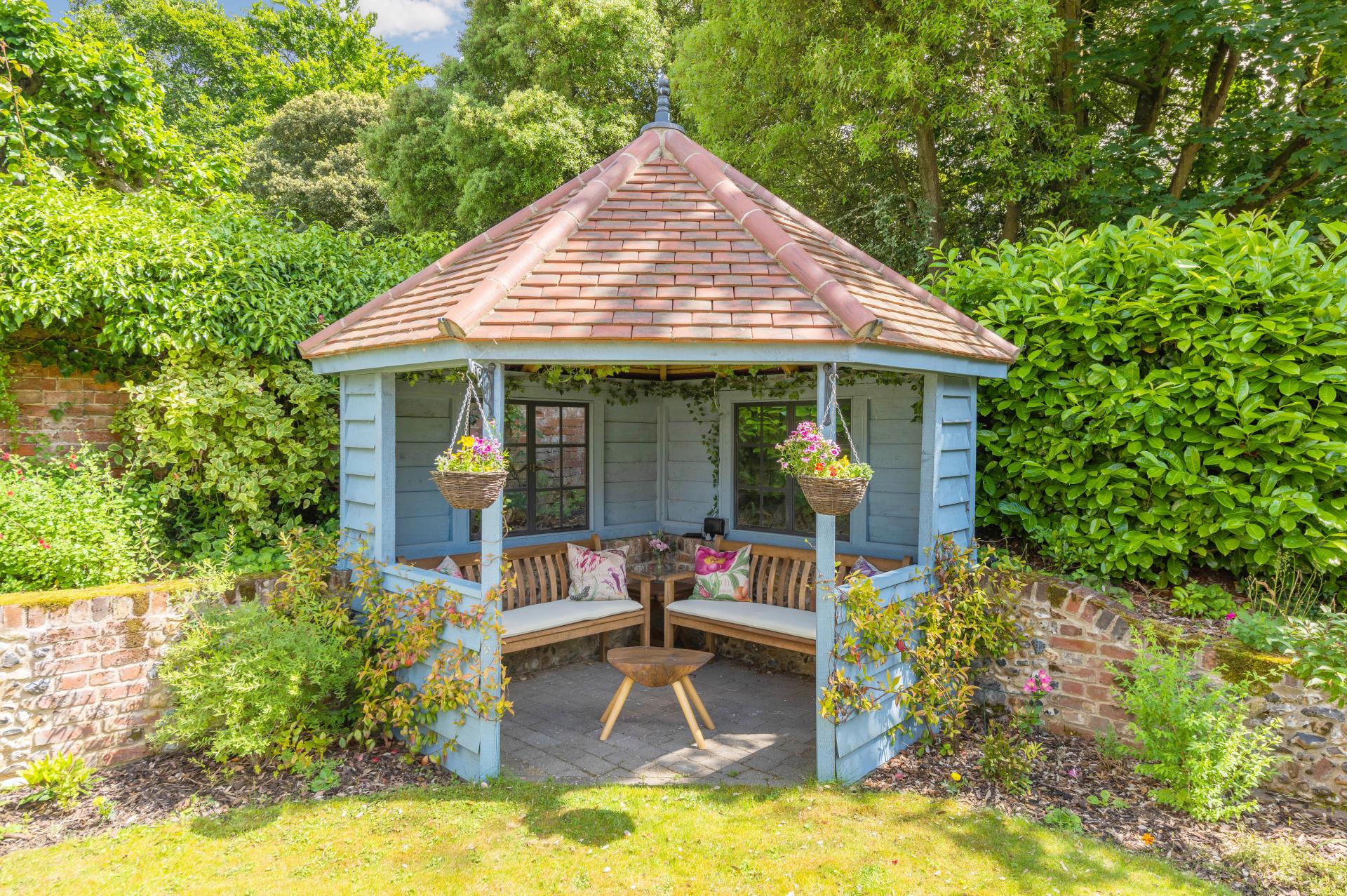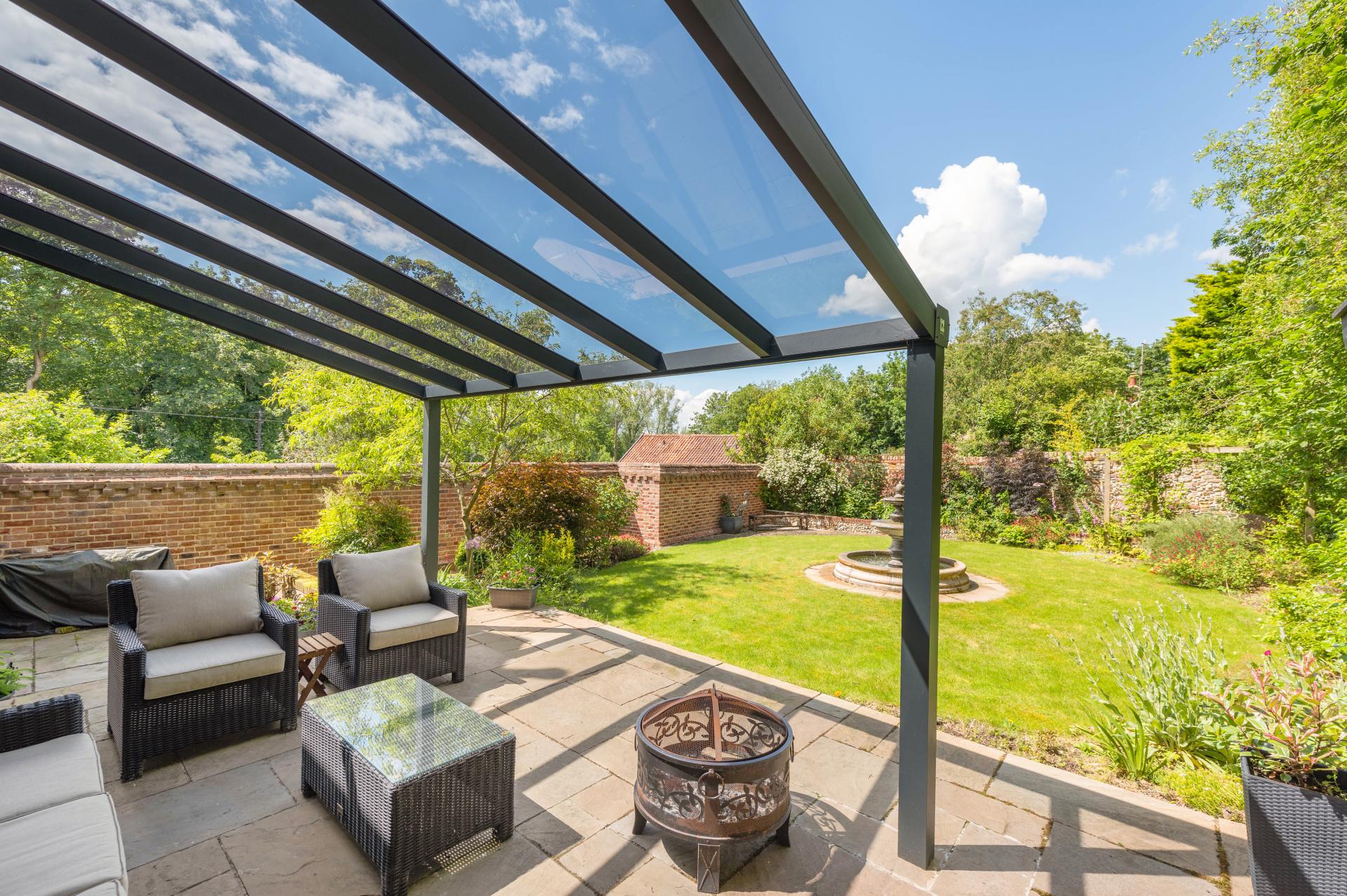 STEP OUTSIDE This unique property boasts two enchanting flint and brick-walled gardens, known as the North Garden and the South Garden. The North Garden exudes a charming cottage feel, featuring a circular lawn at the centre of which sits a stunning water fountain. A fixed, covered double-glazed canopy over the terrace provides shelter, making it perfect for outdoor entertaining. A gate from the North Garden leads down the rear of the property and seamlessly flows into the South Garden. The South Garden is graced with a sun-catching patio, ideal for basking in the warmth. This garden also offers a lawn area surrounded by mature shrubs and a delightful pavilion. Additionally, the South Garden provides private access to the garage, enhancing its convenience and appeal. South Garden is pictured to the Right and North Garden is pictured below.