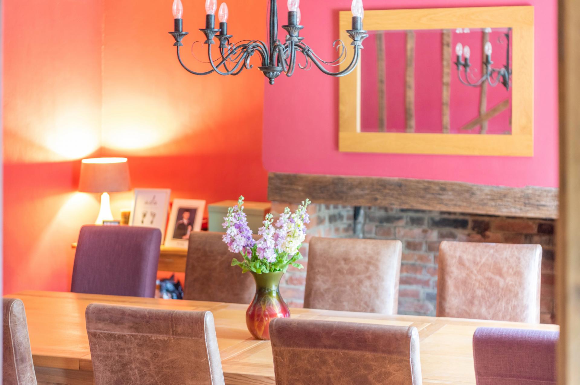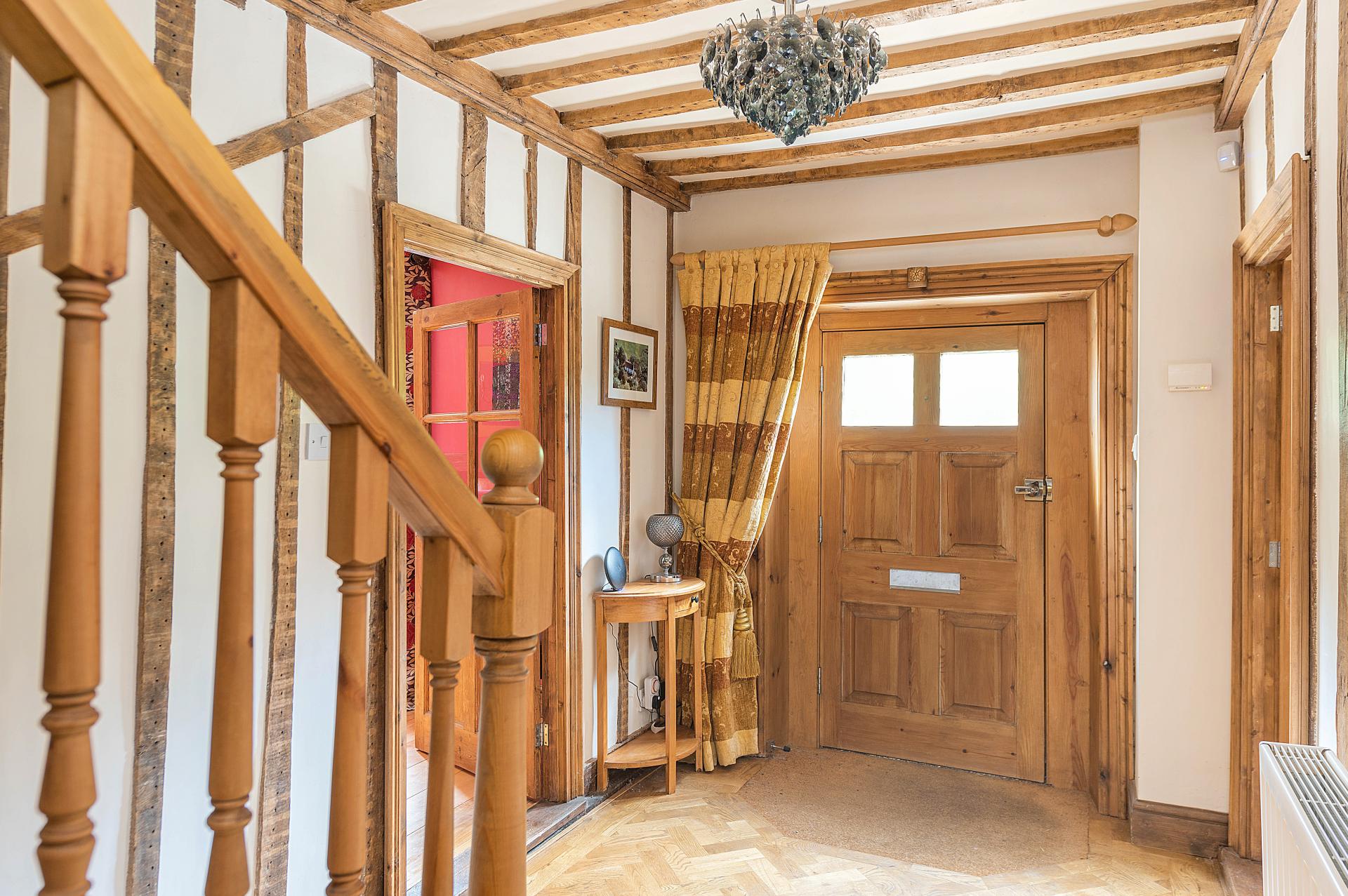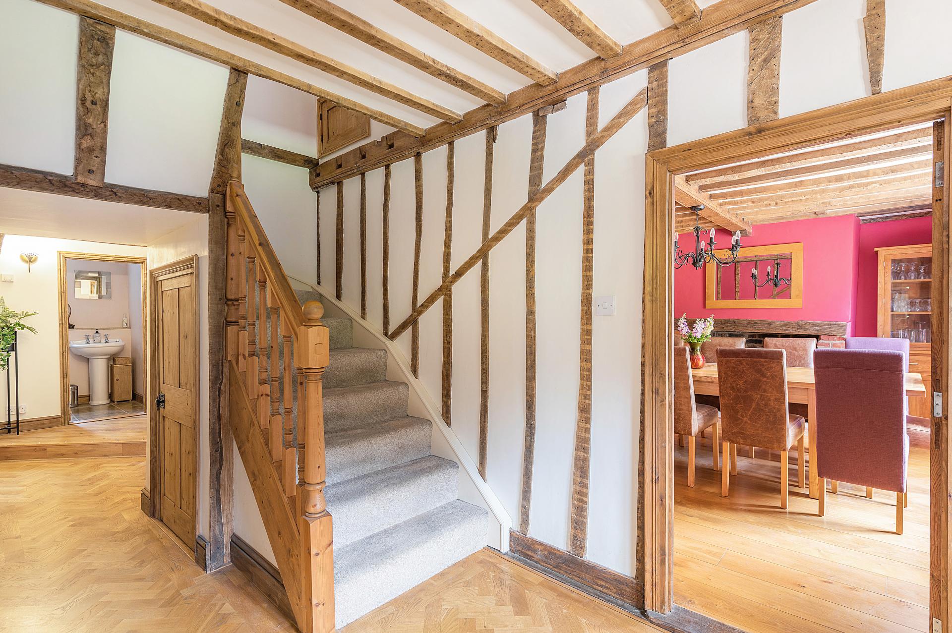 Across the hallway, the spacious formal dining room, a prime example of rustic elegance. This room showcases a wealth of exposed beams and rich oak flooring, complemented by another exquisite fireplace, perfect for creating a warm and inviting ambiance during dining occasions. The parquet flooring continues down the inner hallway, seamlessly connecting the spaces.
