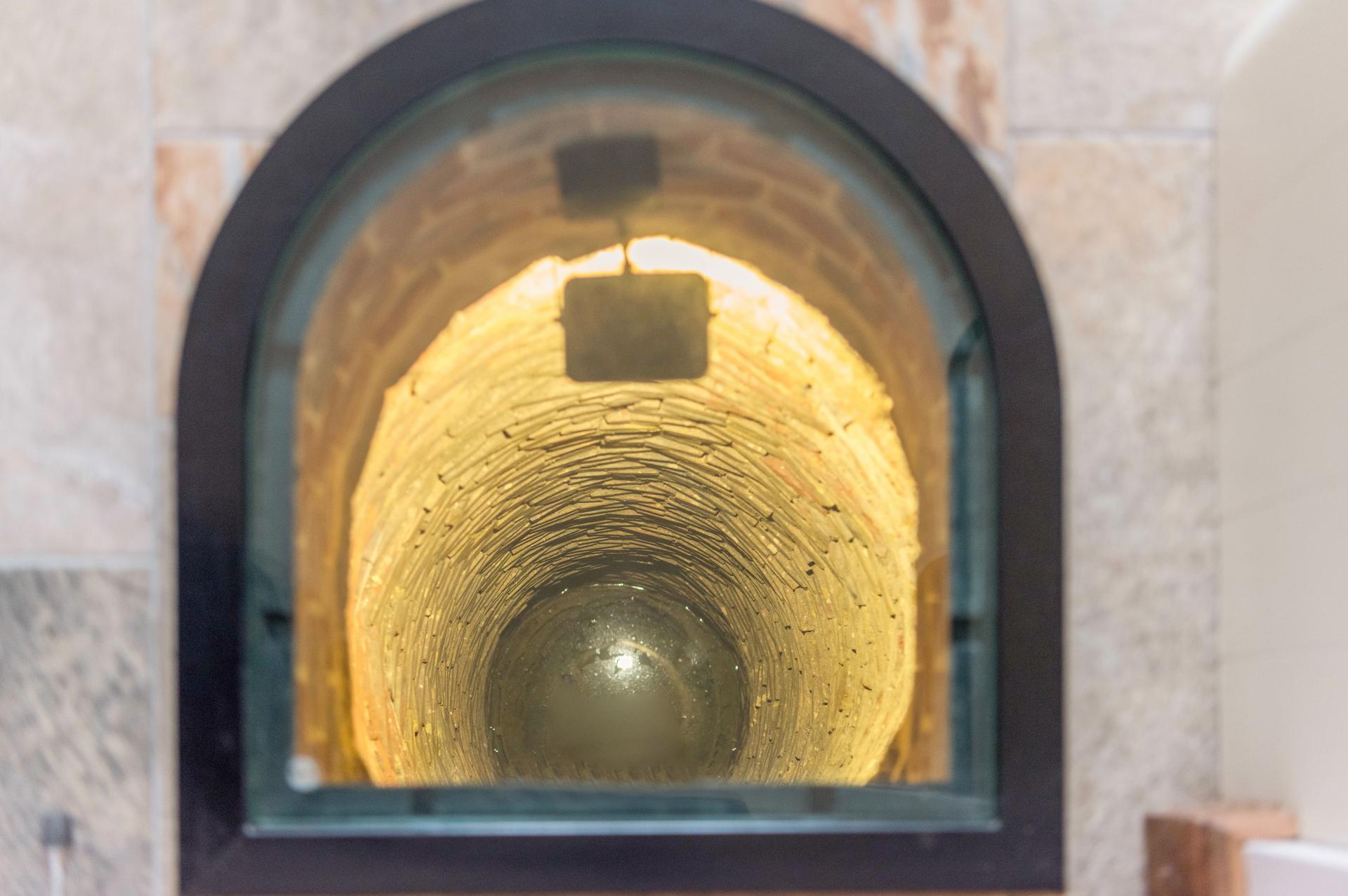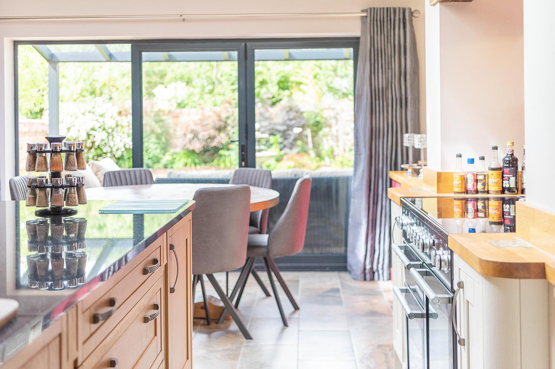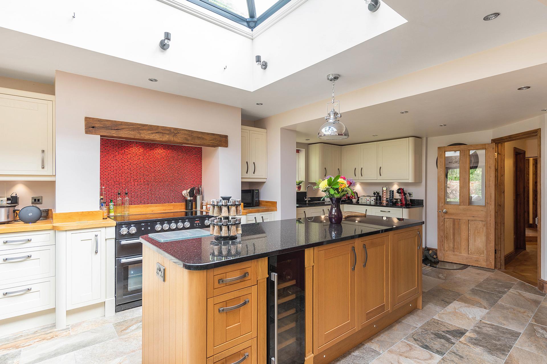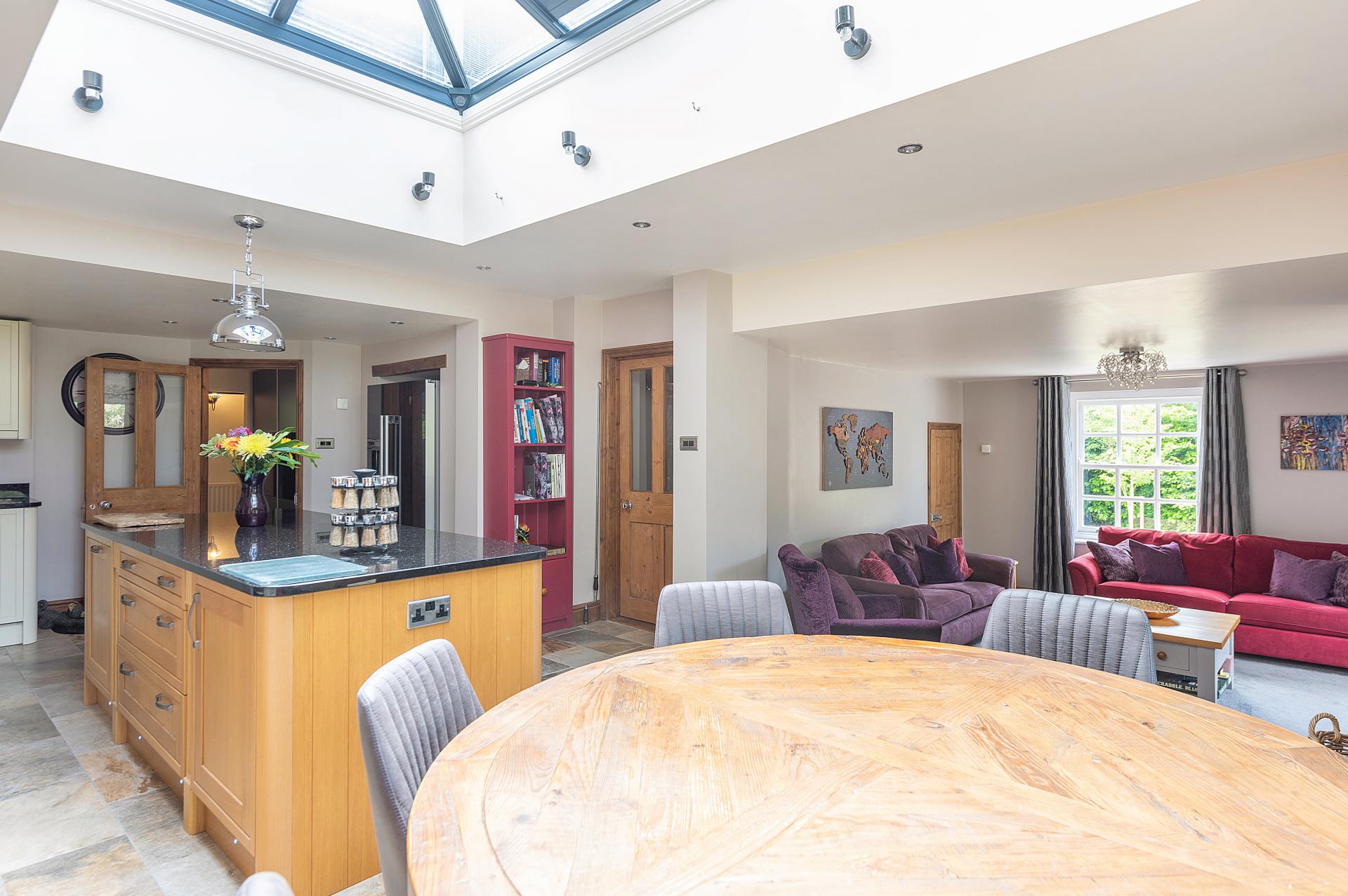 Onto the garden room/office that features an air conditioning unit that provides both cool and warm air. This room also boasts a sliding door that opens onto the South Terrace, creating a perfect indoor-outdoor flow. As you proceed back down the hallway, you enter the large open-plan kitchen, which masterfully blends modern functionality with traditional charm. The kitchen is adorned with shaker-style wall and cupboard units and is well-equipped with an integrated dish washer, a range cooker and a wine fridge within the large central island. There's space for an American-style fridge/freezer. A stunning roof lantern window floods the space with natural light, while the kitchen's underfloor heating ensures comfort. A striking feature of this kitchen is the illuminated Well, beautifully covered with glass. Bi-fold doors provide access to the covered patio, perfect for al fresco dining. Steps that seamlessly lead down to the family room, a cosy retreat featuring a fireplace with an inset wood-burning stove, underfloor heating and double French doors that open onto the North Garden.