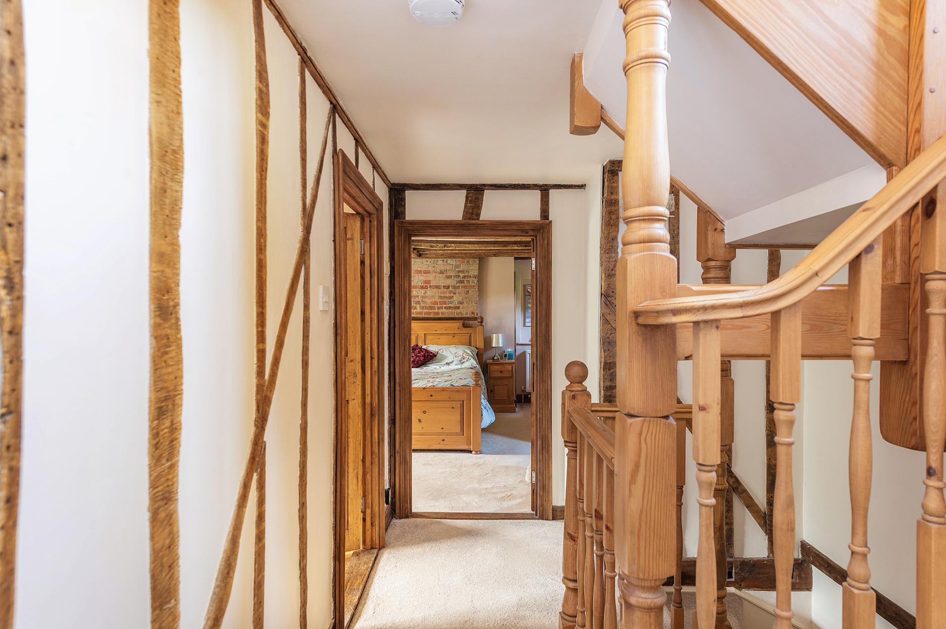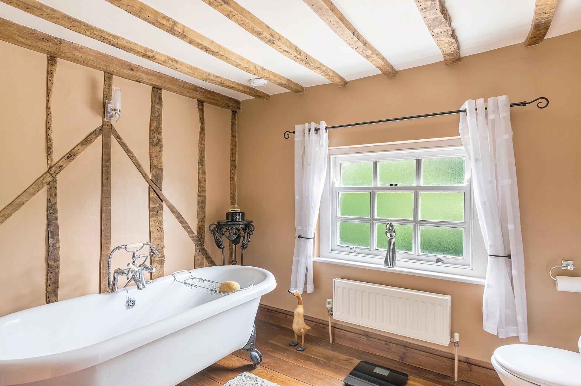 Off the kitchen there is a staircase that ascends to the fifth bedroom, this spacious room, offers versatile living with an ensuite shower room complete with a hand wash basin, WC, and shower cubicle. From the front hallway, stairs lead to the first-floor landing, where you will find the principal bedroom. This room is adorned with an air conditioning unit providing both cool and warm air, feature exposed brickwork and beautiful beams. It also boasts an ensuite with wooden flooring. Following down the landing area, there is a large family bathroom that is traditionally styled, featuring a free-standing roll-top bath, WC and wash basin. The second bedroom is a spacious room, with exposed beams, a feature fireplace, and an ensuite. Ascending from the first-floor landing to the second floor, you are greeted with delightful views over a meadow. Both bedrooms three and four have windows overlooking the front driveway and rear Velux-style windows that allow plenty of natural light. These rooms are embellished with beams and feature brickwork. The second floor is also equipped with a shower room.