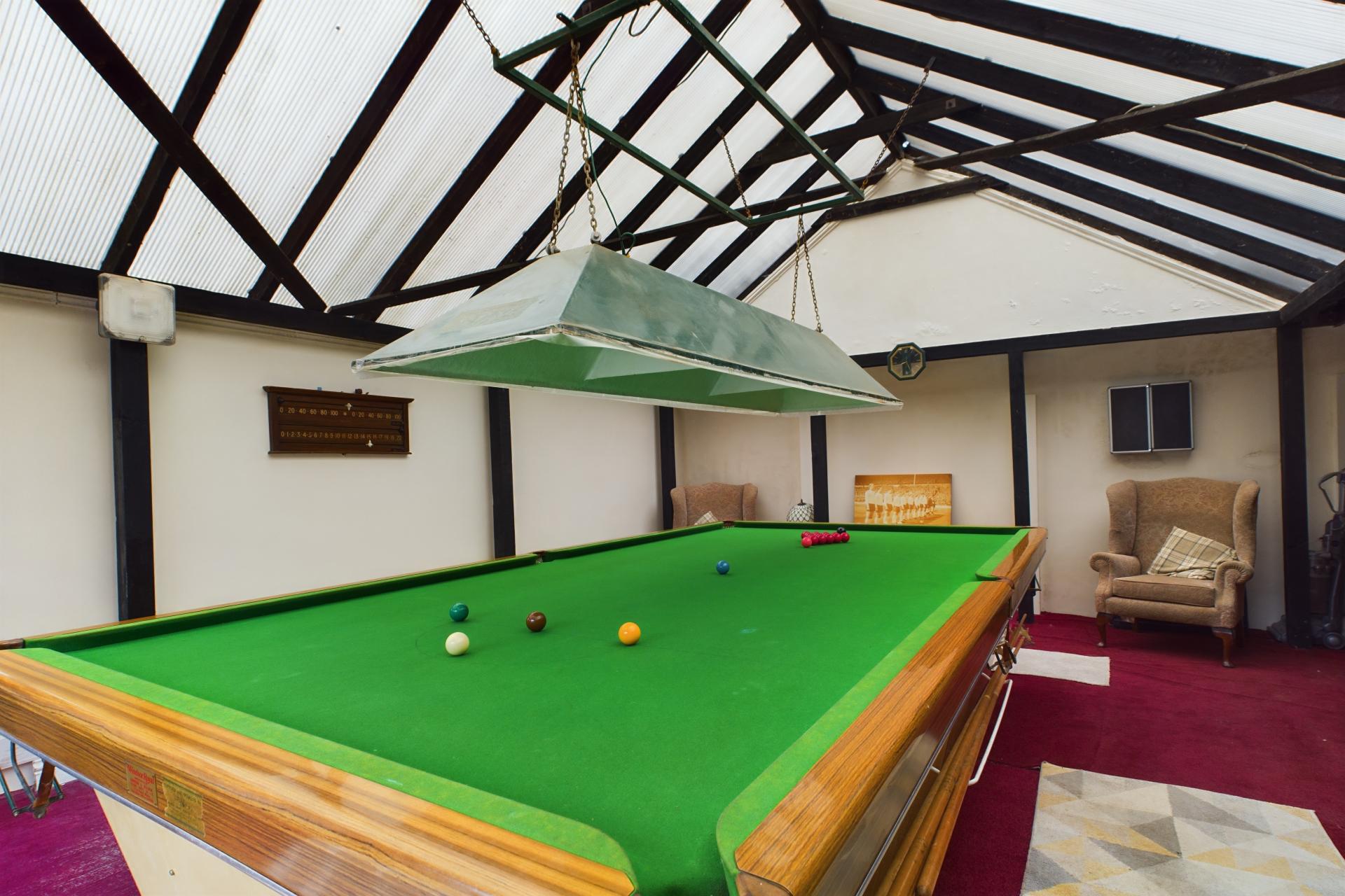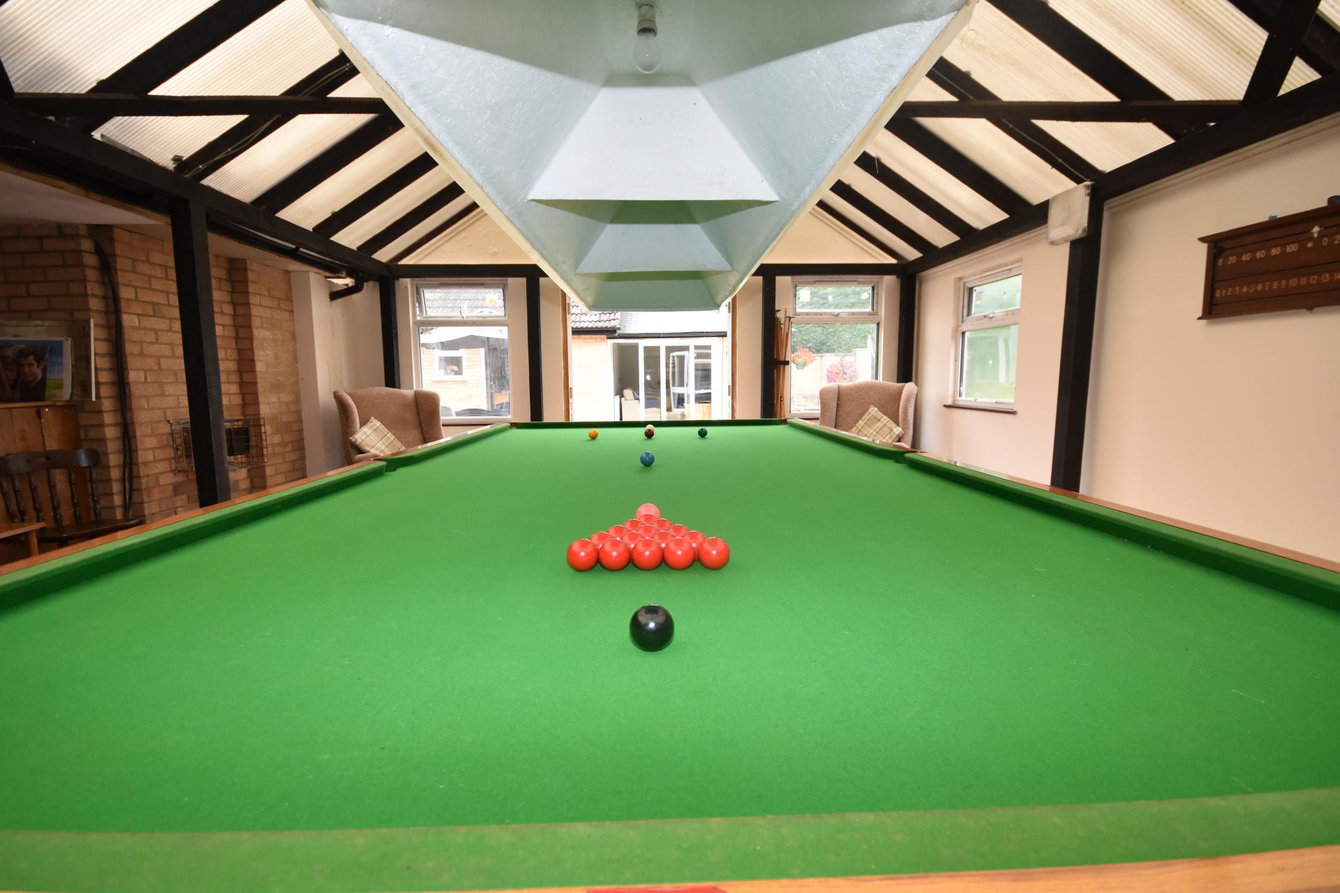 STEP INSIDE The main bungalow boasts a spacious layout, featuring an extended living and dining area accessible through a generous reception hall. The hall includes two built-in storage cupboards and provides access to three double bedrooms, each equipped with built-in wardrobes. The family bathroom, office, and utility room are also accessible from the hall. The utility room includes space for both a washing machine and dryer. The kitchen, accessible from both the living/dining room and the utility room, seamlessly flows into a sunroom that overlooks the rear gardens. Additionally, the property includes a carport and a single garage with a storeroom above, which connects to a large games room complete with a full-size snooker table.