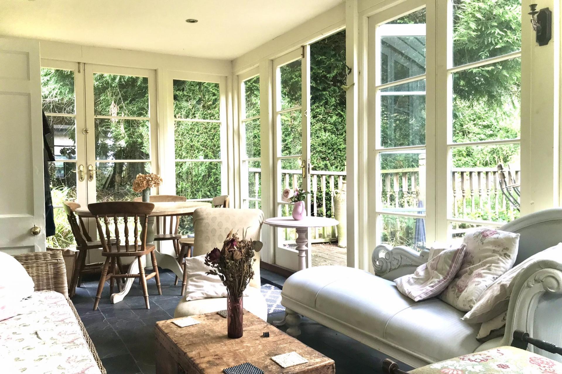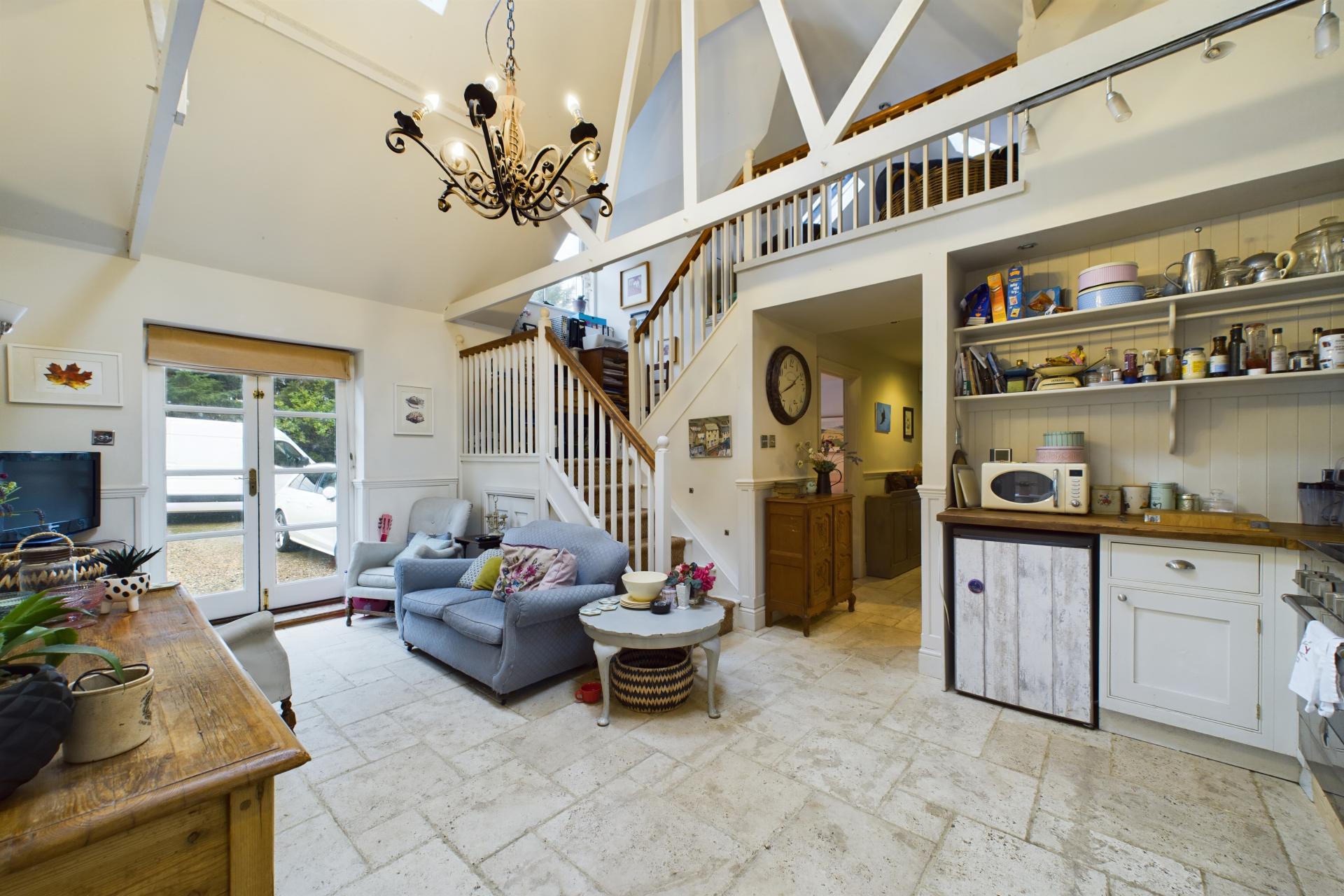 The annex offers flexible accommodation with a ground-floor double bedroom, a bathroom with a roll-top bath, and a light-filled kitchen with vaulted ceilings. There is space for a range oven and fridge, and a dining area with French doors opening onto the driveway. Stairs lead to a mezzanine level, which can be used as a second bedroom. The annex also includes a garden room with views over the grounds, opening onto a decking area.