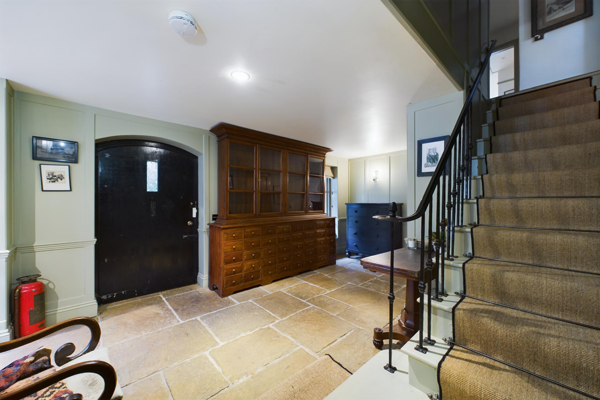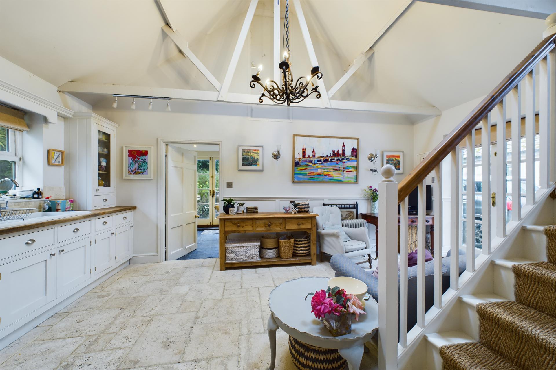 STEP INSIDE Upon entering, you step into a spacious reception hall with panelling and stone flooring, which works well as a boot room. From here, you're led to the kitchen/dining room, which includes hand-painted wall and base units, wooden worktops, a butler-style sink, and a central island. An Aga sits under an extractor hood, while pamment tile flooring extends into the dining and living area, where a wood-burning stove and French doors open to a side terrace.