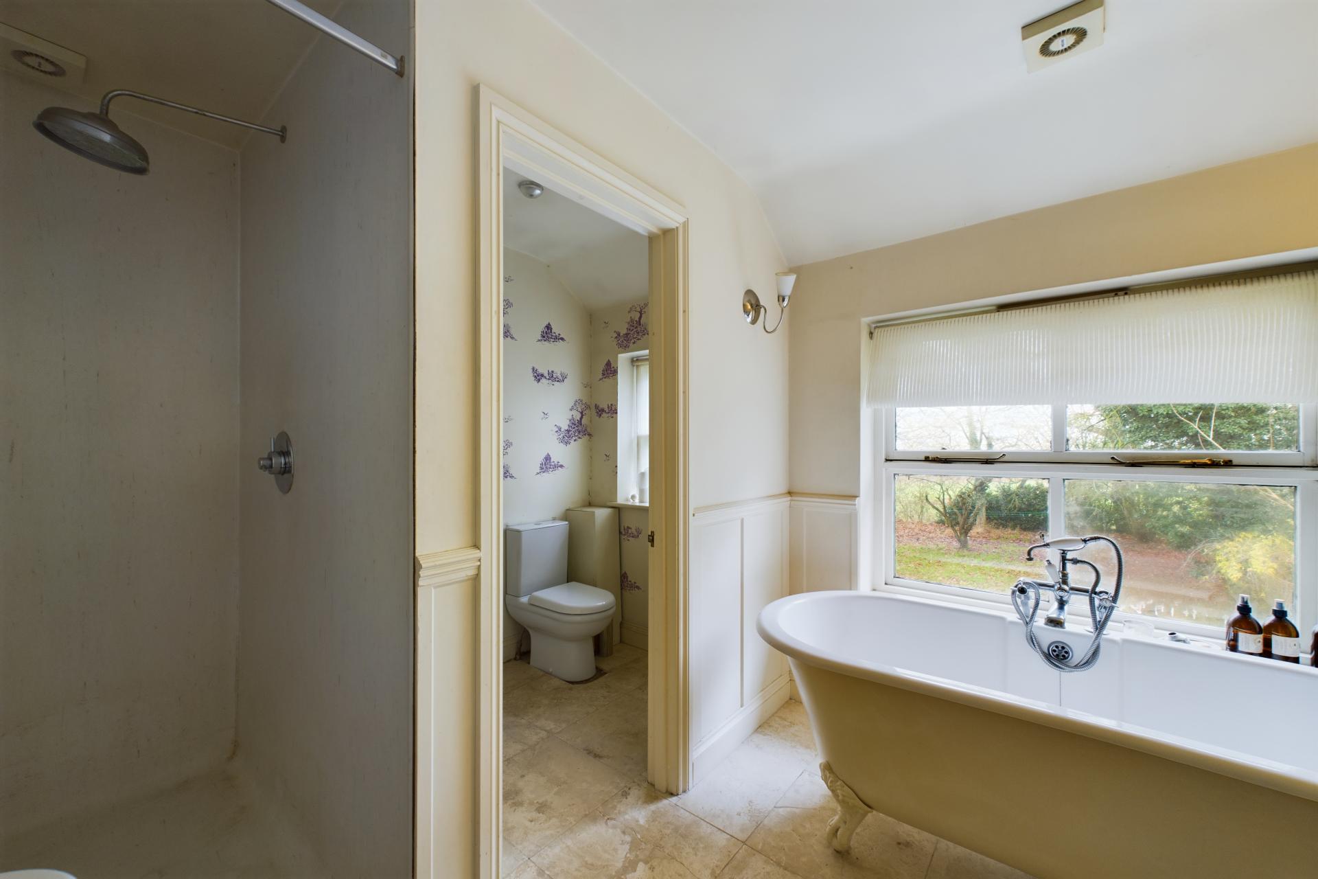 STEP OUTSIDE The property is set within approximately 1.2 acres of mature grounds, offering a tranquil and private setting. There are two well-positioned terrace areas and a rear decking area, perfect for outdoor relaxation. The grounds include expansive lawns surrounded by well-established trees, mature shrubs, and a pond that forms part of a three-tier pumped system, adding to the peaceful, natural ambiance. While the garden provides plenty of space and potential, some areas would benefit from attention and maintenance.