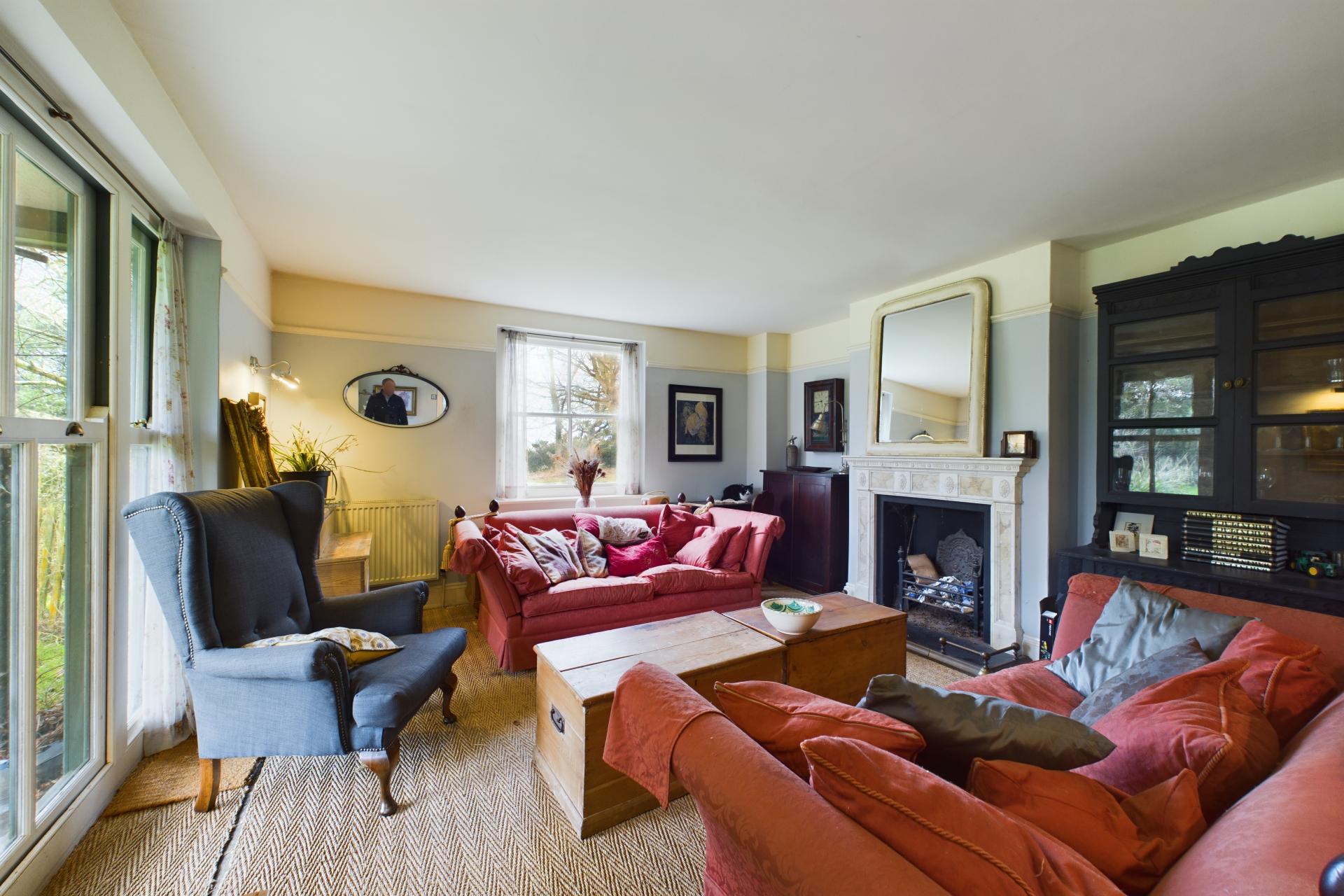 The drawing room is a generous space with a feature fireplace, dual-aspect windows overlooking the gardens, and a door opening onto a veranda. Adjacent is the sitting room, which also has a fireplace, shuttered sash windows, and access to the veranda. On the other side of the kitchen, there is a pantry leading to a boot room with garden access and a door back to the reception hall, which connects to the annex.