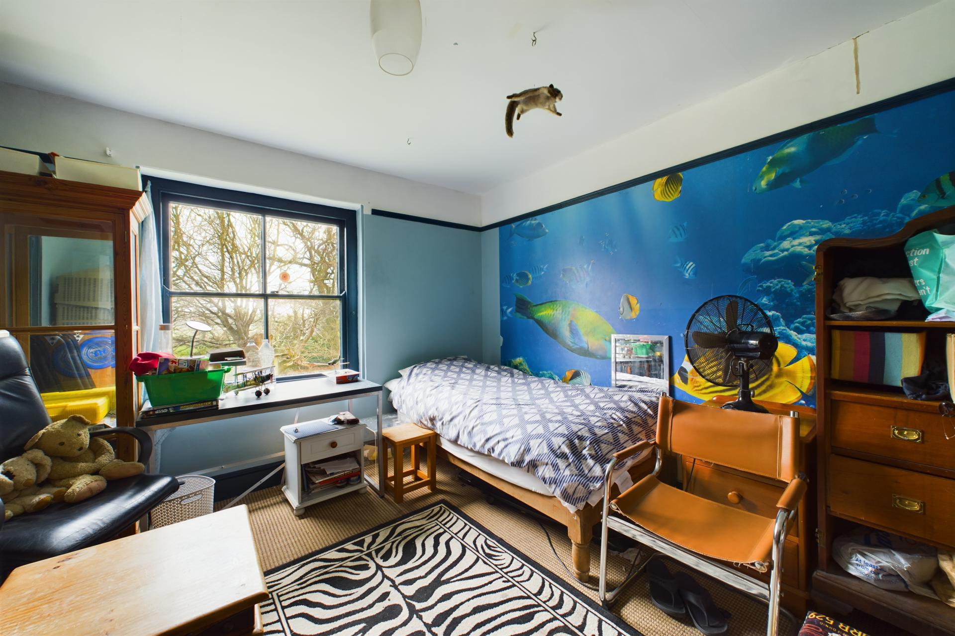 Upstairs, a spacious landing leads to the principal bedroom, which features a Juliet balcony, a dressing area, and an en-suite with a roll-top bath, double wash basins, a walk-in shower, and a separate WC. Bedroom six is currently used as a home office, while Bedroom five is a well-proportioned double with built-in storage. Bedroom three is another double, with a unique design that includes an en-suite shower cubicle and a separate WC concealed behind cupboard doors. Bedroom two is currently used as a playroom but could be a bedroom if needed. Bedroom four features a built-in wardrobe, a sash window with a front aspect, and a former feature fireplace. It also has direct access to the family bathroom, functioning as a Jack-and-Jill en-suite.