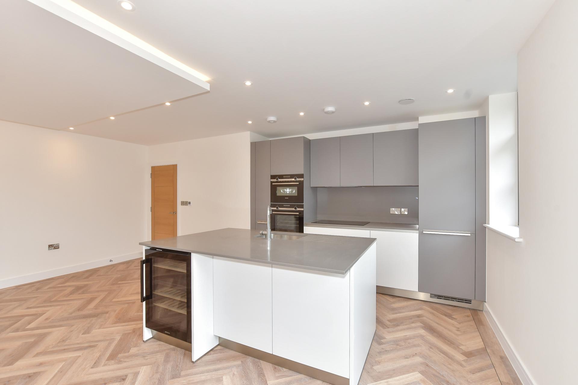 There is a spacious lounge/kitchen/diner with patio doors to a private balcony and a delightful Smallbone kitchen. This includes a built in induction hob, oven and combi microwave, an integrated fridge freezer, dishwasher and wine cooler as well as utility cupboard with a washing machine.