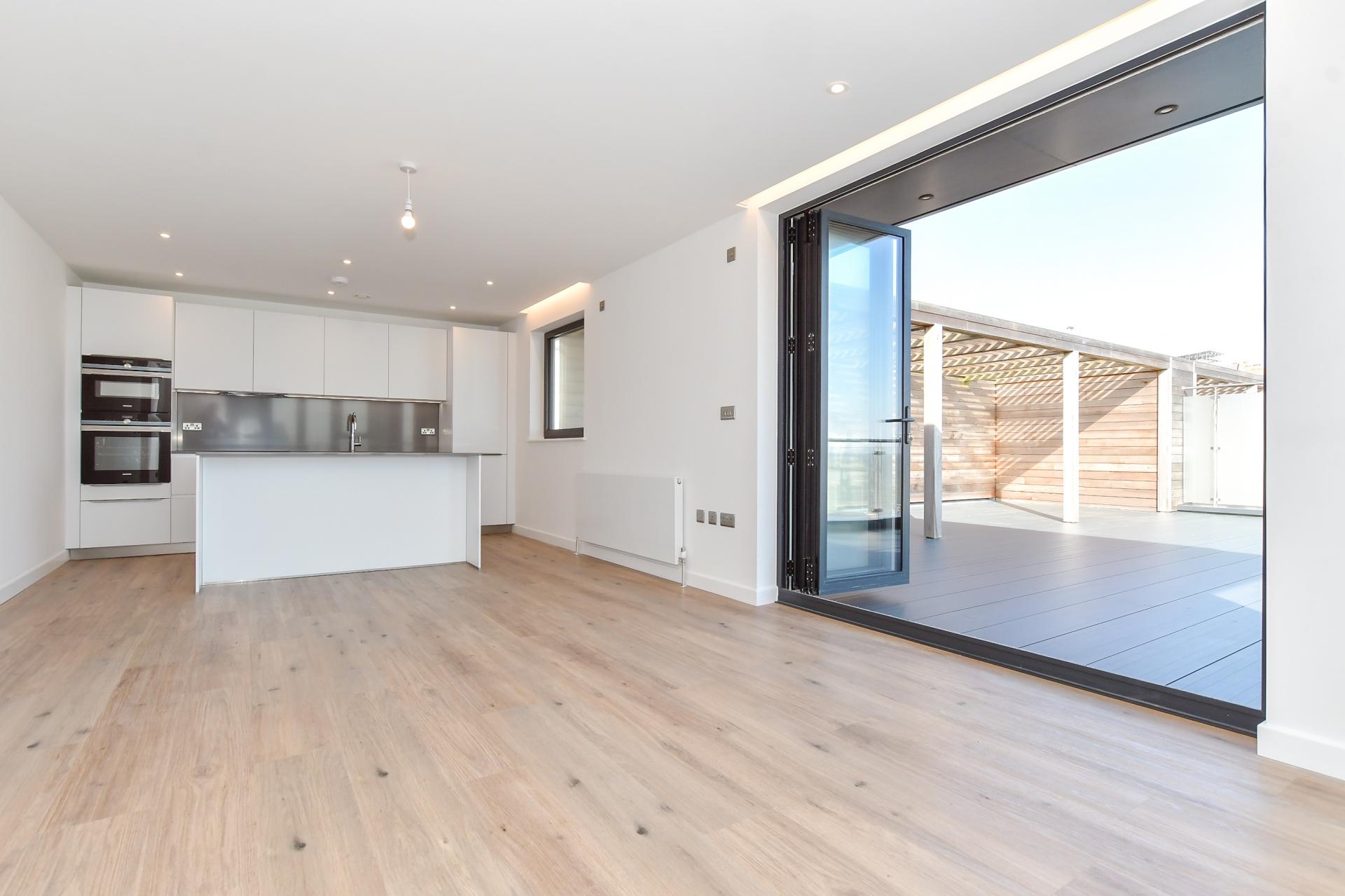 The hall leads to the attractive light and bright open plan living room and kitchen that includes the three black aluminium bi-fold doors to the private roof terrace and French doors to a separate private balcony. The high end kitchen was designed by Smallbone with soft closing units, Stilestone quartz worktops and Siemens appliances including a hob, built in oven and combi microwave and an integrated fridge freezer and dishwasher as well as a central island and a sink with a Quooker tap.