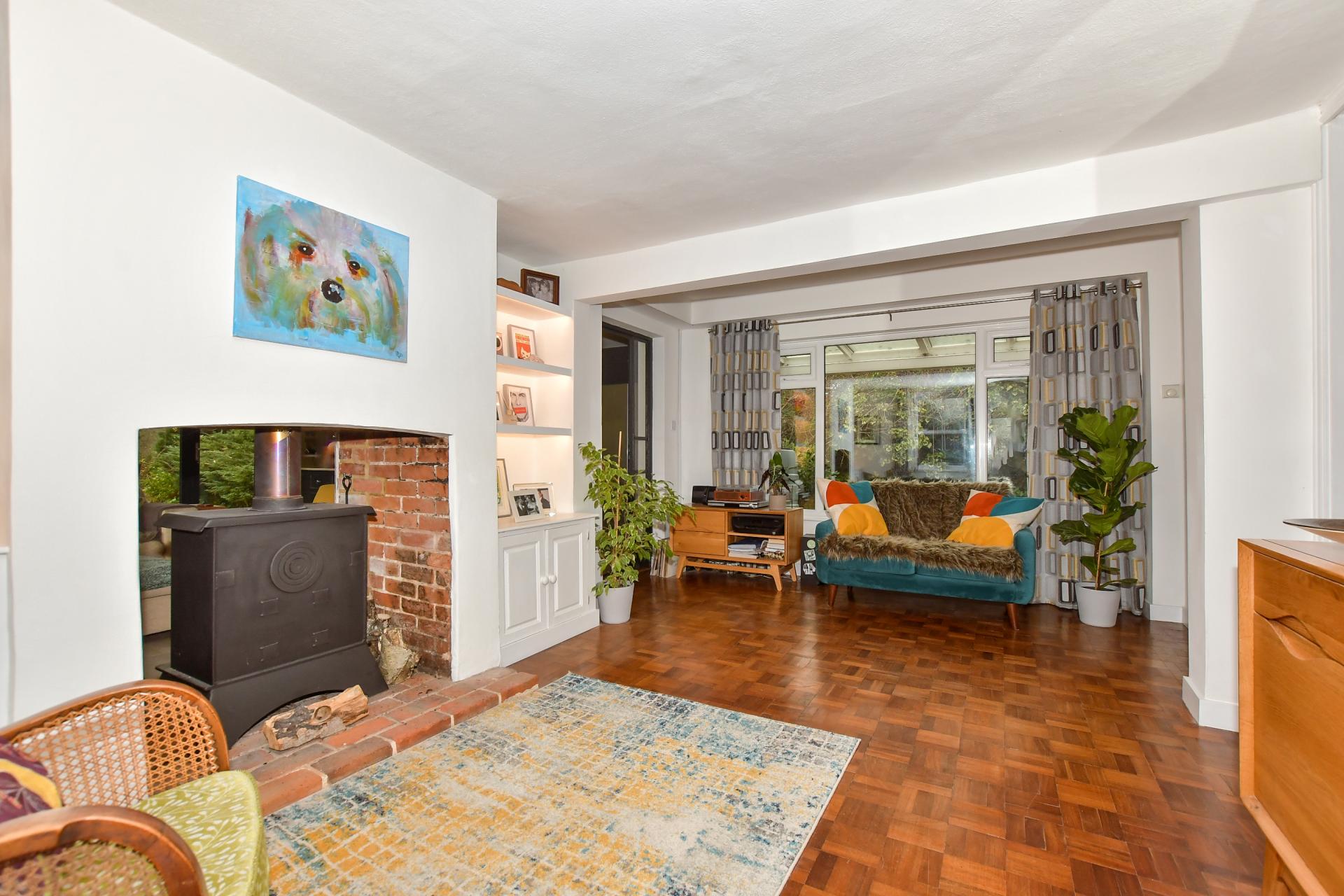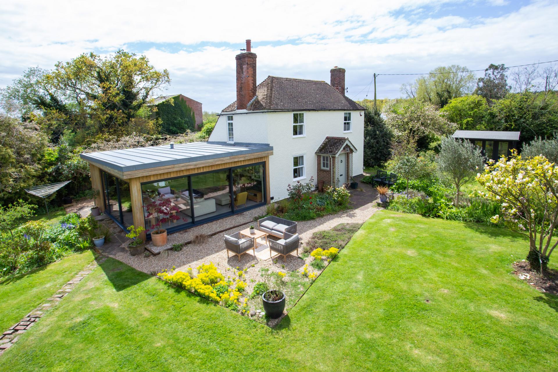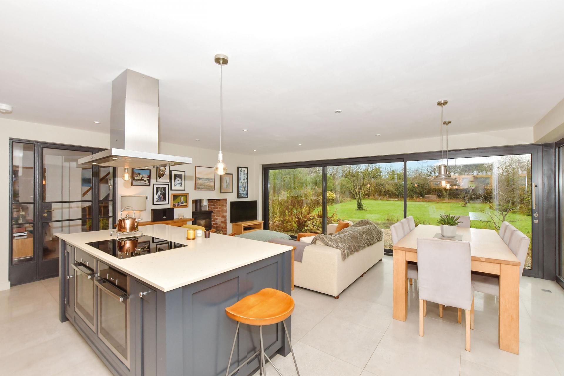 A door leads to the ‘piece de resistance’ of this charming home – the awe-inspiring modern family space that includes kitchen/living room with a zinc roof and two magnificent ‘walls’ of full height windows and sliding glass doors offering superb views over the garden and is where the family spend most of their time. Built as a stunning extension in 2018 the kitchen area includes beautiful bespoke oak units housing stand alone appliances and a delightful island/ breakfast bar with two built in ovens and an induction hob. Guests will enjoy sitting down at the dining table and admiring the views, while the two-way log burner is just the place to cosy up to on a cool winter’s evening. But in the summertime, when the sliding glass doors are wide open, you really do feel as though you are almost living in the garden.