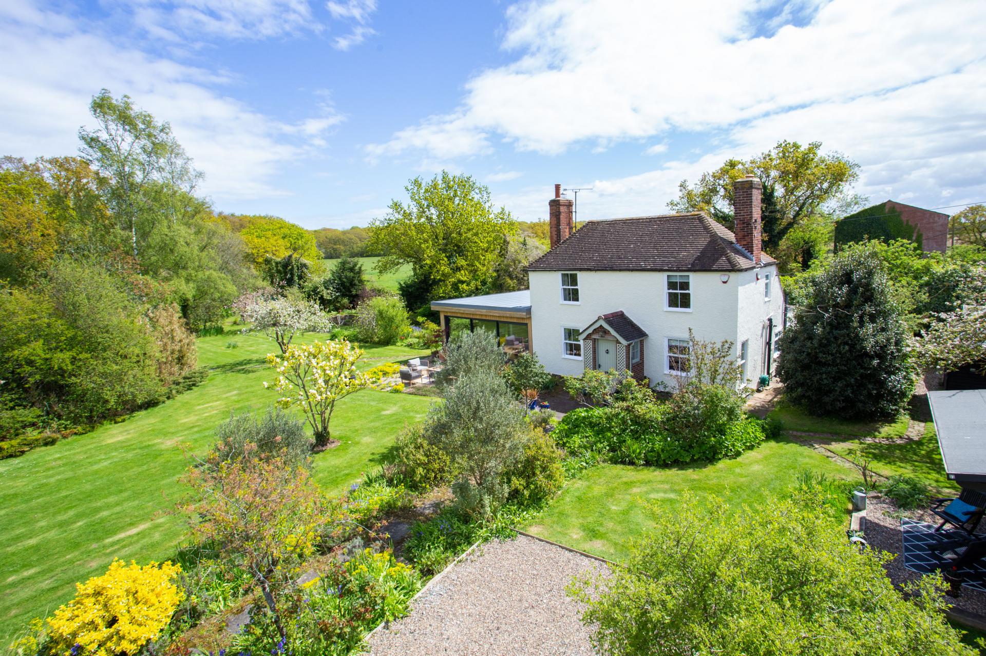 You could be forgiven for thinking you had stepped into a fairytale when you first see this adorable cottage nestling amidst 0.6486 of an acre of secluded grounds on the edge of East Blean Woods and surrounded by farmland. With its central pitched roof porch, period front door, two sash windows on either side and high chimney stacks it looks as though a child has drawn it as their idea of a house and then you take a second look and see it has interesting modern overtones at one side.