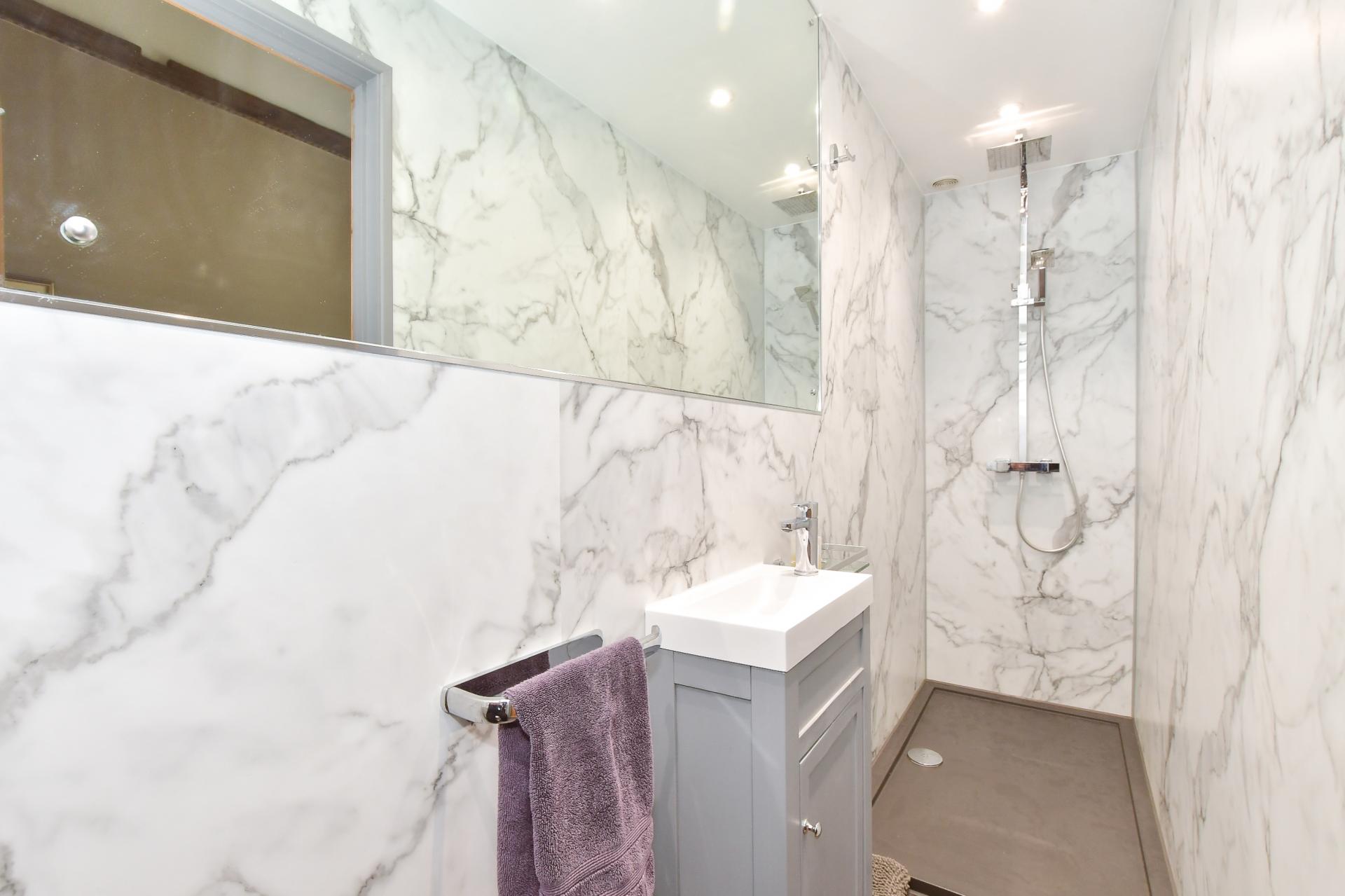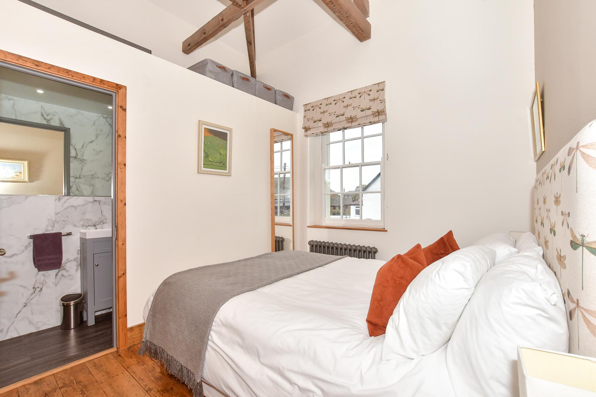 The oak and glass staircase with a feature brick wall leads to two double bedrooms with antique pine flooring and high vaulted ceilings with cross beams. One includes an en suite wet room style shower room and the other is dual aspect with views to the sea, a feature brick wall and an electric log burner style fire. Currently this room is used as a study/music room but it has a pull-down kingsize double bed and a built in cupboard. When the bed is pushed up the underside is white and acts as an excellent film screen and there is built in wiring for a projector for any cinema enthusiasts.