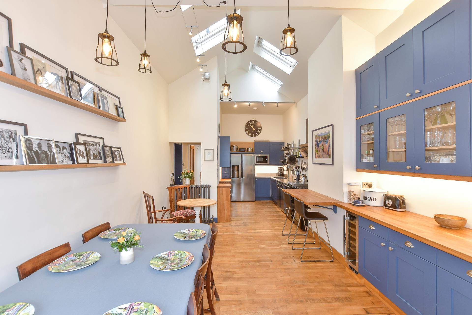 The stunning double height vaulted ceiling contemporary kitchen/diner is awe-inspiring. It includes high Velux windows, bespoke Farrow and Ball Stiffkey blue shaker style units with oak and stainless steel worktops housing built in and stand-alone appliances. There is an oak-topped breakfast bar and plenty of space for a dining table and chairs. This is semi open plan to a stunning orangery with tiled flooring and a wall of impressive full height windows and doors opening onto the charming walled courtyard. The orangery includes a useful storage cupboard.