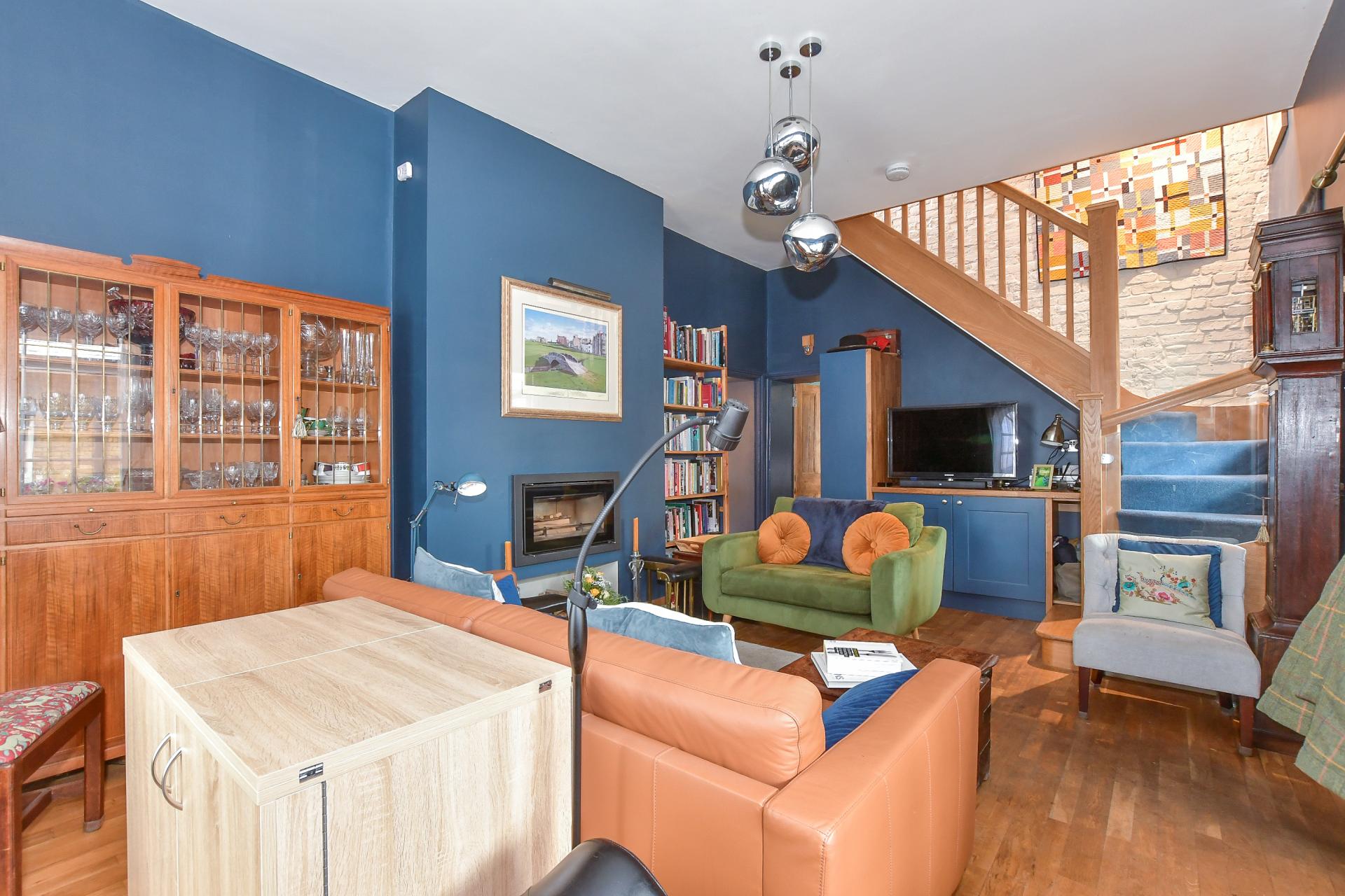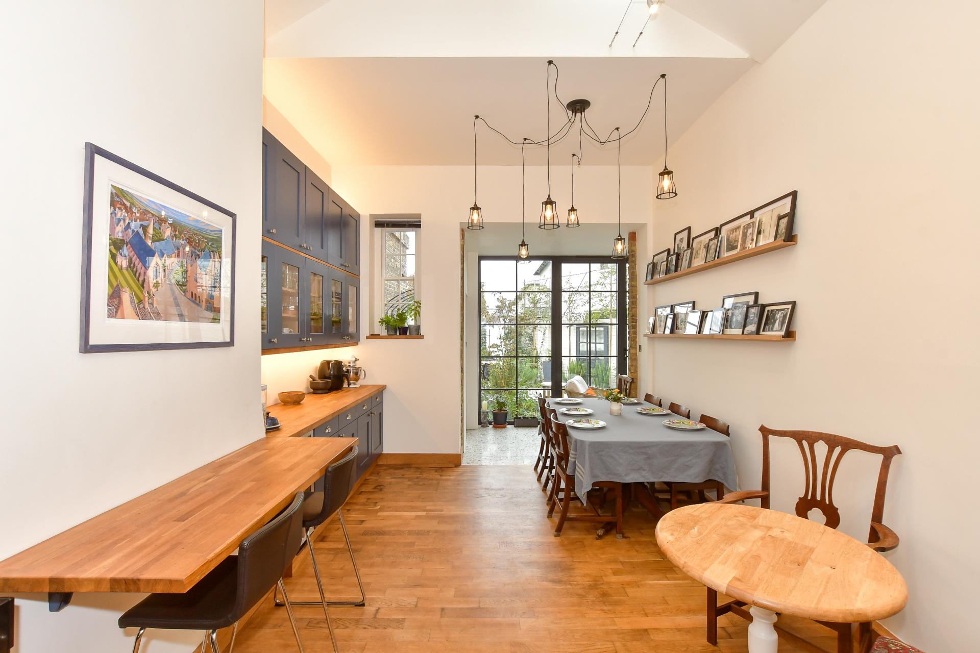 The period front door opens directly into the delightful, dual aspect lounge with oak flooring that flows through most of the ground floor. There is a recently installed staircase to the first floor. There is an arched side window, a tall wine display cabinet and a modern raised log burner, providing a cosy focal point from the moment you walk into the room.