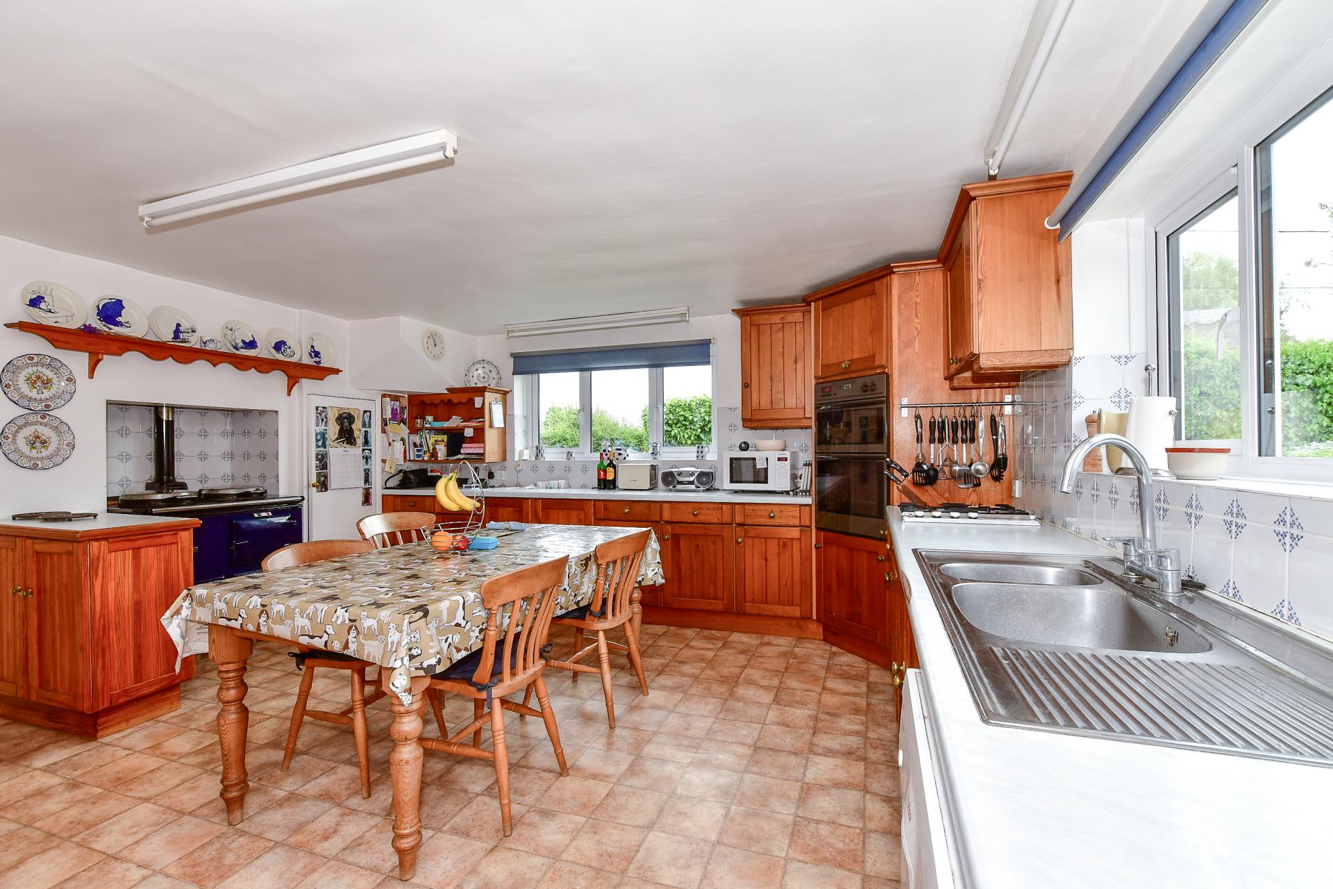From the conservatory there is a door to the delightful dining area incorporating the oldest part of the property with exposed beams, a fireplace and a raised log burning stove and the adjacent dual aspect lounge. There are steps up to the spacious dual aspect country style kitchen/breakfast room with an inset oil-fired Aga, wood units with a built in double oven and a Calor gas hob as well as a variety of stand-alone appliances. There is an adjacent utility room with double shower and cloakroom as well as a very large boot room with a wall of fitted cupboards, providing plenty of storage and a door to the driveway.