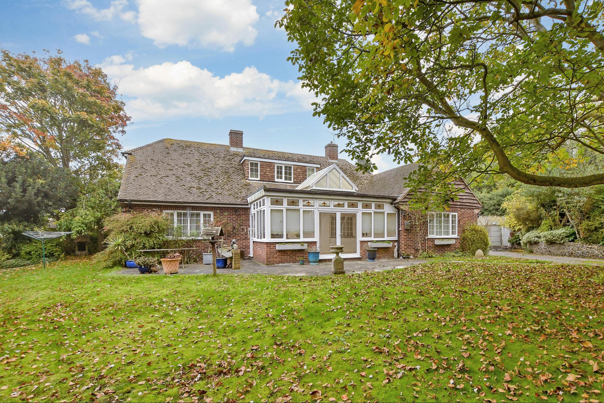 Built in the grounds of the original St Peter’s vicarage after that was demolished in 1963, this large and unique chalet bungalow is a real gem. It has particularly spacious ground floor accommodation, good sized rooms on the first floor and nestles in very large gardens adjacent to the Garden of Rest, so is particularly quiet and peaceful. It is approached down a very long and exclusive drive bordered by an ancient flint wall on one side and hedgerows on the other and leads to a large garden, a parking area and a garage.