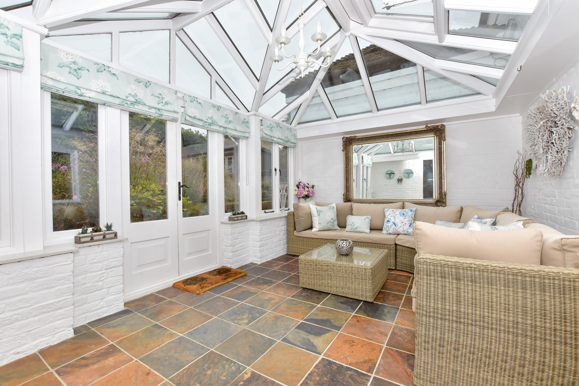 The elegant sitting room, with its bespoke cabinets and shelving, is delightful while the attractive inglenook fireplace with a log burner provides winter warmth and is a charming focal point. It overlooks a large David Salisbury hardwood garden room with slate flooring and French doors to the garden. This is adjacent to the family room that also has slate tiled flooring and bi-fold doors to the garden that would make an excellent games room or separate dining room.
