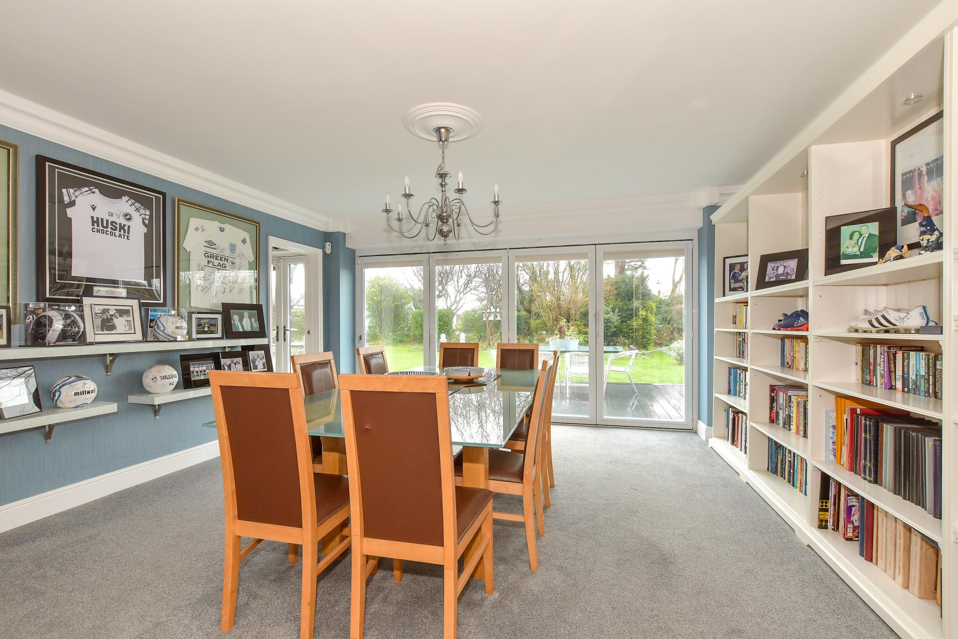 The sliding porch doors open into a porch that leads to the light and bright hall with stairs to the first floor, a large storage cupboard, a downstairs cloakroom with laundry facilities and solid wood flooring that flows through into a spacious family room/fifth bedroom. This is currently designed as a snooker room but could also be a separate dining room, a good sized office or a fifth bedroom.