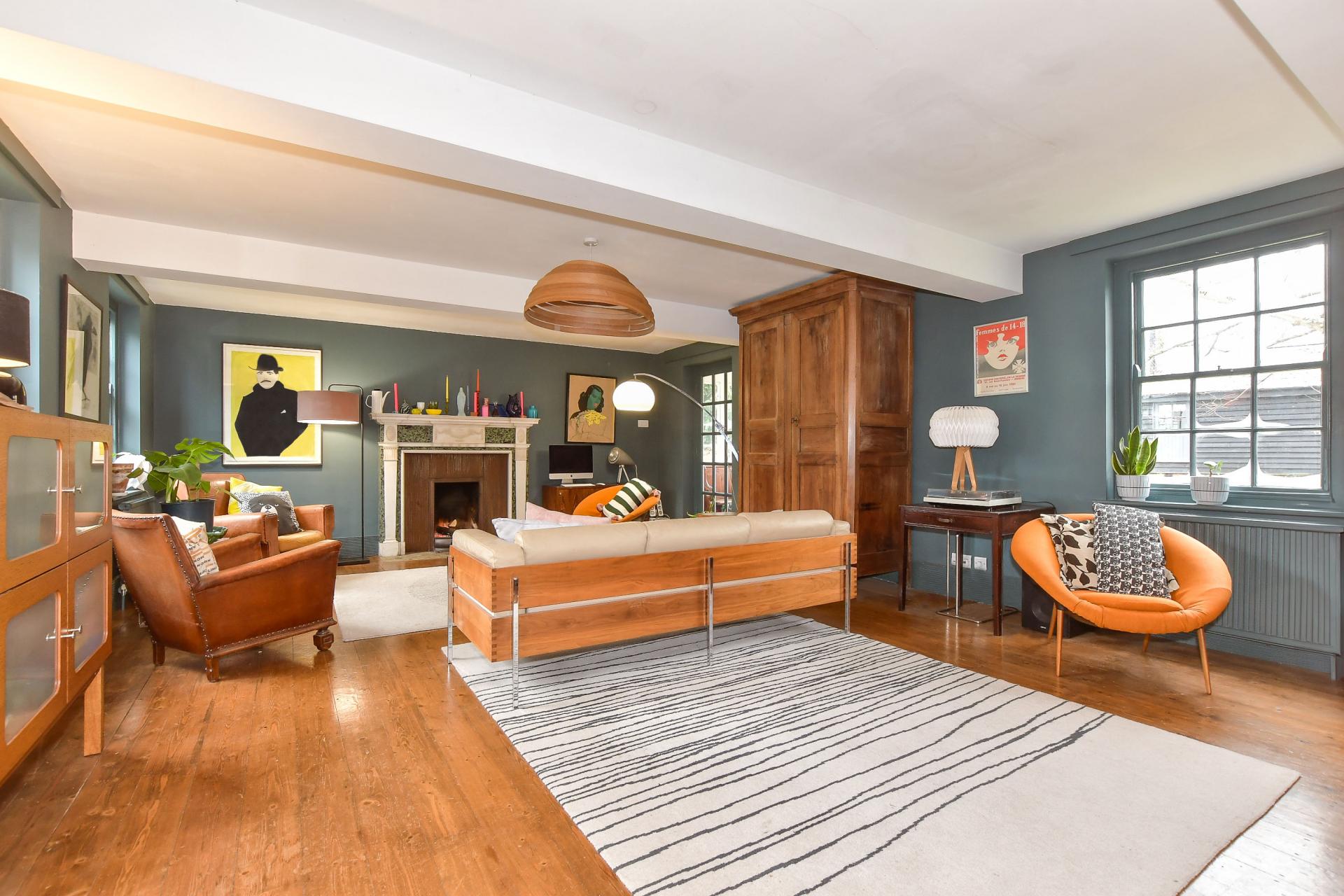 There is a door that leads to the front lobby and the Georgian front door as well as to the elegant dual aspect drawing room with an impressive marble fireplace, a brick insert and a log burner. This room also has original Georgian windows including a charming small arched window, built in shelving and a storage cupboard with sculptured shelves as well as an oak staircase to the first floor that was purported to have come from a mansion in Tunbridge Wells.