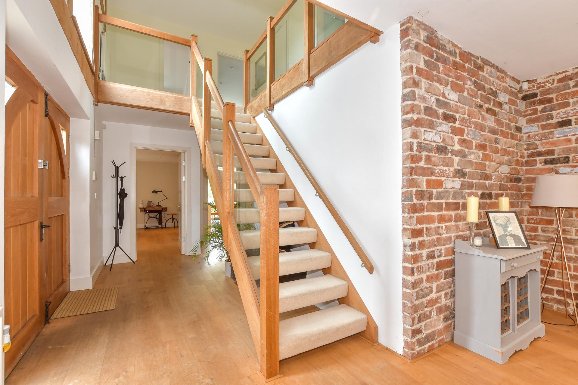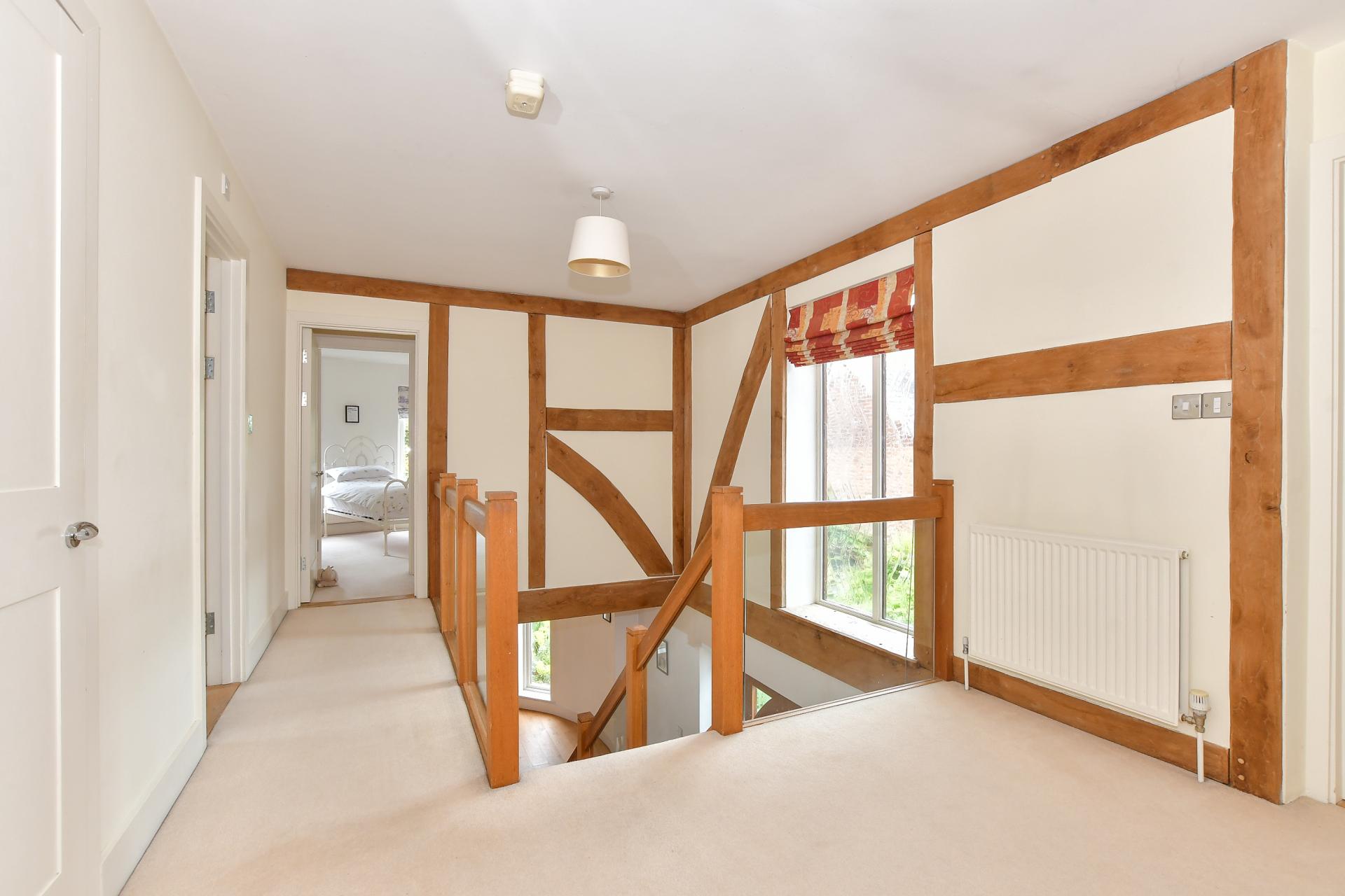 The first floor beamed and galleried landing includes a useful airing cupboard and access to a family bathroom and four double bedrooms. One is dual aspect with a painted wood floor and stunning views, another has a multi-pane casement window and also enjoys the rural views, while the charming circular room in the oast has an ensuite shower as does the spacious principal suite.