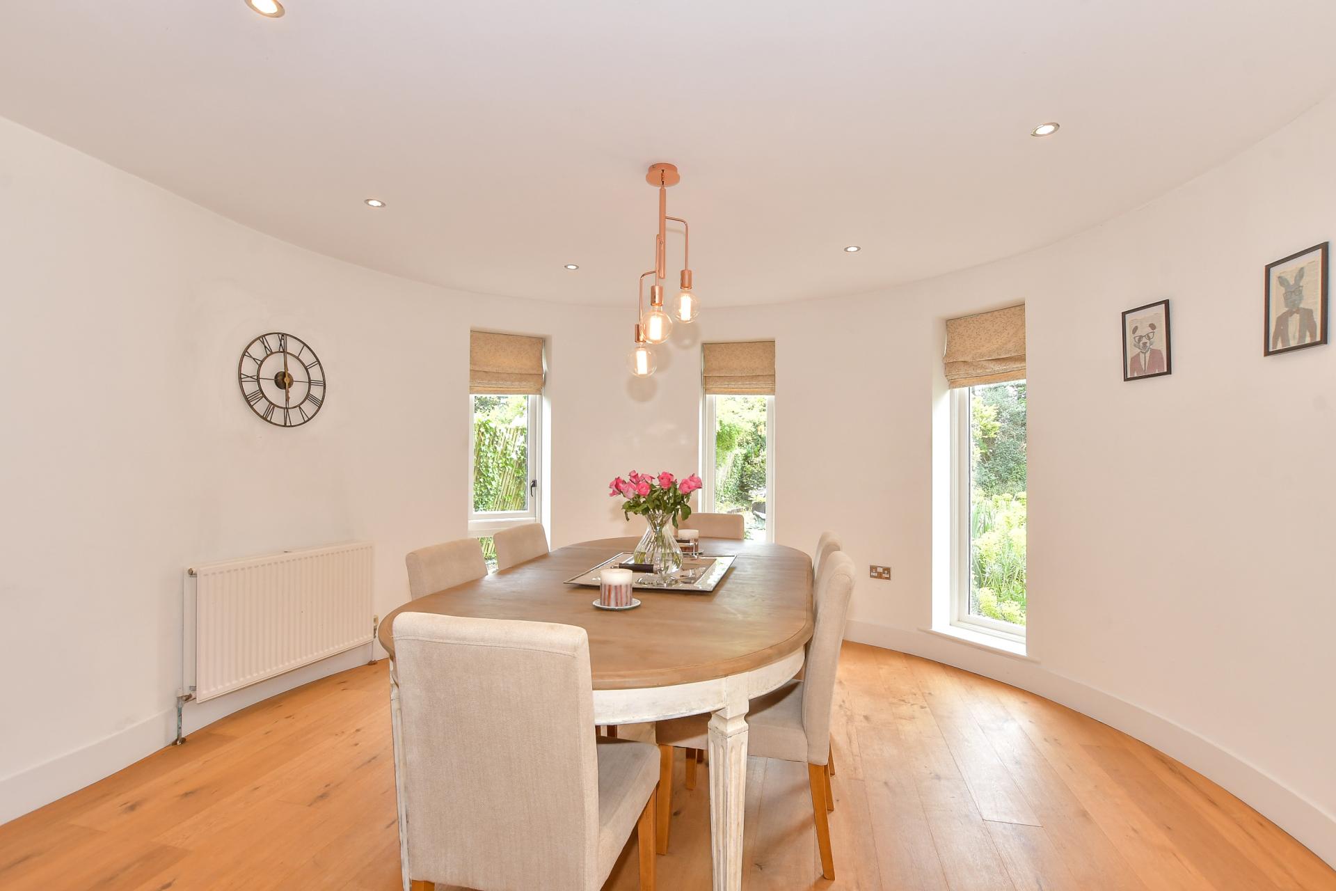 With its conical shaped roof, mellow brickwork, cedar cladding and attractive chimney it is immediately appealing and this is enhanced even further by the beautiful arched oak double front door. This leads to the entrance hall with its engineered oak flooring that flows through much of the ground floor and an open tread staircase with a glass and oak bannister. The hall is open plan to the lovely circular dining area in the oast where friends and family can enjoy the delightful ambiance.