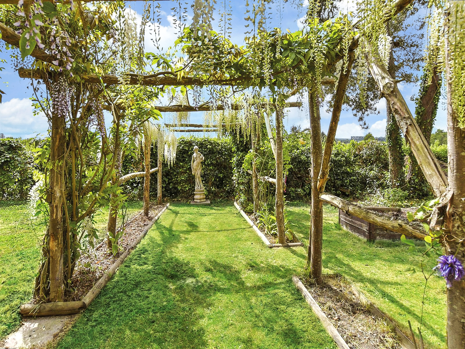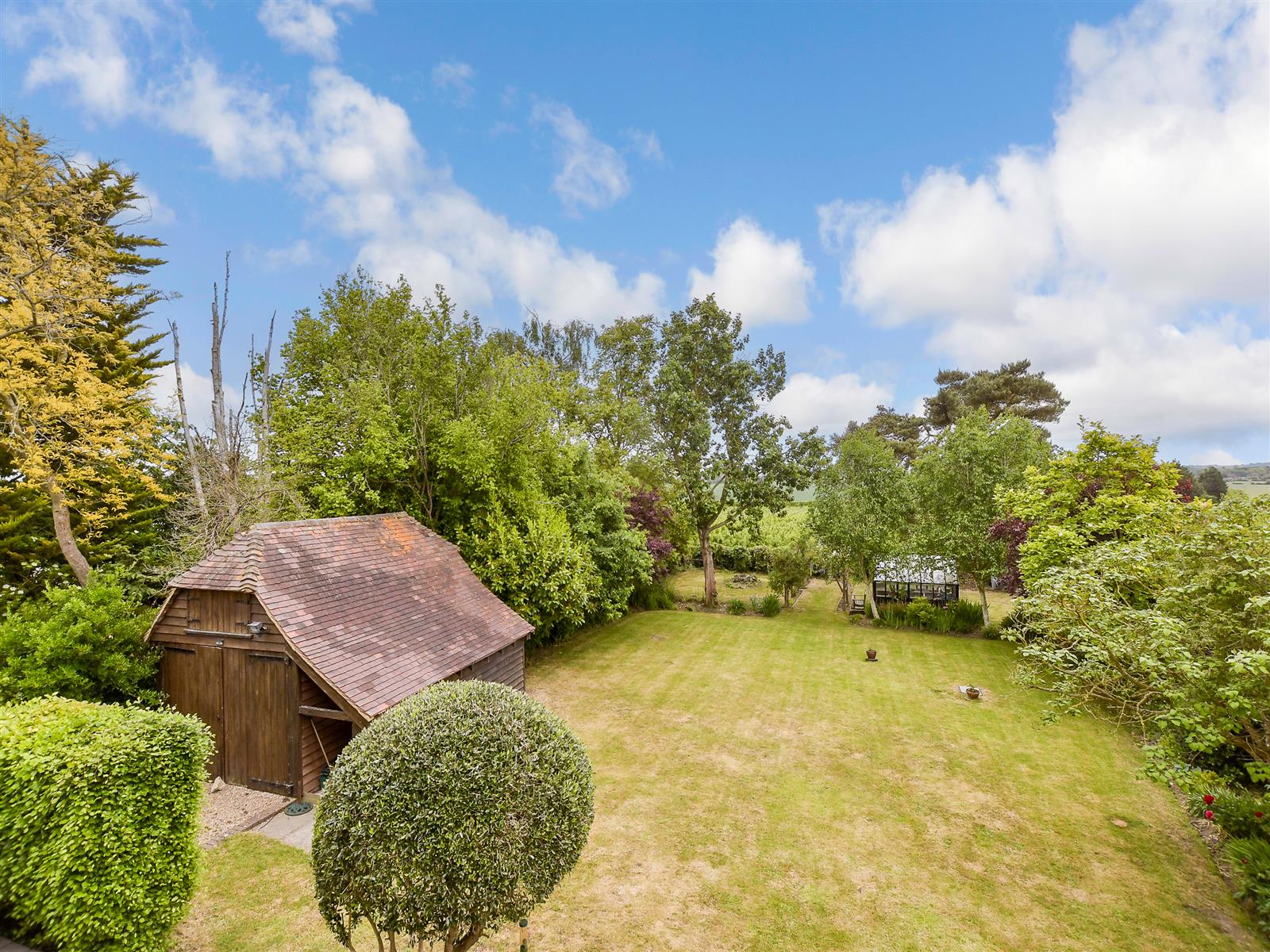 The charming garden includes a terrace that spans the width of the house with a pizza oven/barbecue and is ideal for al fresco dining or just sitting and enjoying the views. There is a wooden oak framed garage with upper storage facilities and a spacious lawn and a pergola covered archway leading to the kitchen garden with a greenhouse, raised vegetable beds and a new storage shed that backs onto orchards.
