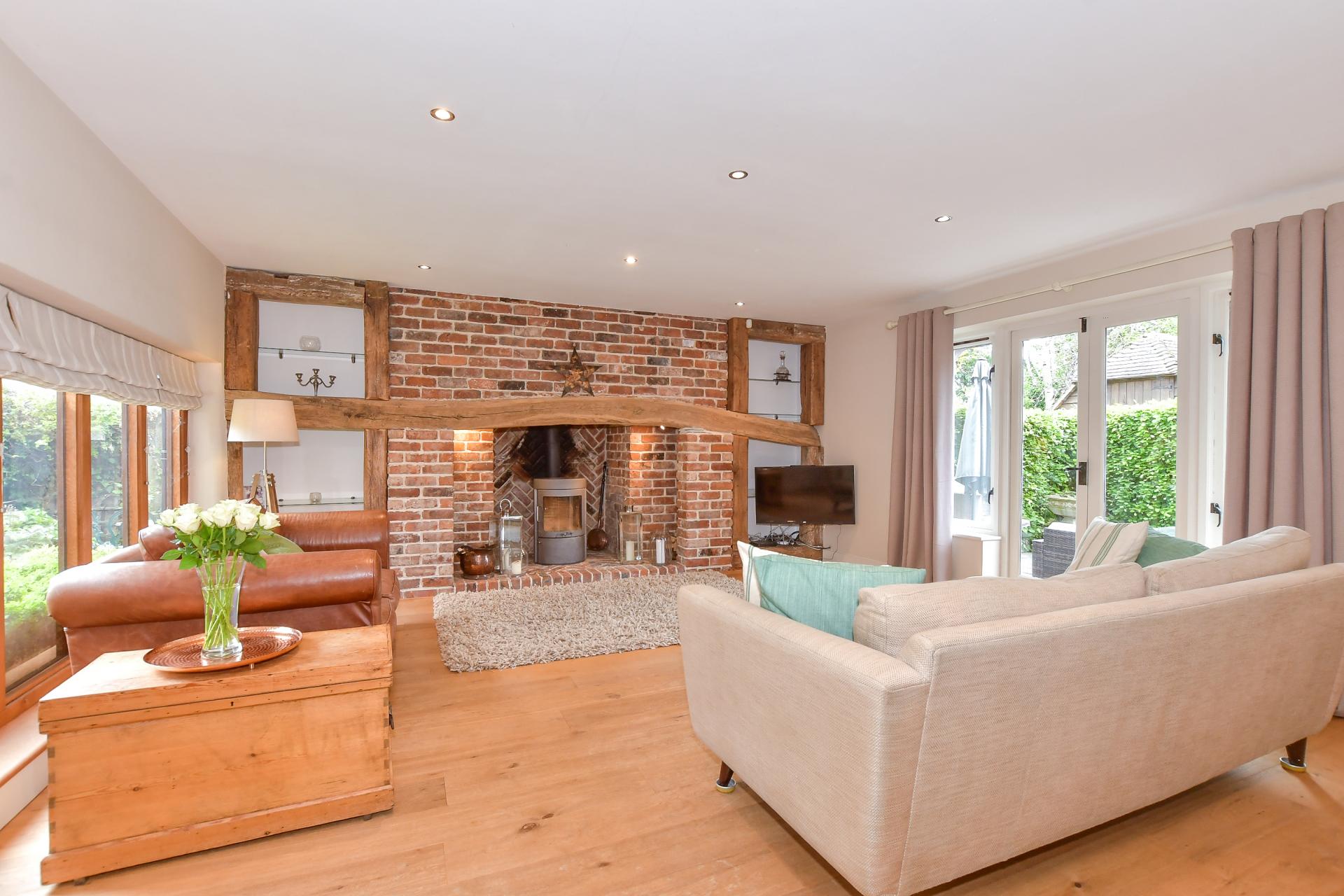 There is a gorgeous dual aspect lounge with inset ceiling lights, a feature brick wall and an inglenook fireplace with a contemporary Swedish log burner. The fireplace is flanked by beamed shelving and includes an impressive Bressummer beam that spans the width of the wall and is believed to have come for an old ship. This floor also includes a cloakroom and a utility room as well as a study with a feature brick wall currently in use as a gym.