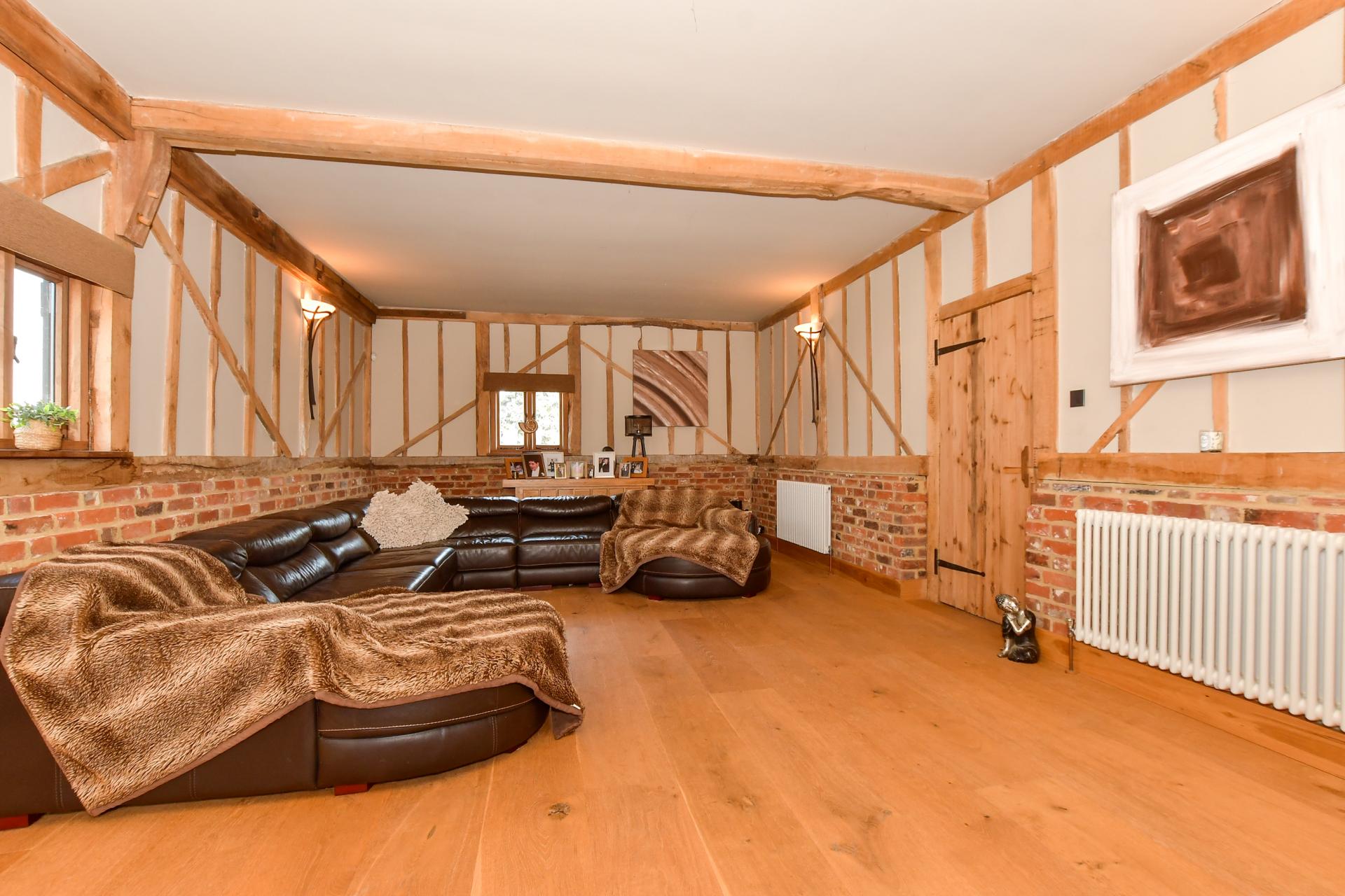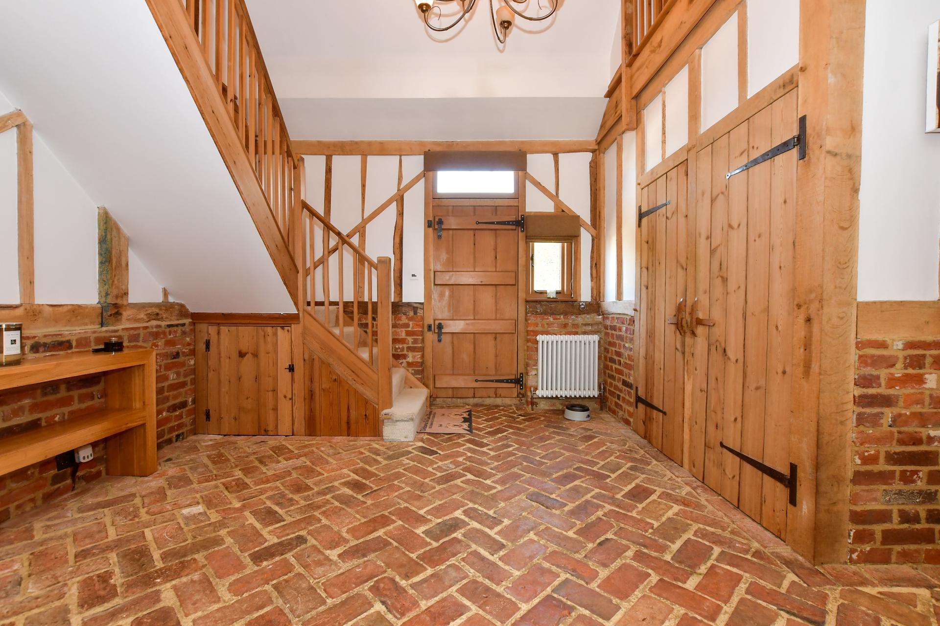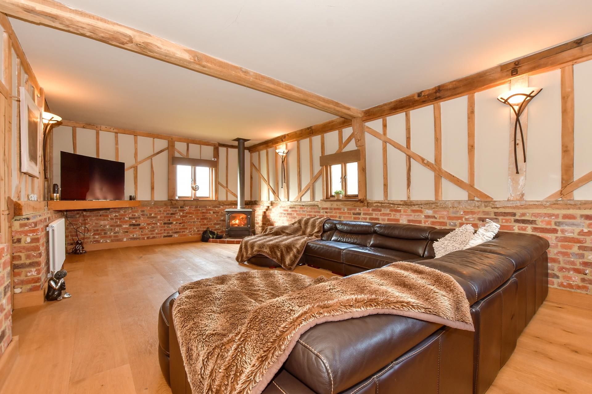 It has a delightful original brickwork and traditional clapboard exterior and is approached through a gated entrance that leads onto a gravel driveway and round to a double carport with a guest suite above. There are steps up to the charming front door that opens into a warm and welcoming, partially double height entrance hall with exposed beams and half height brick walls, the original herringbone brick floor tiles, stairs to the first floor and an understairs cupboard, lovely pine doors, access to a large store cupboard and a cloakroom as well as an open archway to the snug. Virtually all the rooms in the original barn feature exposed beams including the snug that also has wood flooring while the characterful triple aspect sitting room has half height brick walls with wall beams and a dual fuel burner.