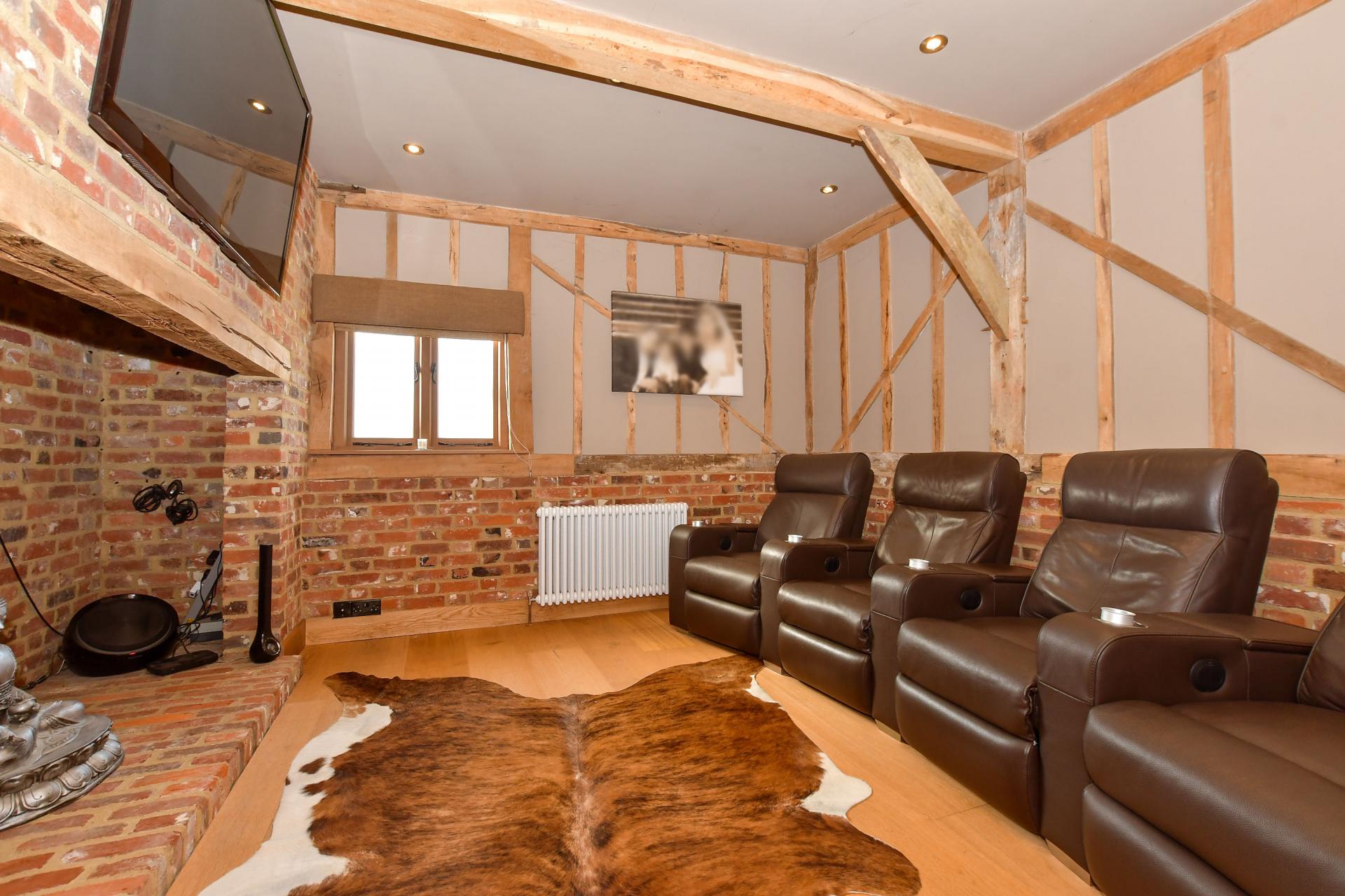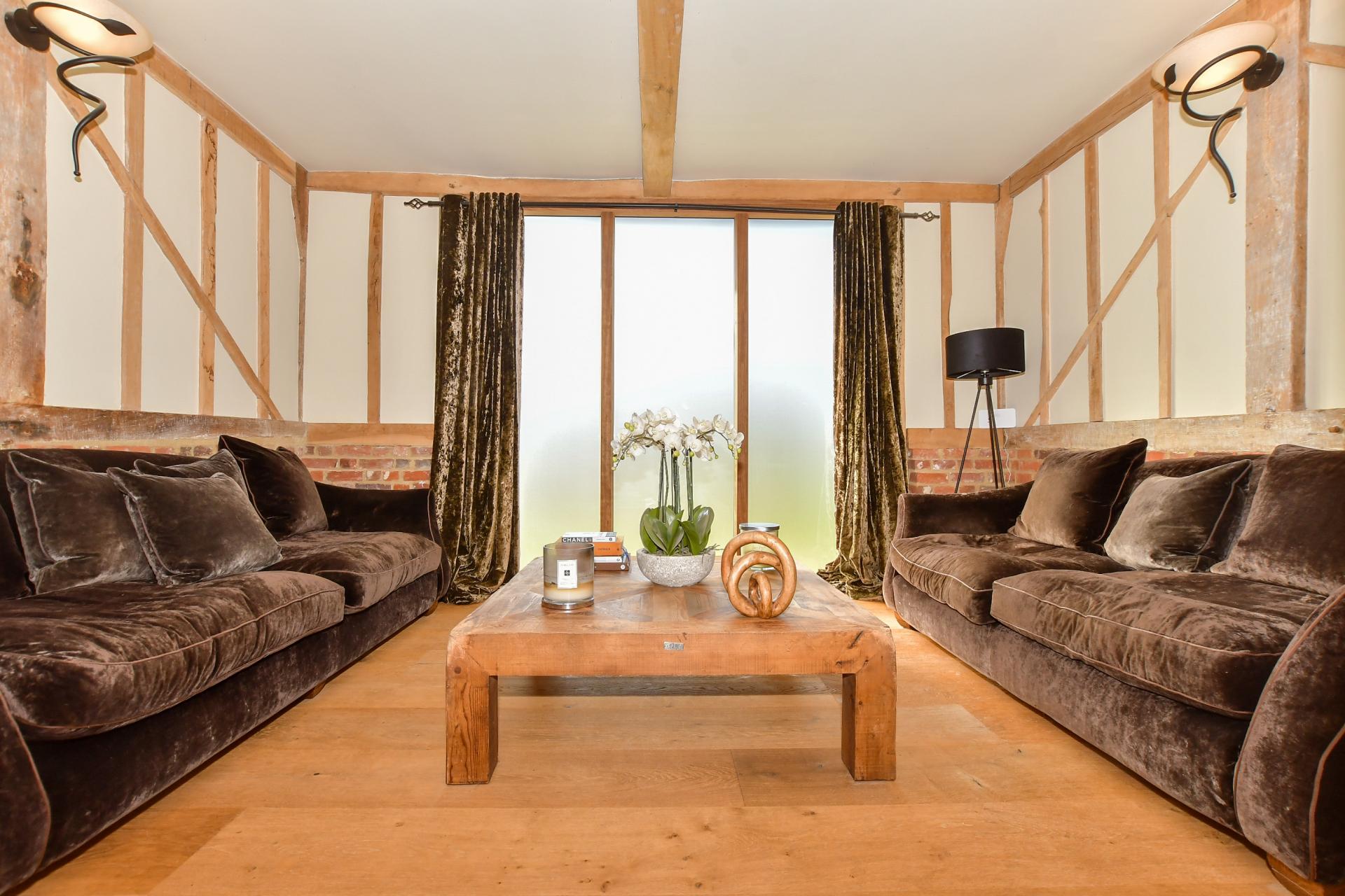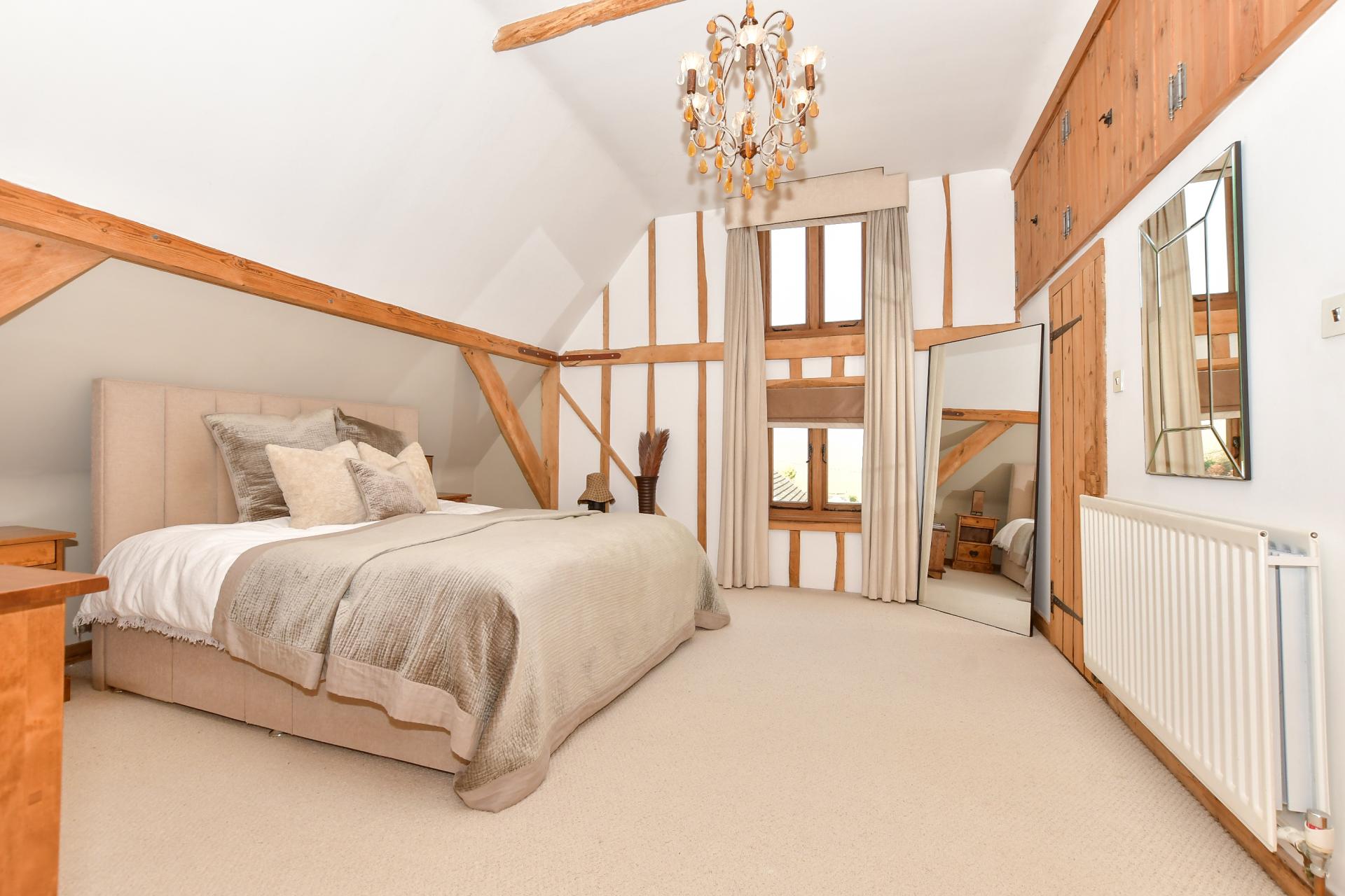 It has a delightful original brickwork and traditional clapboard exterior and is approached through a gated entrance that leads onto a gravel driveway and round to a double carport with a guest suite above. There are steps up to the charming front door that opens into a warm and welcoming, partially double height entrance hall with exposed beams and half height brick walls, the original herringbone brick floor tiles, stairs to the first floor and an understairs cupboard, lovely pine doors, access to a large store cupboard and a cloakroom as well as an open archway to the snug. Virtually all the rooms in the original barn feature exposed beams including the snug that also has wood flooring while the characterful triple aspect sitting room has half height brick walls with wall beams and a dual fuel burner.