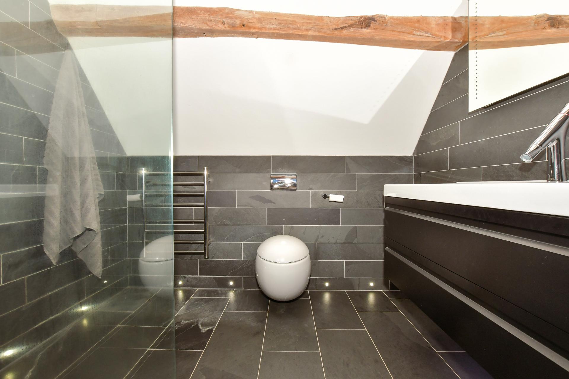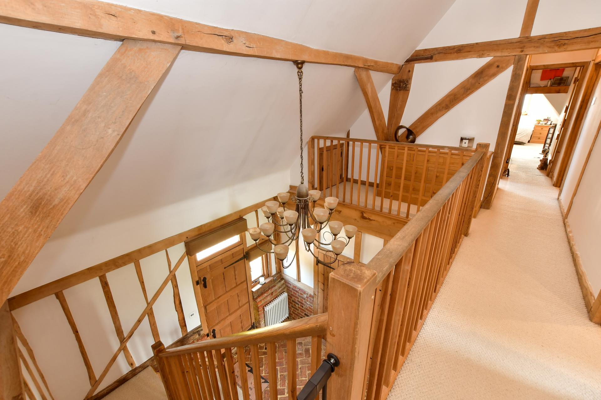 Off the beamed and galleried landing there is a family shower room with a trendy vanity basin and four double bedrooms with far reaching rural views. These include the main bedroom with a high vaulted ceiling, charming beams framing the bed, an ensuite bathroom and a walk-in dressing room/wardrobe. Another has a vaulted ceiling and an ensuite bathroom and the other two have built in cupboards.