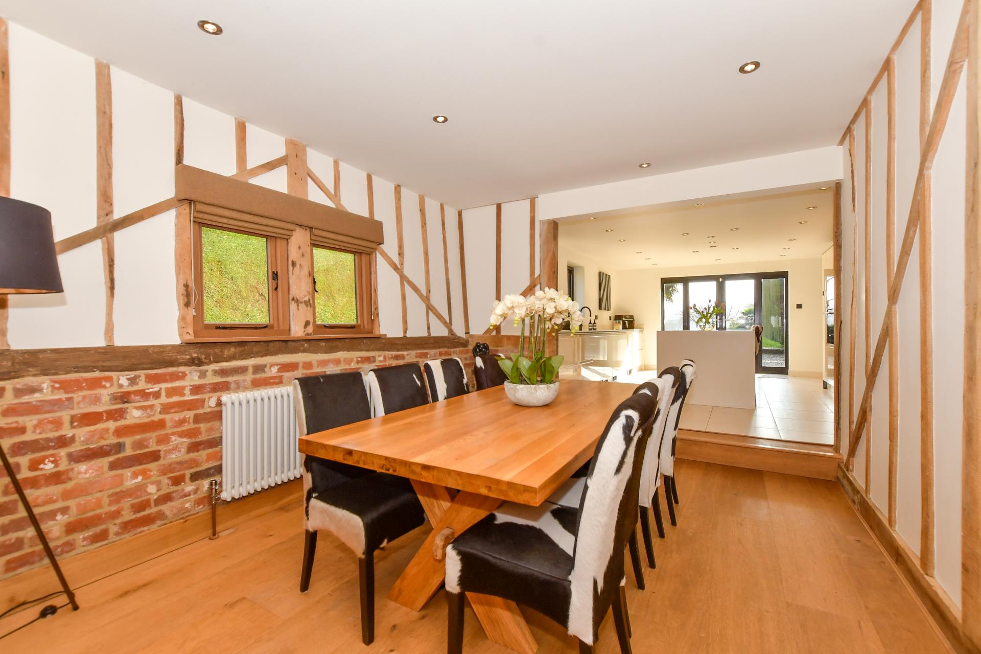 The spacious and contemporary light and bright dual aspect kitchen/breakfast room is in the modern extension and includes French doors and full height side windows that open onto the driveway. There are a plethora of flat fronted units with Corian worktops housing a built in oven, steamer, combi microwave and two warming drawers as well as an integrated freezer and dishwasher, space for an American fridge/freezer, a Quooker tap and a central island/breakfast bar with an induction hob and two wine fridges. There is an adjacent utility room with laundry facilities and a wide arch with steps down to the dining area. Family and friends will love to sit down to a meal in this gorgeous room with its brick and beamed walls while the family room with its impressive inglenook fireplace is just the place to relax. Alternatively this room would make a delightful office for anyone working from home.