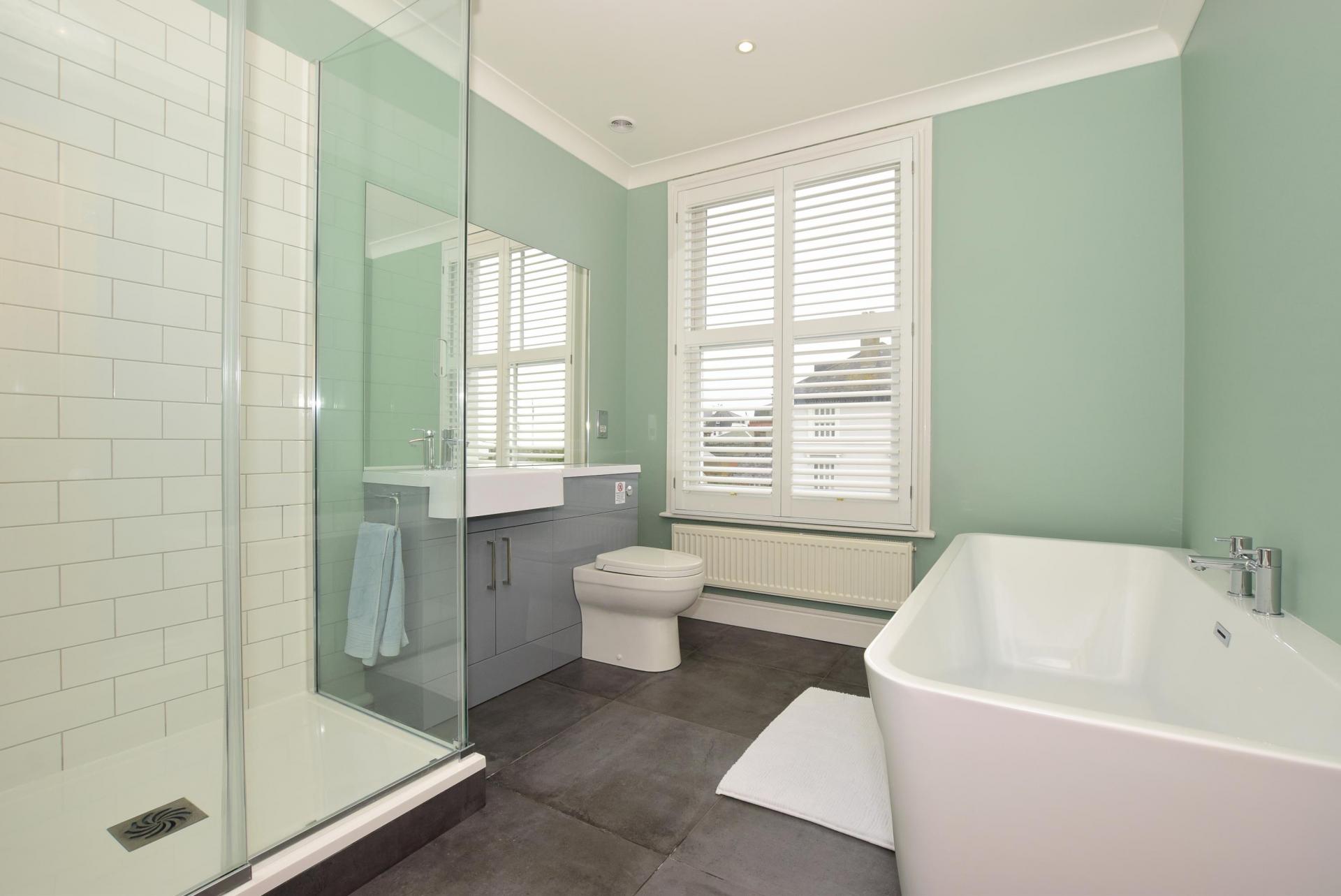 On the lower ground floor there is a cloakroom and a well-proportioned dining room with a bay window, a fireplace flanked by half height cupboards, additional period features and external French doors to the front of the property. Next door is the large contemporary kitchen with attractive slate flooring, a Rangemaster cooker and shaker style units with granite worktops incorporating a dishwasher while the adjacent utility room includes stand-alone appliances, a new tank and boiler cupboard as well as a door to the rear garden.