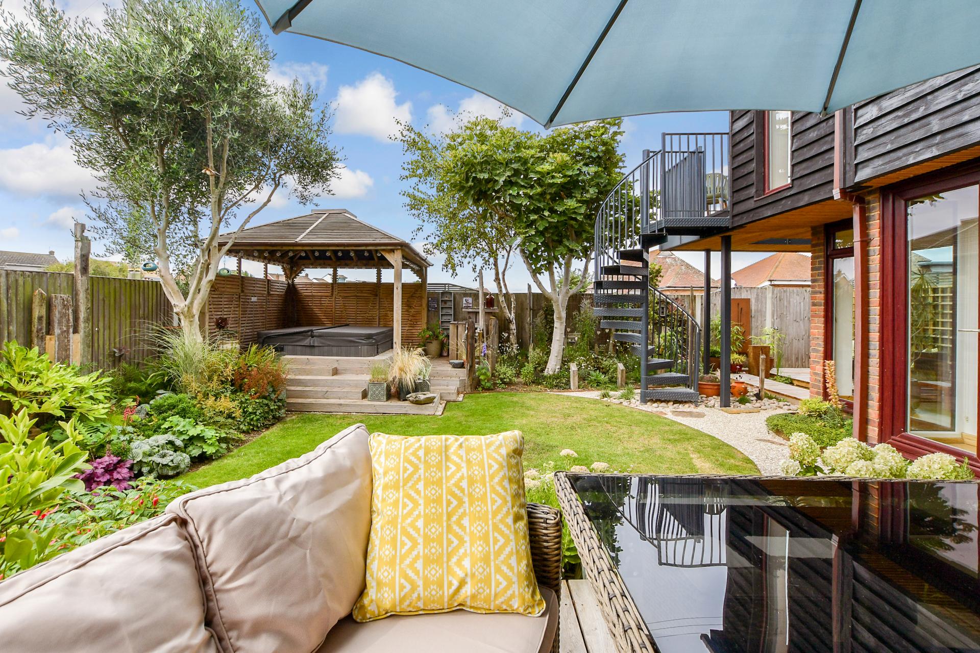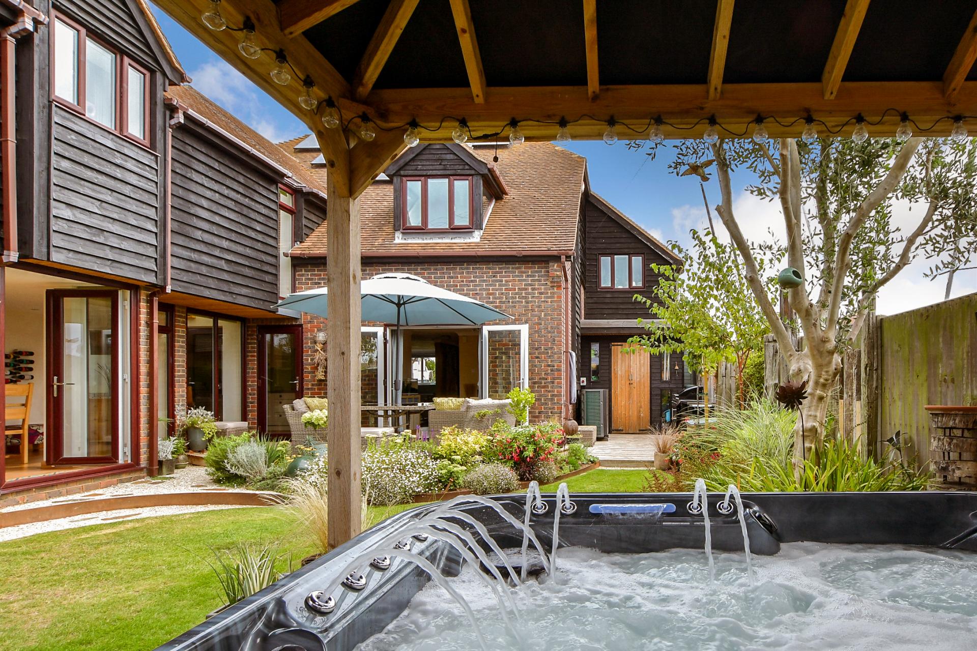 The garden is a particularly charming aspect of this property. As well as decked steps leading up to the covered hot tub there is a partially covered oak decked courtyard area with a charming water feature surrounded by pebbled plantings and a gate providing rear access to the beach and where you can sit if the weather is inclement. There is also a curved border with colourful shrubs and decking that continues around the side of the property to a spacious barbecue spot with double doors to the bike shed at the back of the garage.