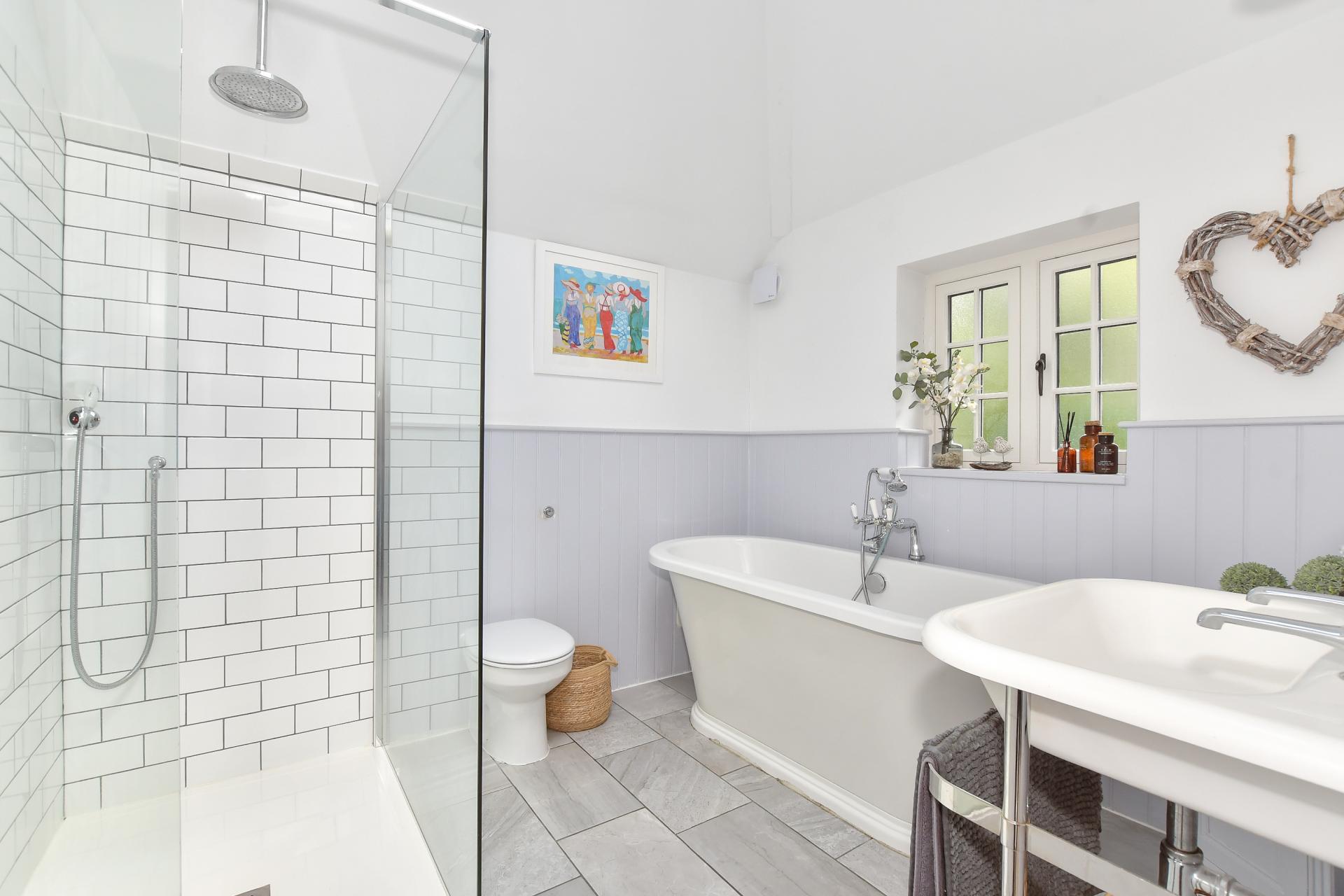 Walking up the stairs to the first floor beamed and galleried landing you are in for a surprise. Because directly in front of you is a well fitted study with French doors that open onto a terrace leading to the upper garden lawns. This floor also includes a contemporary luxury family bathroom with a stand-alone oval bath and separate walk-in shower.