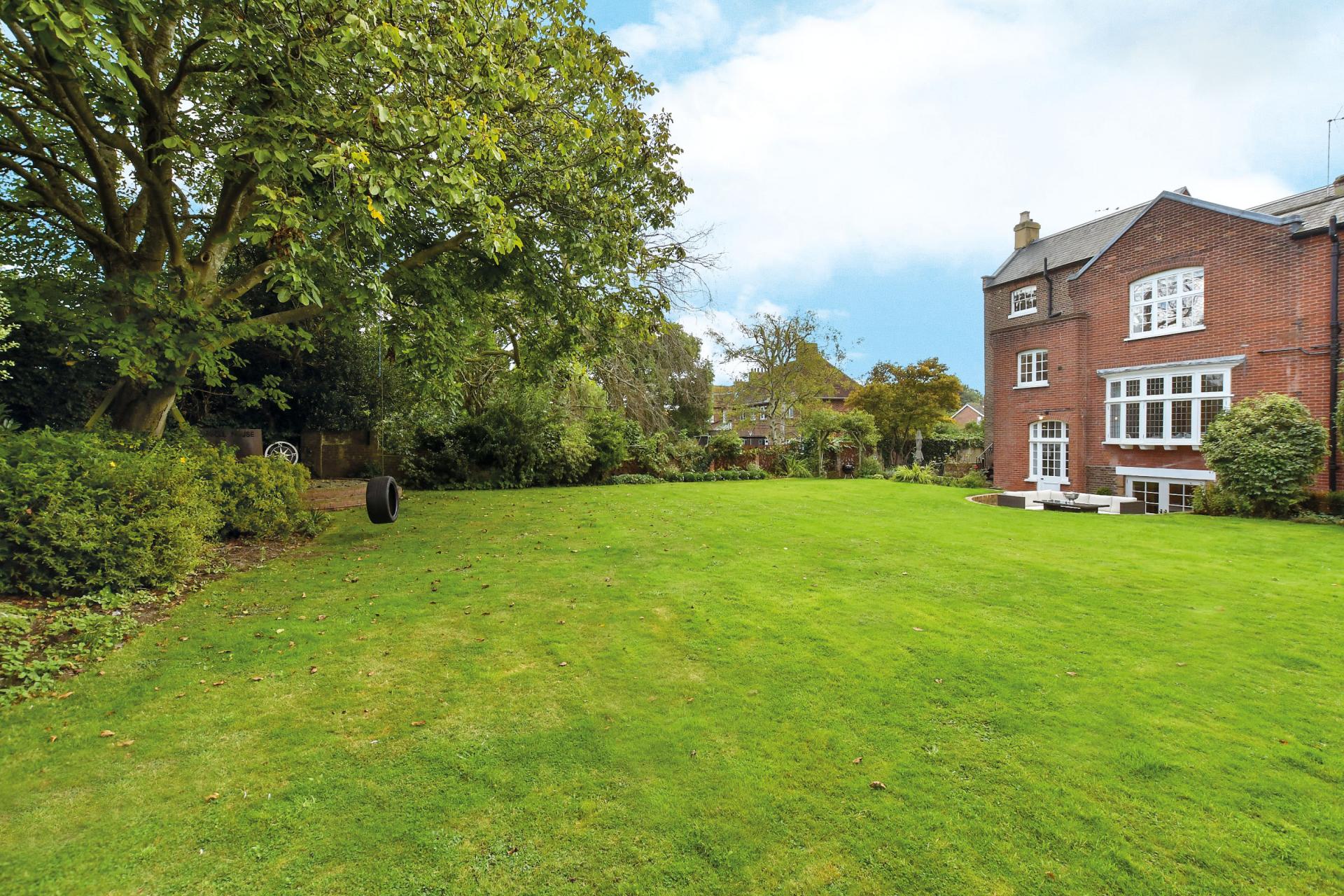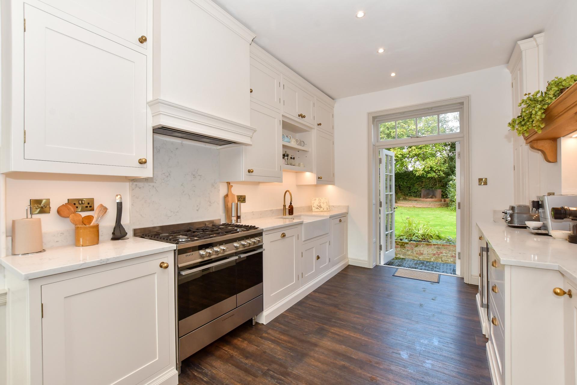 The front door opens into the hallway with the original staircase, wall panelling and Amtico flooring that flows through much of the ground floor. The delightful dual aspect kitchen and dining area includes built in shelving in the dining area, while the beautifully fitted kitchen has a range cooker with a high powered extractor and stylish cream units housing a dishwasher, drinks fridge, space for an American fridge freezer, a built in cupboard with power for a concealed microwave and a Quooker boiling water tap as well as French doors with steps down to the large porcelain tiled rear terrace.
