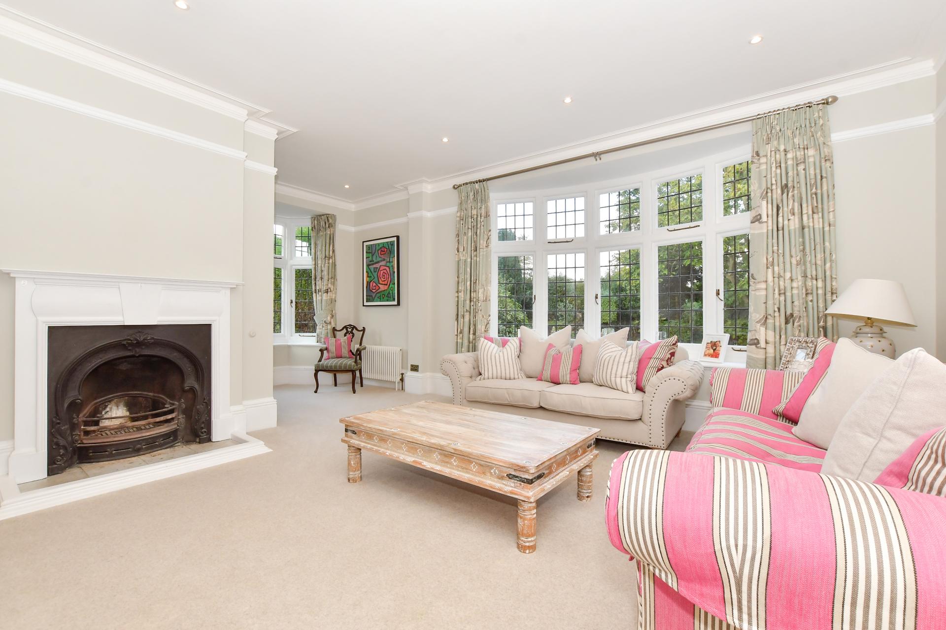 A spacious study with original floorboards, fitted cupboards and a fireplace flanked by inset arches, is located at the front of the property. This has views over the front entrance and is ideally situated for anyone working from home as it provides easy access for business visitors. Steps and an archway lead through a small lobby area to the very impressive dual aspect living area with its original leaded windows and a wide arch to a separate area with a charming deep bay window. A second deep bay window provides space for a small desk with a further wide sill offering delightful views over the garden through an extended bay.