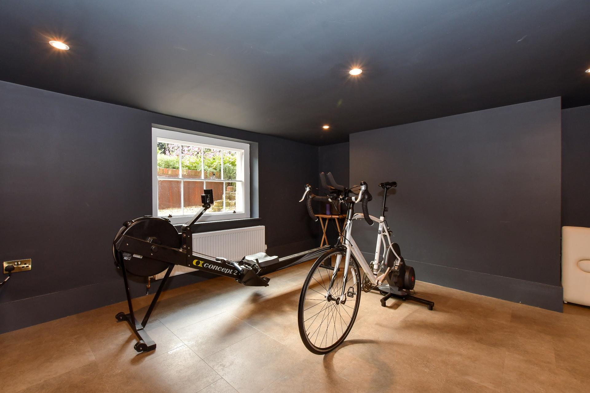 An attractive fireplace with a cast iron inset and marble hearth acts as a delightful focal point and you can cosy up to the open fire on a cool winter’s evening. At the far end of the hall there is a door with original steps down to a cloakroom and toilet as well as a door to the garden. Stairs lead to the large lower ground floor, where you will find a spacious utility room housing the boiler and large water tank, and plumbing for a butler’s sink. A large games room features a spring water well and water treatment facility, allowing for the home to be self-sufficient as far as water supply is concerned. This floor also includes a further entertainment room/gym, store room, potting shed/flower arranging room, and various storage facilities with access to the driveway.