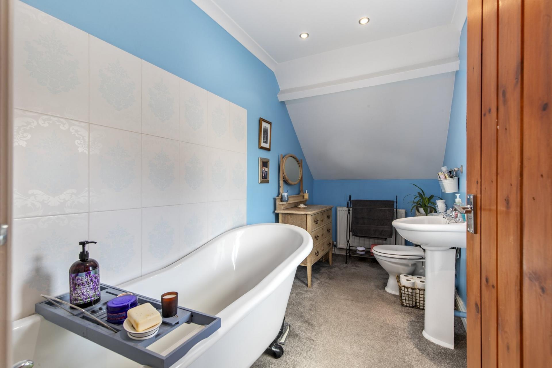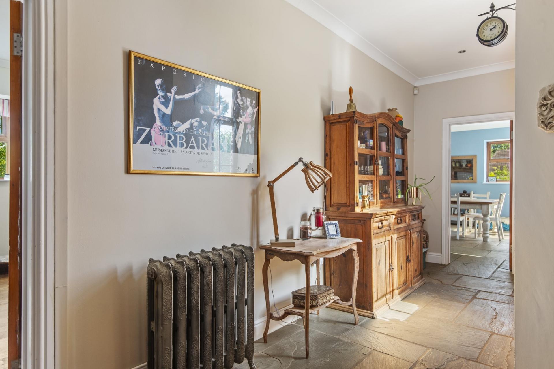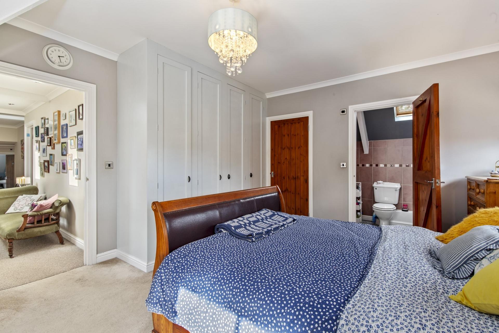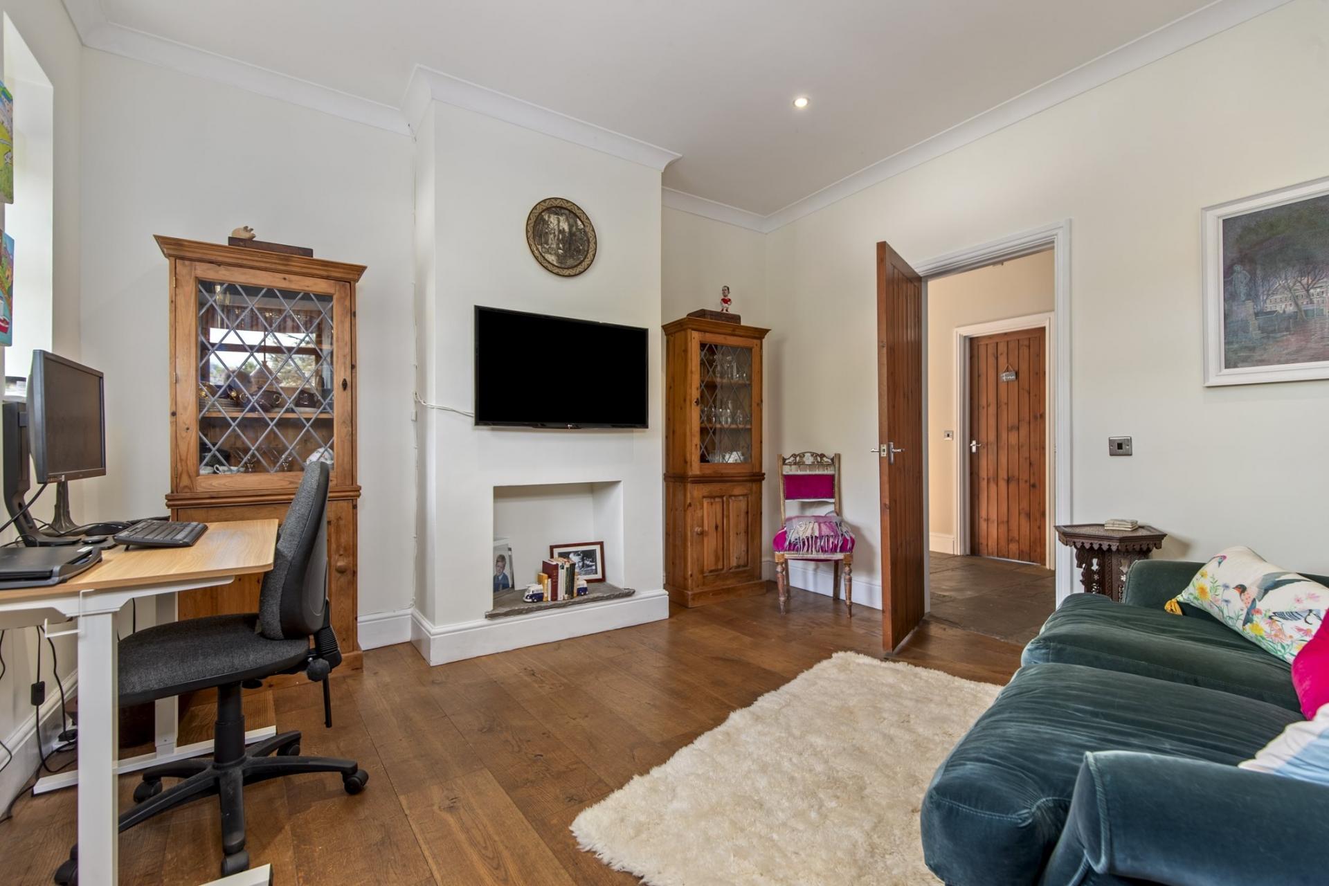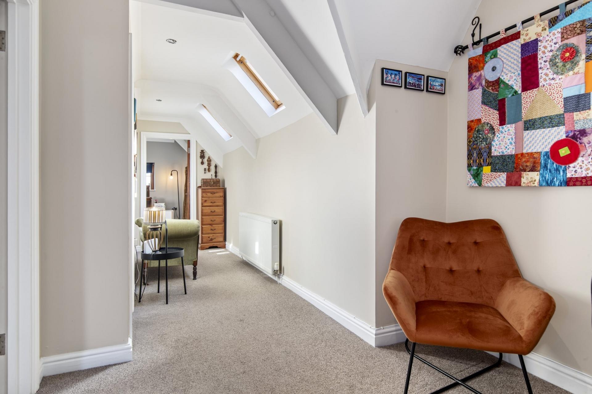 The ground floor continues with flagstone floors leading to a grand arched wooden front door, a cloakroom, and two reception rooms. The larger of the two features a cosy log burner, original wooden flooring, and French doors opening onto the gardens. Upstairs, the spacious landing is perfect for a home office, while four generously sized bedrooms include a master suite with built-in wardrobes and an en-suite. The luxurious family bathroom, complete with a roll-top bath, enhances the timeless character of this exceptional home.