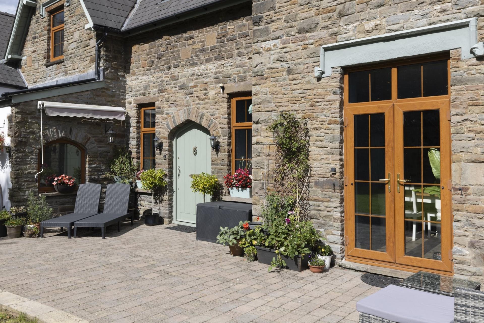 Outside - As you approach Wentloog Lodge, you'll find it nestled along Mill Lane, a peaceful, private no-through road, known for its exclusive properties. The home sits to the left, offering ample parking for up to three vehicles. Entering through the gate, you're welcomed by a beautifully paved patio that runs the length of the house, perfect for soaking up the sun and enjoying alfresco dining on summer evenings.