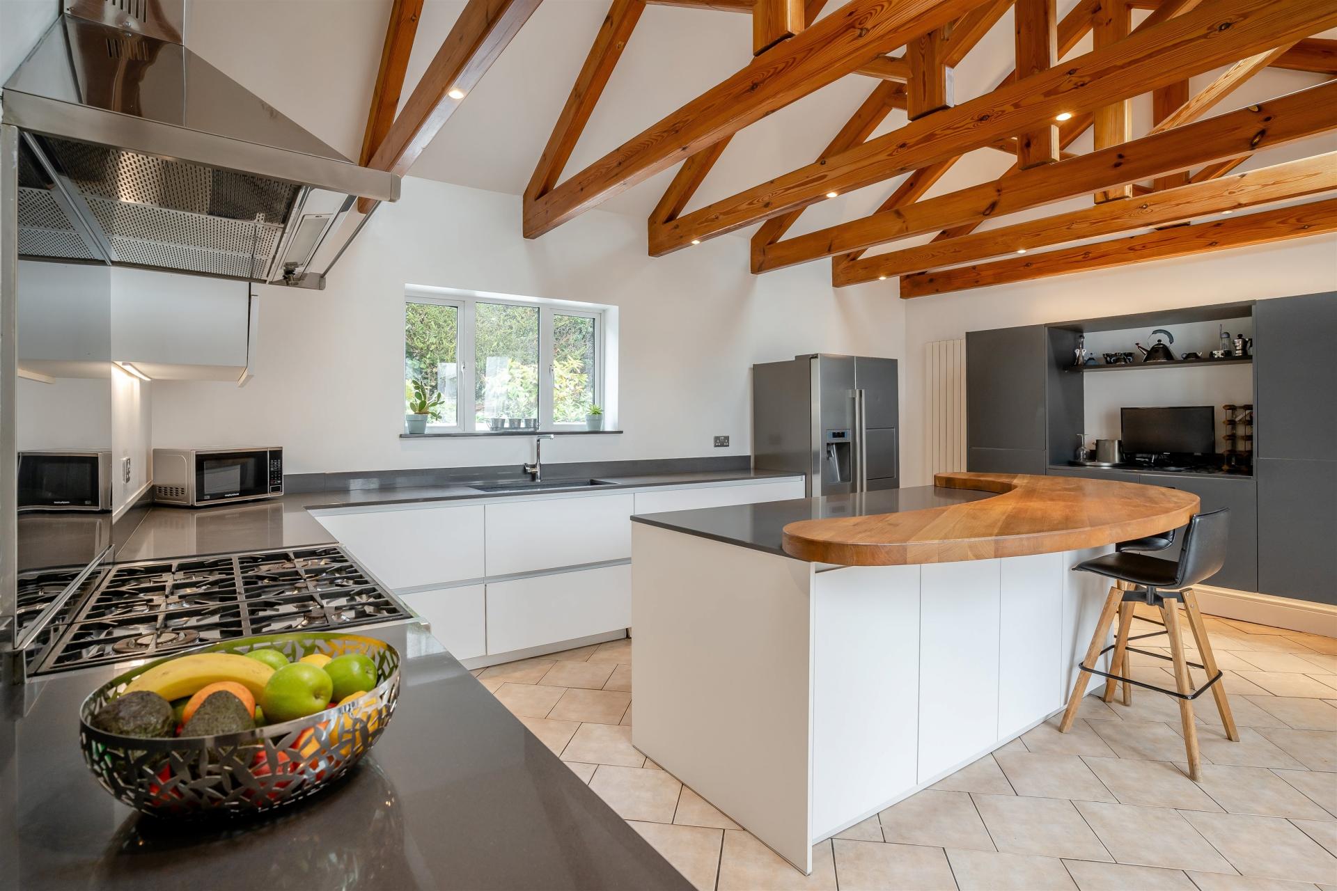 As you enter the property, you are greeted by a sizeable entrance hall leading off with three receptions rooms. The first of which being a snug/ office area, perfect for families or people who work from home. The second and third is a beautiful formal living and dining area, with the same breath-taking views as well as a log burner. As you enter the family room to the rear of the property this could be used as a second snug or study space. This then leads to a large fitted kitchen. Featuring a stunning centre island, as well as wooden beams creating a modern but rustic feel, this is a stand out feature.