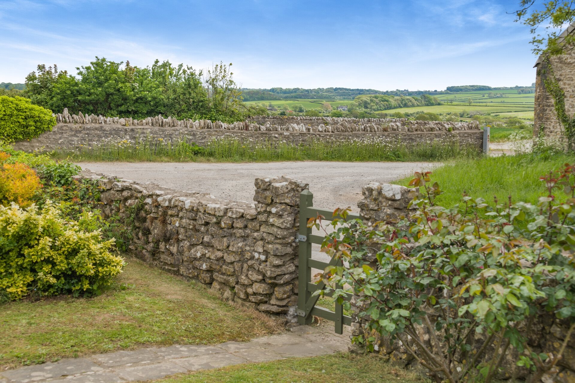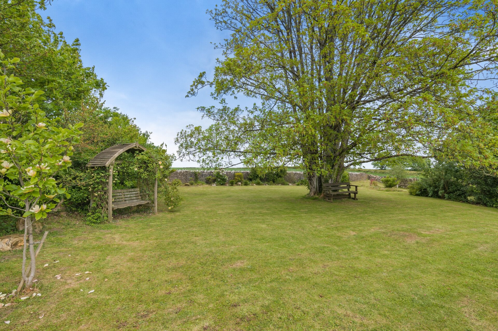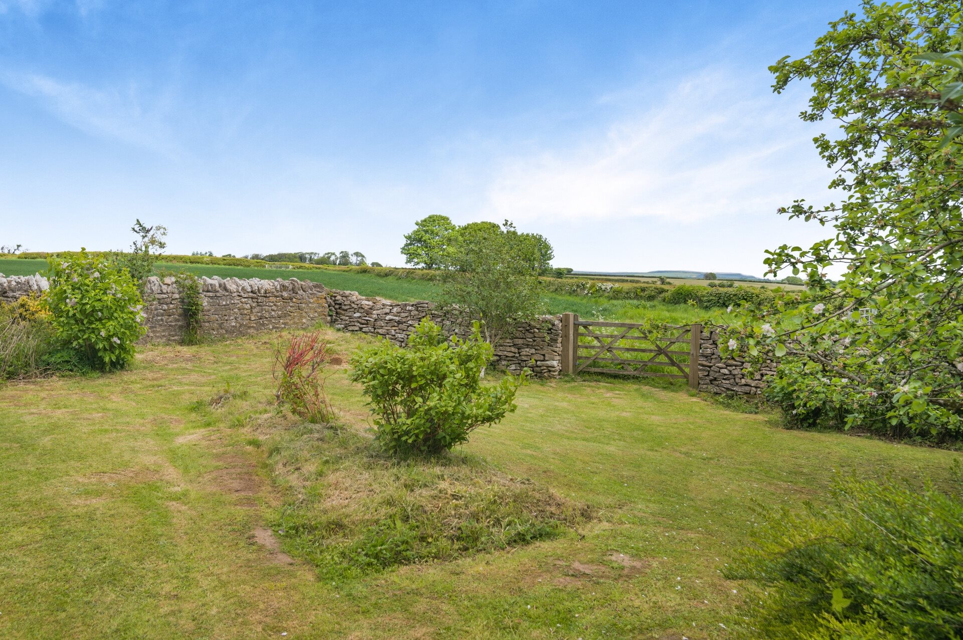 - Beautiful large garden with greenhouse, fruit trees, and countryside backdrop