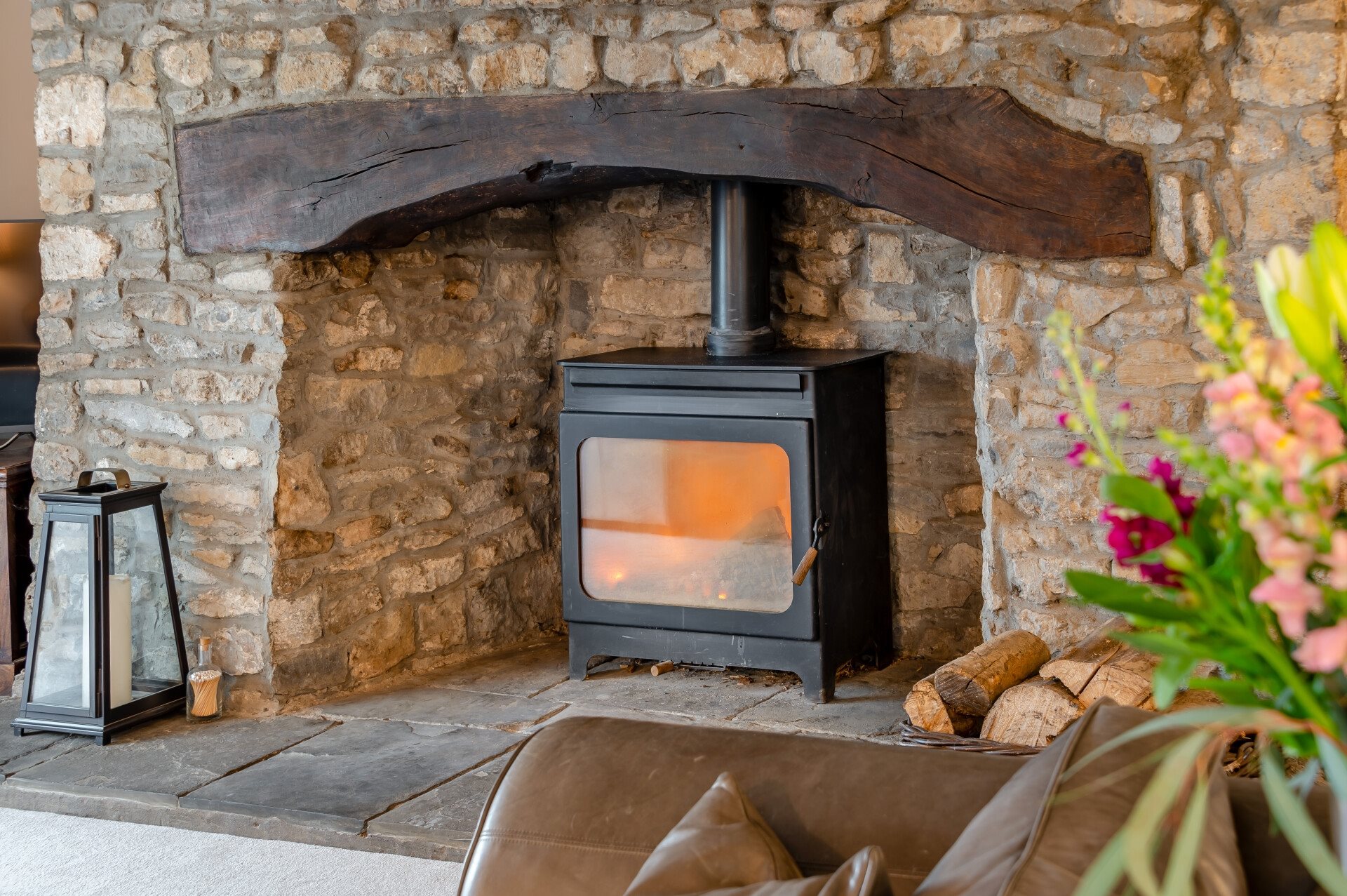 The layout flows around a central galleried landing, connecting the key living spaces. The lounge is a standout room, particularly during the festive season, with its exposed stone chimney breast, wood-burning stove, and bay window that brings in wonderful light.